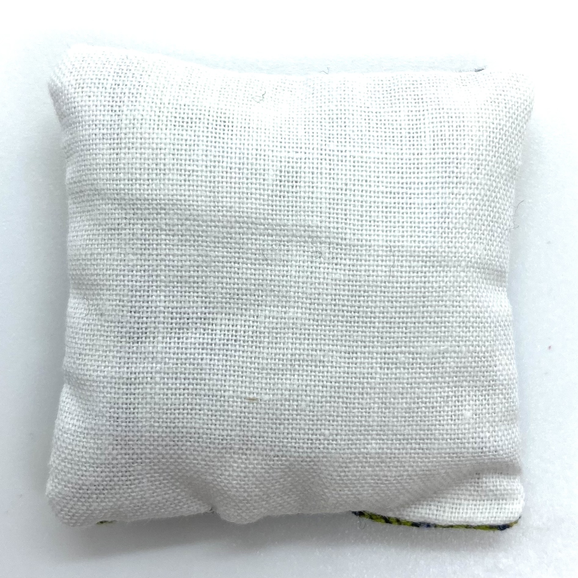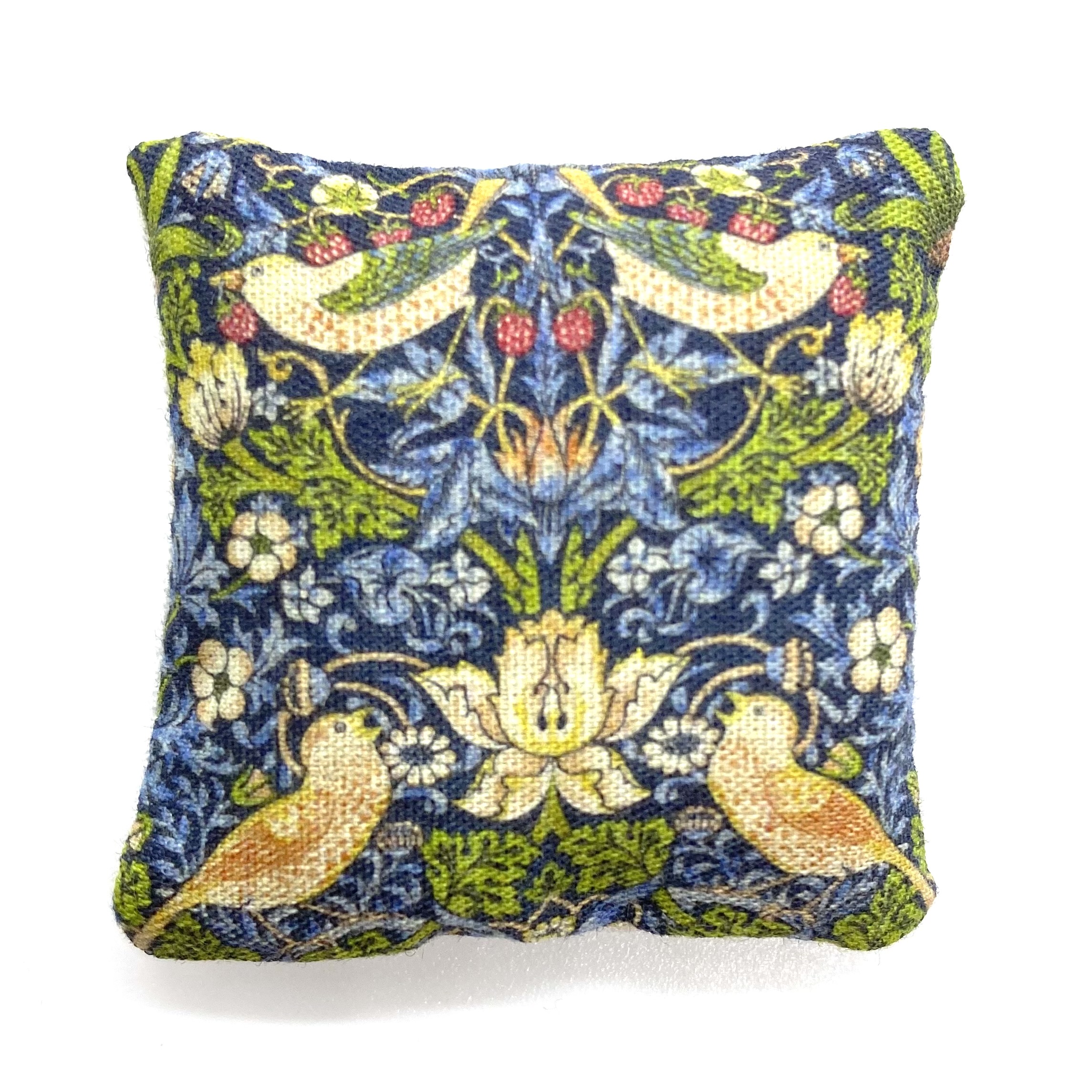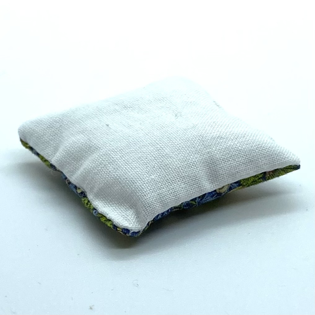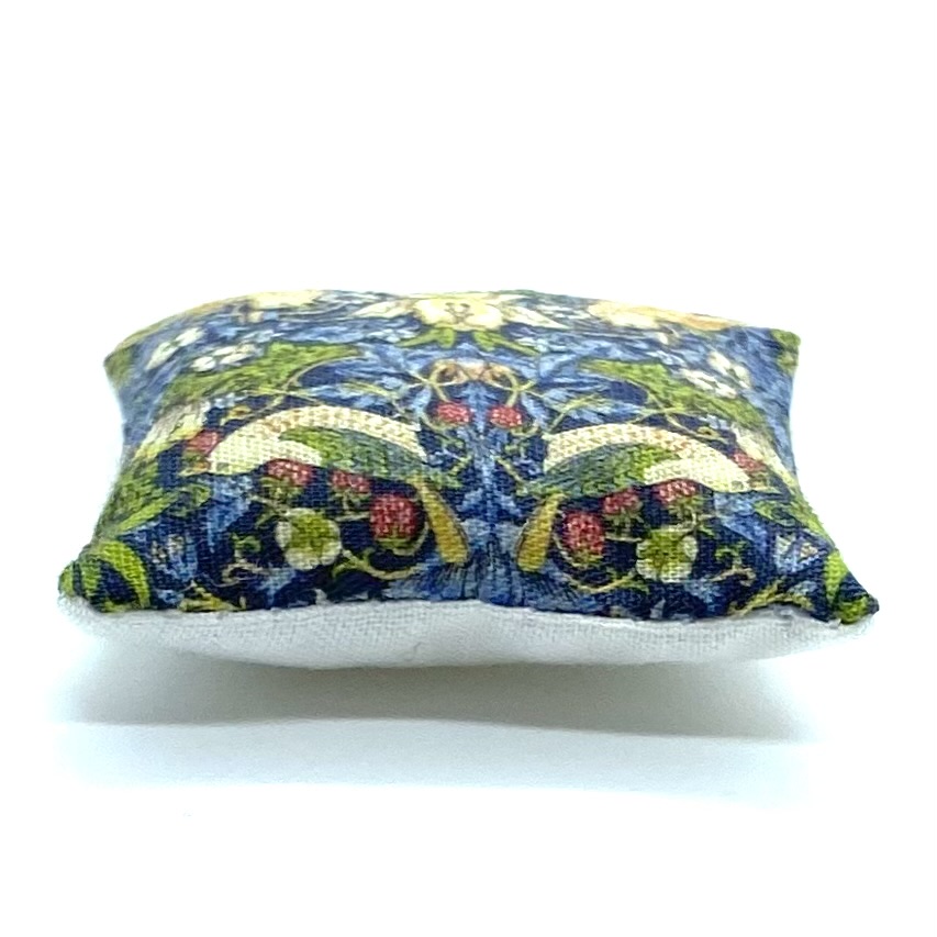 One of three cushions that I bought from Canis Minor Miniatures with motifs from William Morris designs. It wouldn’t be a late Victorian house without at least a nod to The Strawberry Thief. The Quartermaines are sympathetic to the Arts and Crafts movement and, although they have maintained the grandeur of their main reception rooms, their private rooms are full of Morris fabric and studio pottery. These cushions are found either in the Master Bedroom or Parlour, where they soften the dark heavy wood of the furniture.