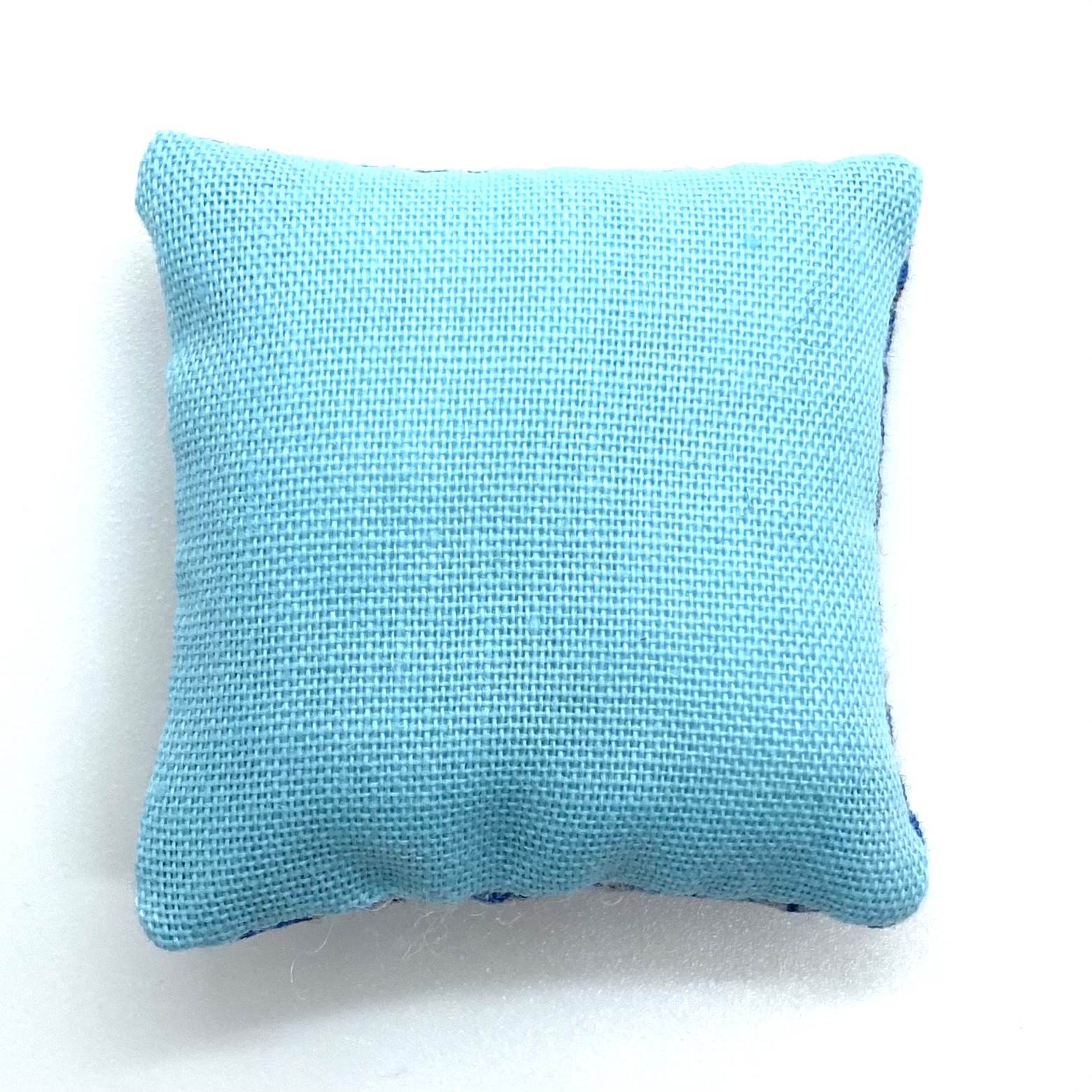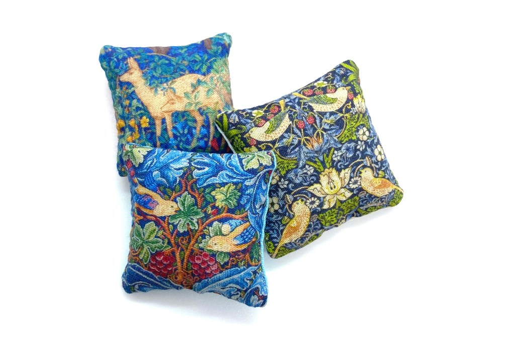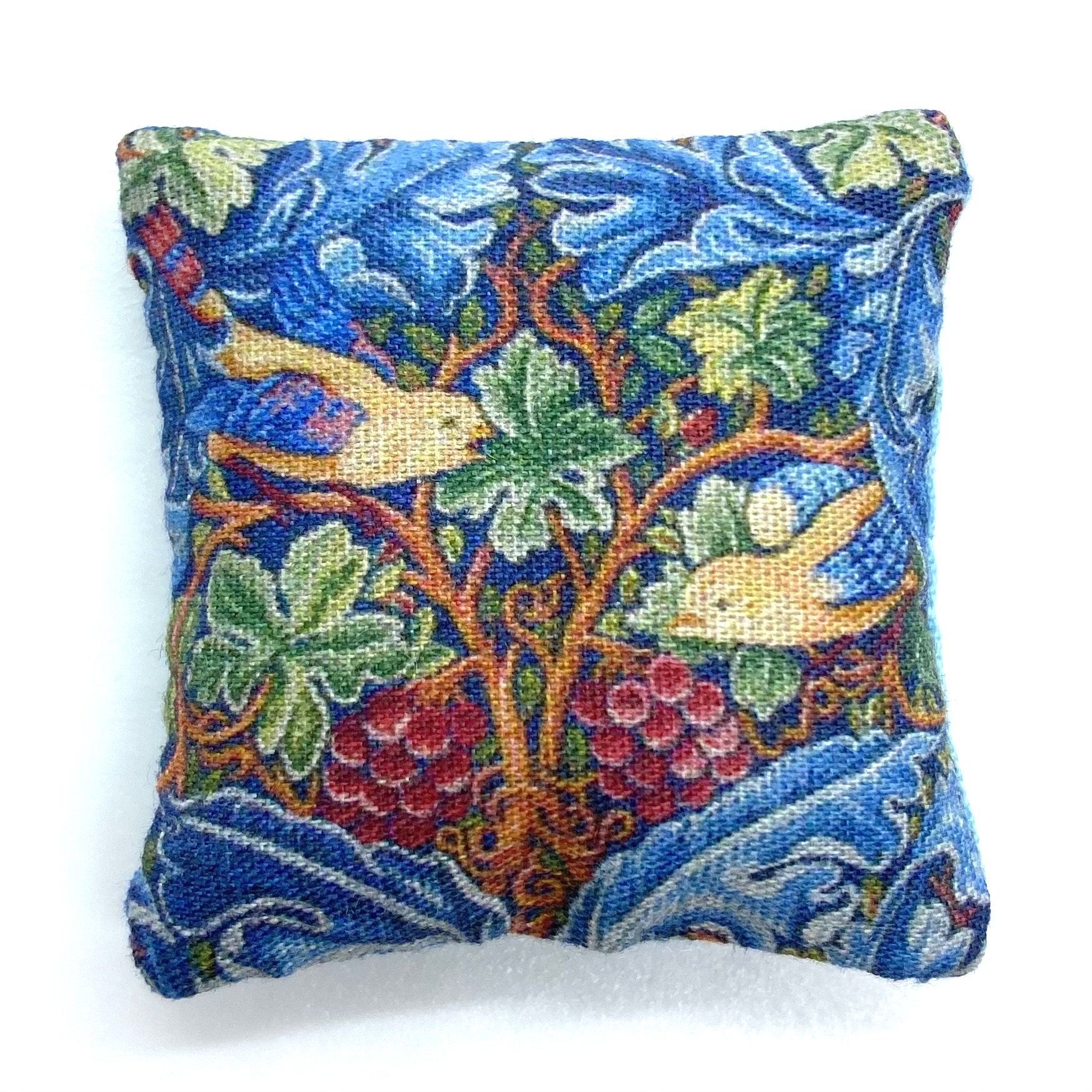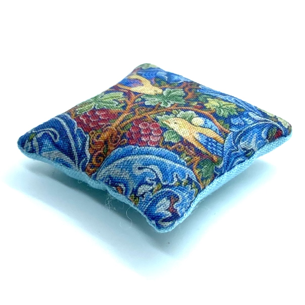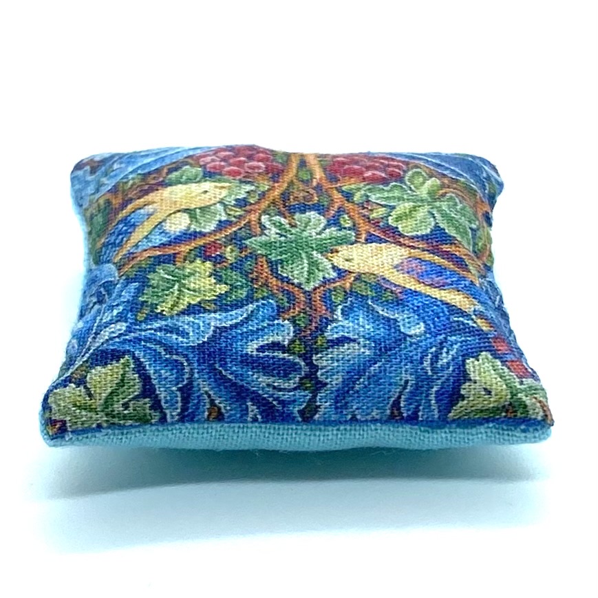 One of three cushions that I bought from Canis Minor Miniatures with motifs from William Morris designs. The Quartermaines are sympathetic to the Arts and Crafts movement and, although they have maintained the grandeur of their main reception rooms, their private rooms are full of Morris fabric and studio pottery. These cushions are found either in the Master Bedroom or the Parlour, where they soften the dark heavy wood of the furniture.
