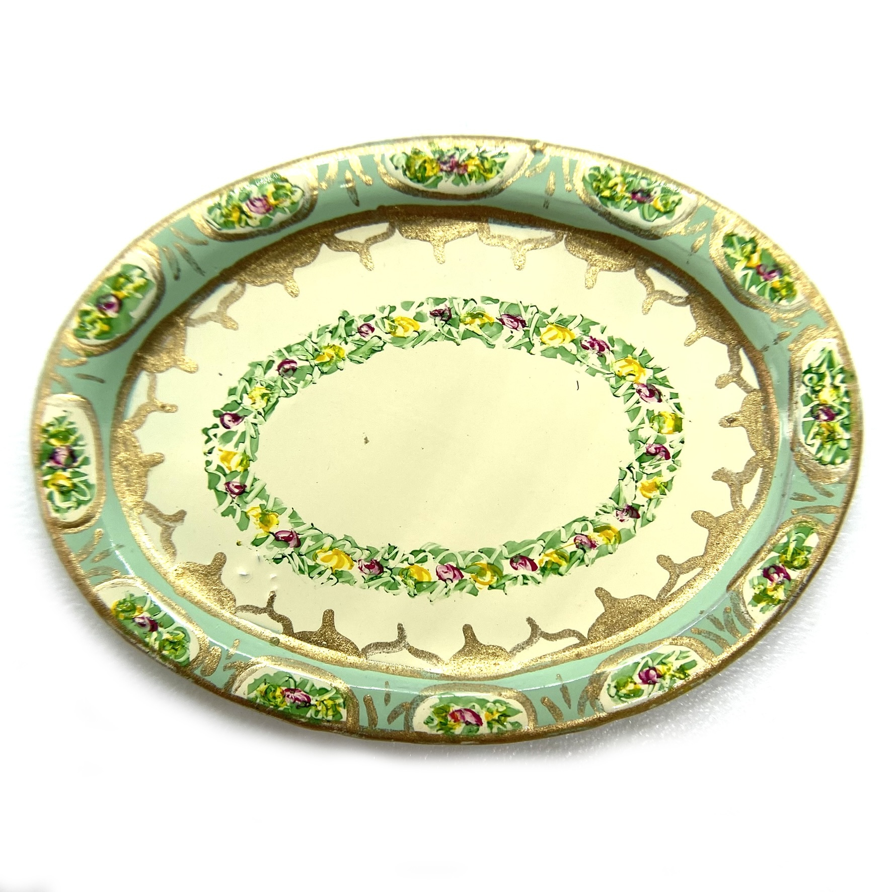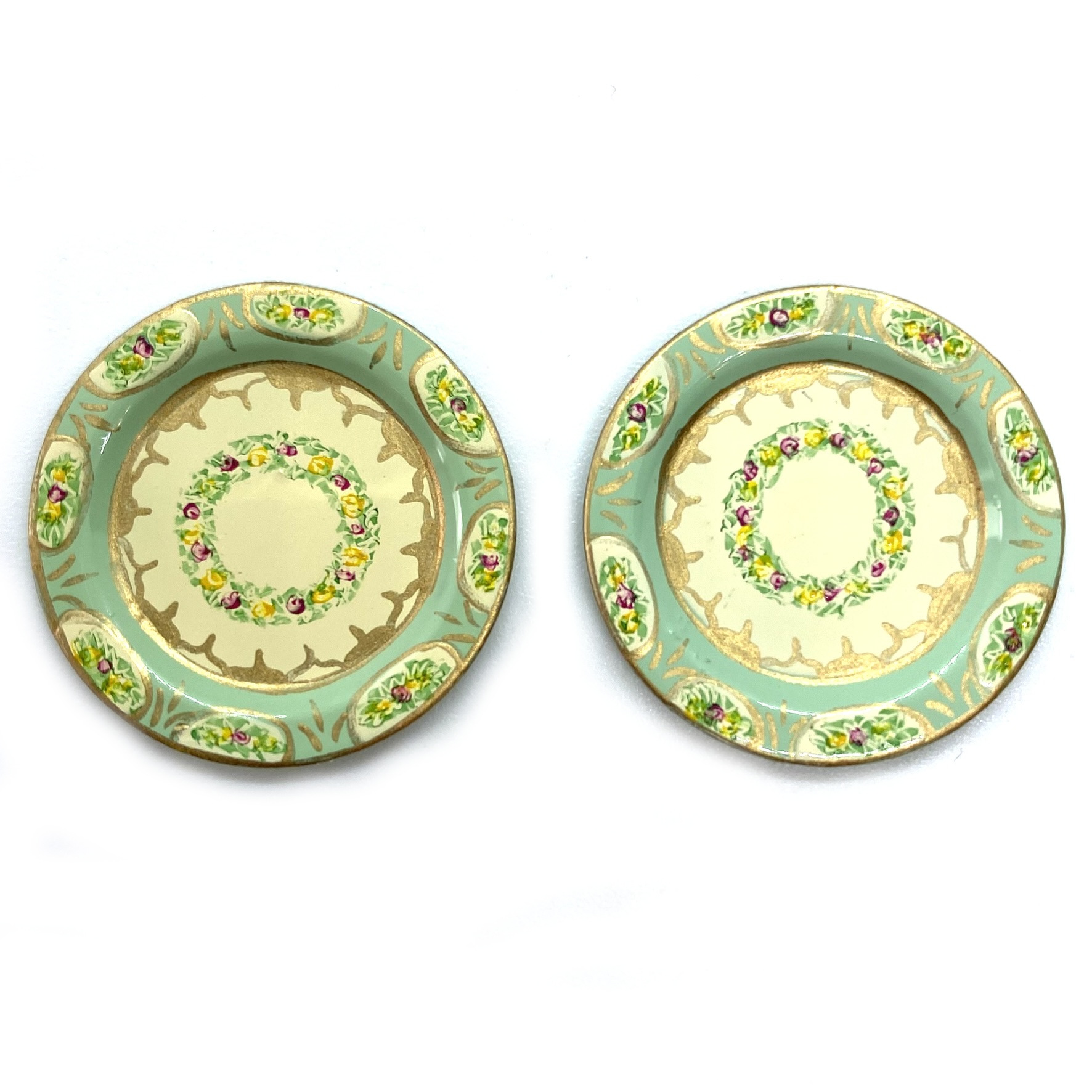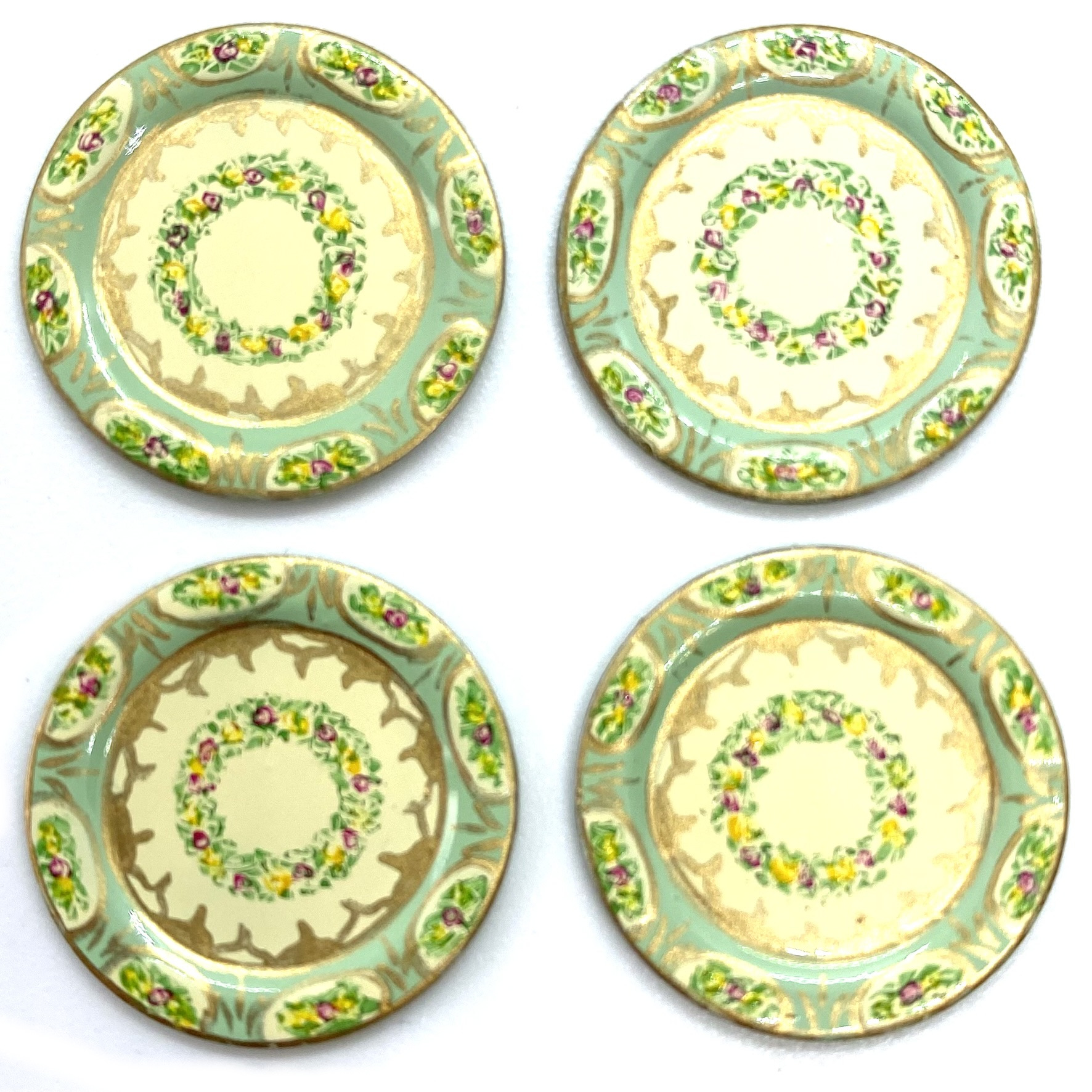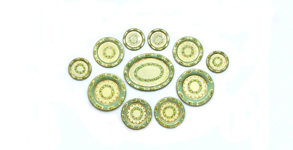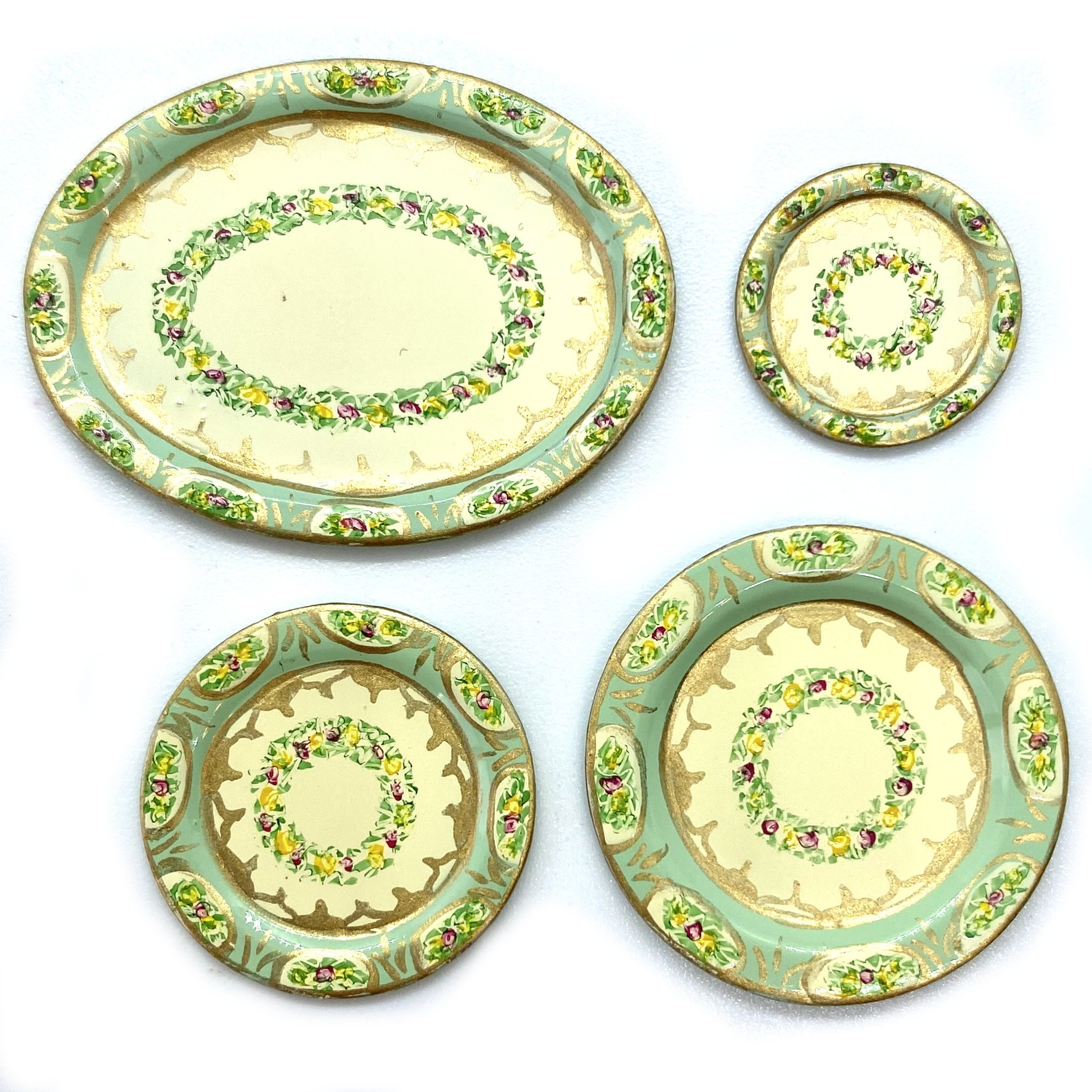 This set, painted in a lovely light green, comprises an oval serving platter, two large serving plates, four dinner plates and four side plates.