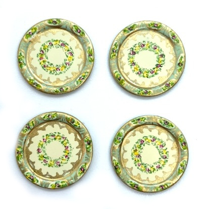 Dimensions: 26 x 35 mm. / 1 x 1 ⅜ inches (height x width) (oval platter); 25 mm. / 1 inch (diameter) (2 x serving plates); 20 mm. / ⅞ inches (diameter) (4 x dinner plates); 15 mm. / ⅝ inches (diameter) (4 x side plates)