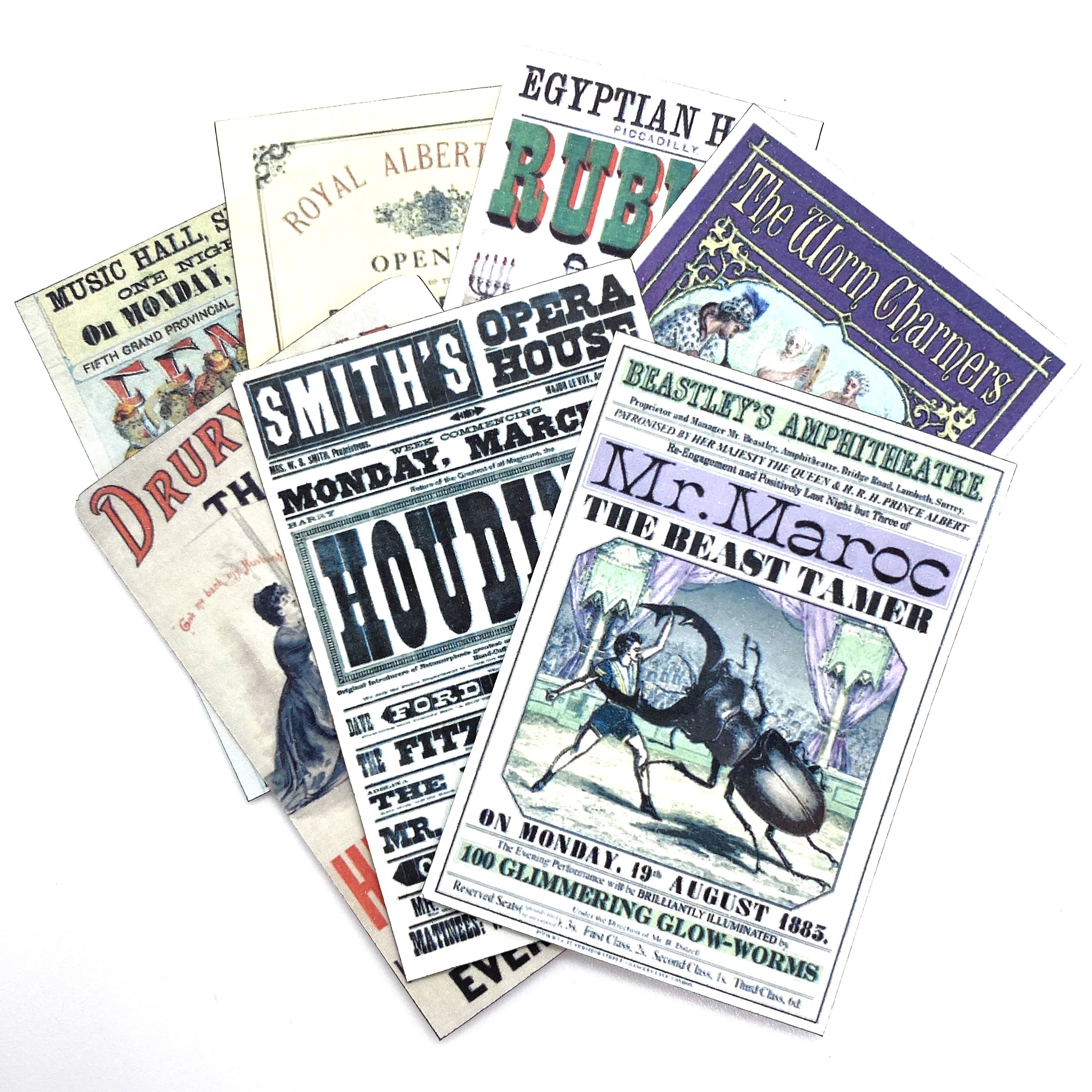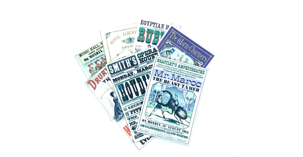 The servants at Quartermaine Hall like nothing better than to go up to London on their days off, and a visit to the theatre or music hall is a rare treat. This set of posters records some of their favourite events (some of which may not be all that historically authentic). Some are lying around in the servants’ hall while the more sensational events, of which the butler would doubtless disapprove, are stuck to the wall in the maids’ bedroom or passed surreptitiously from hand to hand among the footmen. The butler himself has preserved a poster from the opening of the Royal Albert Hall, not because he was able to go himself, but as a mark of respect for the Queen, and it hangs alongside Victoria’s portrait in his pantry. The housekeeper, in the privacy of her bedroom, has kept a more personal memento: a poster of a colourful show she saw in Shrewsbury with her beau as a young woman, just before going into service.