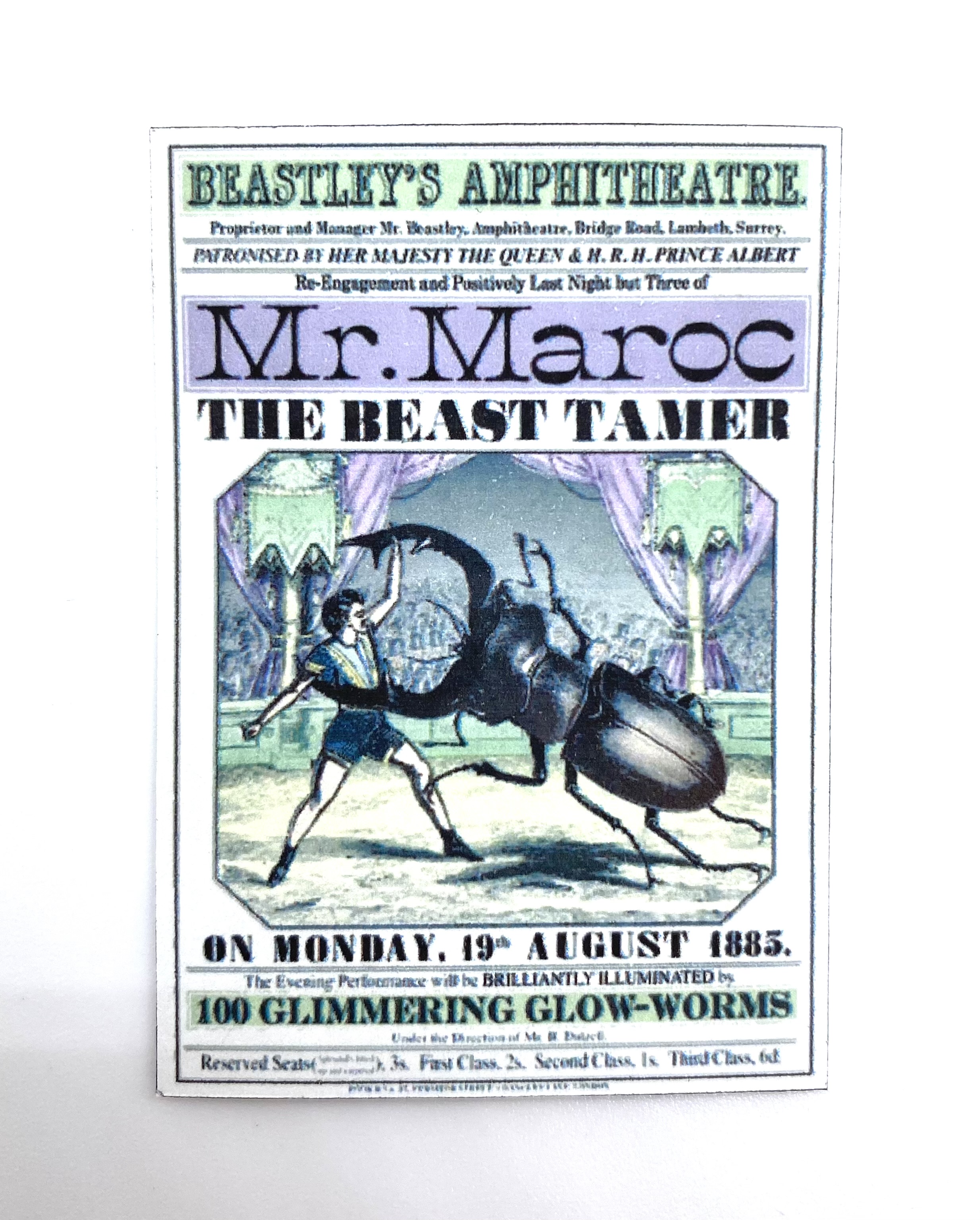 - Mr Maroc, The Beast Tamer, at Beastley’s Amphitheatre on 19 August 1885 (‘The exciting performance will be BRILLIANTLY ILLUMINATED by 100 GLIMMERING GLOW-WORMS’). I can’t help suspecting that this poster might be a modern pastiche, as the only record I can find of Beastley’s (evidently a pun on the famous Astley’s Amphitheatre) or Mr Maroc is on pages linked to The Insect Circus.