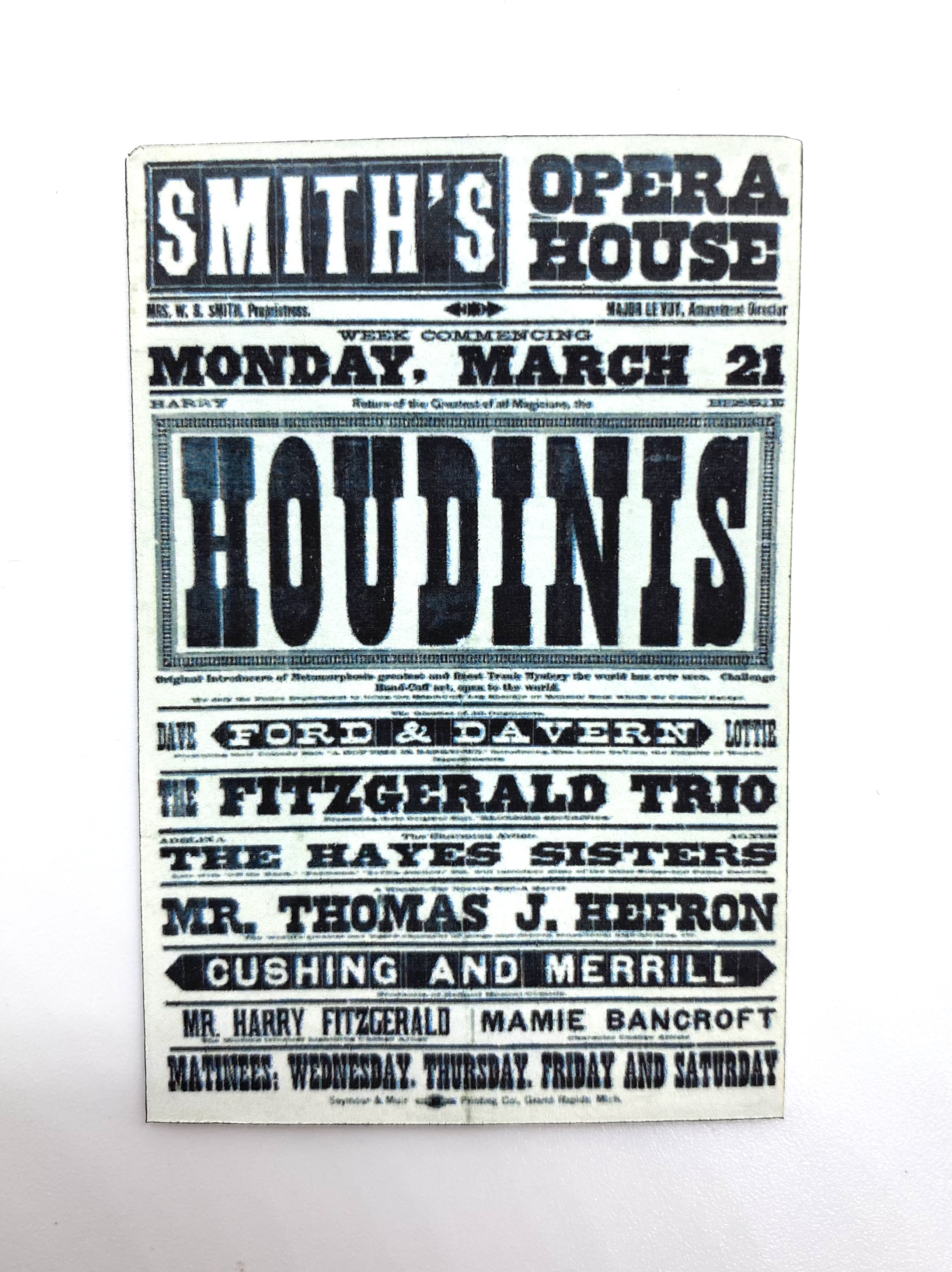 - Houdini at Smith’s Opera House. This probably won’t end up on display as Smith’s Opera House is actually in Geneva, Ontario County, New York. It was first opened in 1894, and Harry Houdini appeared there in 1898 (when 21 March was indeed a Monday).