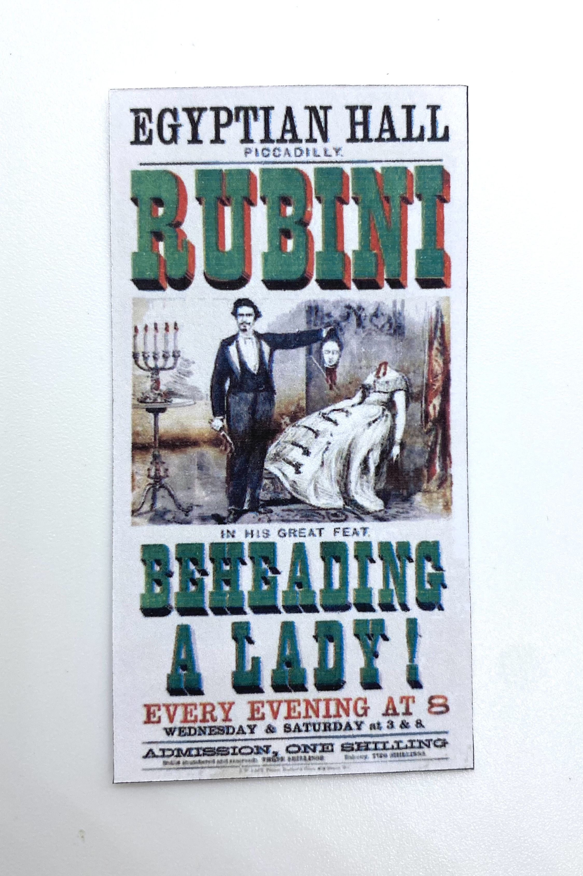 - Rubini Beheading a Lady! This really did happen (well, one hopes that the beheading didn’t, if only for the sake of the lady who endured it ‘every evening at 8’). Disappointingly, but perhaps inevitably, the grandly named Signor Rubini was not Italian, but in fact was born Philip Prentice Anderson (1844-1920), the son of a Scottish magician. He performed this act in 1867 although, as the date isn’t shown on the poster, I think we can get away with including it as a ‘current event’. Needless to say, something as sensational as this would be kept out of the butler’s sight, probably pinned up in the maids’ room as they discuss Rubini’s magnificent feat in awed whispers.