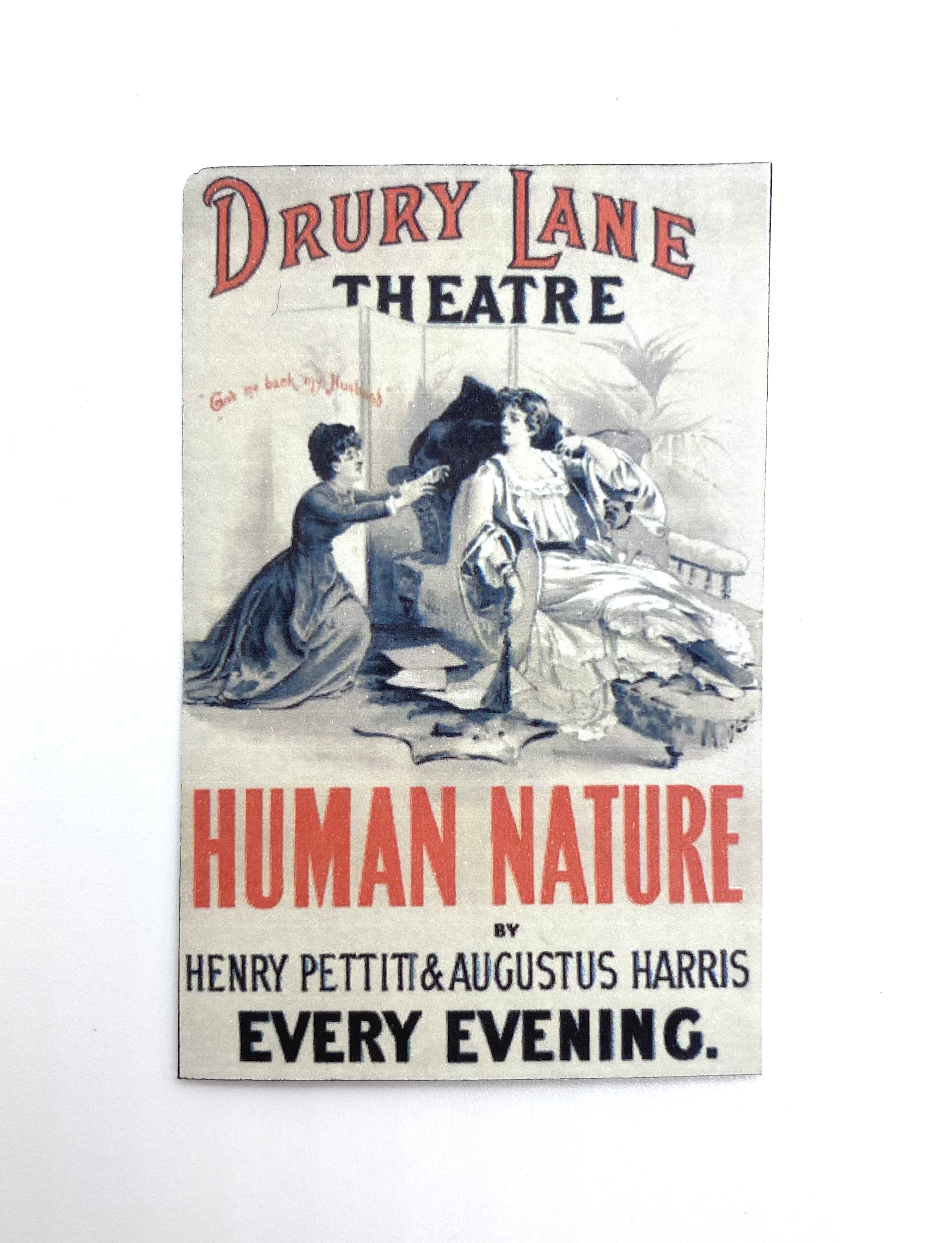 - Human Nature by Henry Pettitt and Augustus Harris, every evening at Drury Lane Theatre. The play was first produced on 12 September 1885, recently enough for us to pretend that it’s current for Quartermaine Hall. The virtuous Mrs Temple takes in her old school-friend Cora while Captain Temple is away at the wars, unaware that Cora has lived a wicked life and, in fact, was Captain Temple’s former mistress. Seeking revenge, Cora falsely accuses Mrs Temple of adultery and has her child taken from her; but in the final act Captain Temple realises the truth, throws Cora out, and is reunited with his long-suffering but faithful wife. Despite the melodramatic poster, the play has an appropriately moral message and so neither the butler nor housekeeper can find fault with it.