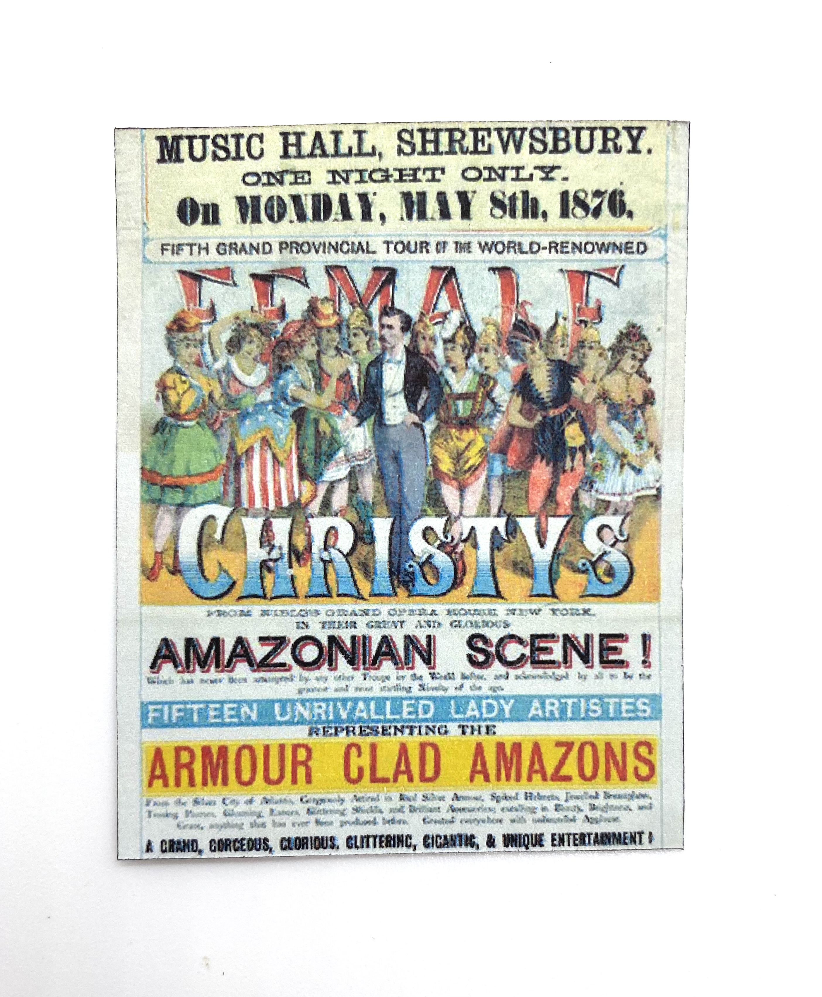 - Female Christy’s Amazonian Scene! Mythological glamour came to Shrewsbury Music Hall on 8 May 1876, and the housekeeper still cherishes the memory of the event: the final time she walked out with her beau before family circumstances forced her into service. This poster comes from the fifth ‘grand provincial tour’ of this ‘world-renowned’ troupe, featuring ‘fifteen unrivalled lady artistes representing the armour clad Amazons’. (The troupe had been reduced to twelve unrivalled lady artistes by 1882, when they performed in South Shields Public Library Hall as part of their eighth tour.) The publicity from the South Wales Daily News of 17 October 1877 gives some idea of the impact of the performance: