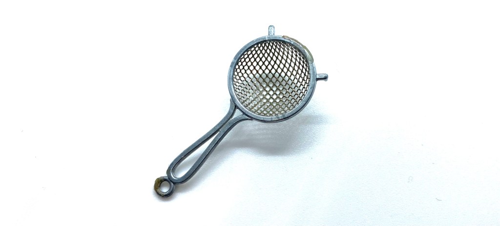 Functional objects are just as important as works of art in bringing a house to life; more so, in fact. You don’t believe in a home until you get a sense of the everyday pragmatic items, dotted here and there, which help to keep the place running. This sieve was made by the famous German firm Bodo Hennig, one of the leading mass manufacturers of miniatures, which specialises in kitchen and laundry items.