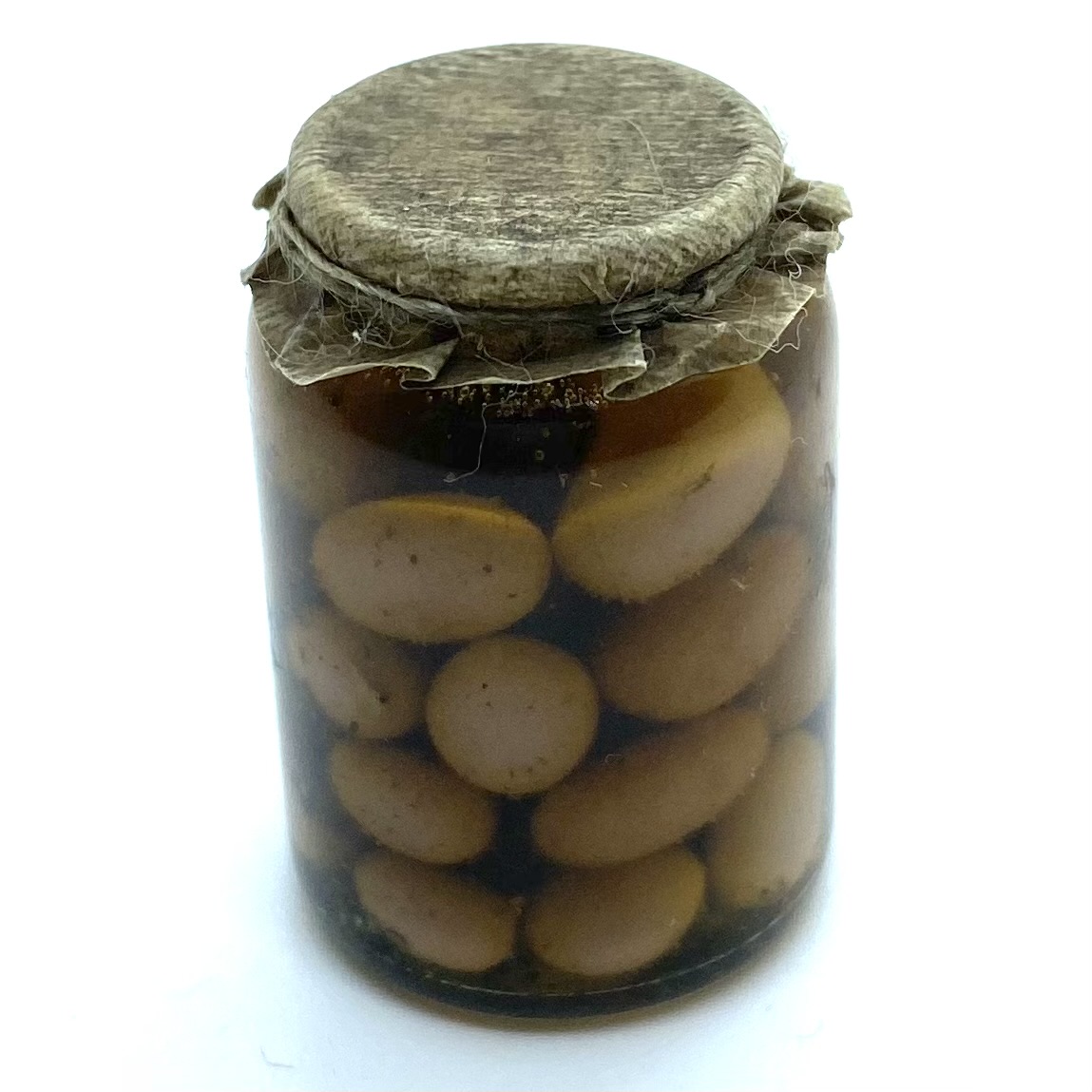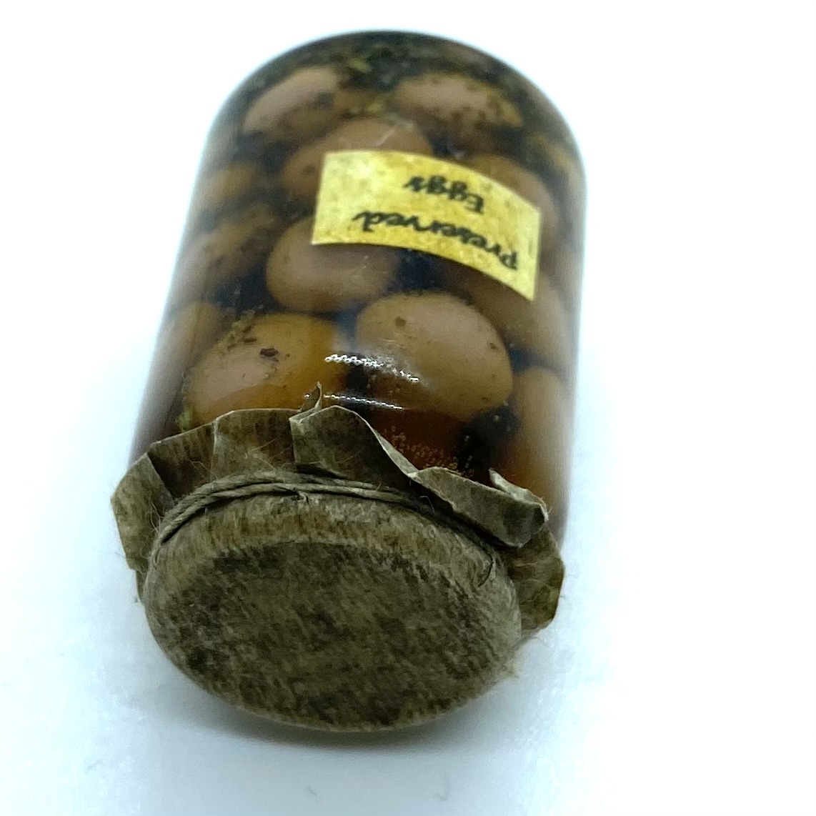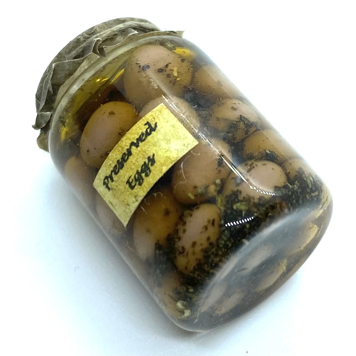 Like its companion piece (a jar of pickled eggs), I bought this glass jar of preserved eggs at my very first Kensington Dolls House Festival. But I can’t remember the maker’s name and, as I explain in my entry for the pickled eggs, I’d be enormously grateful if anyone can tell me who made these wonderful little pieces for the pantry.