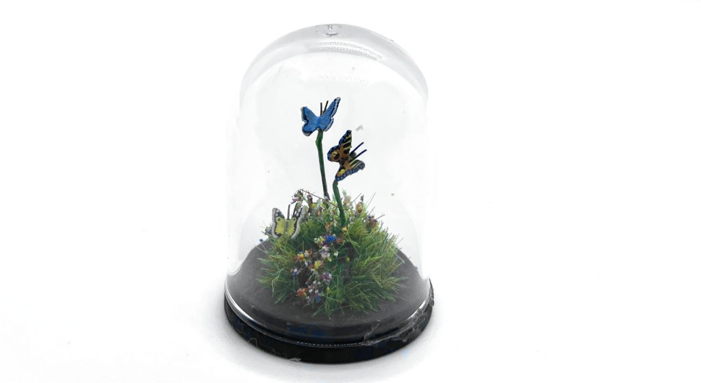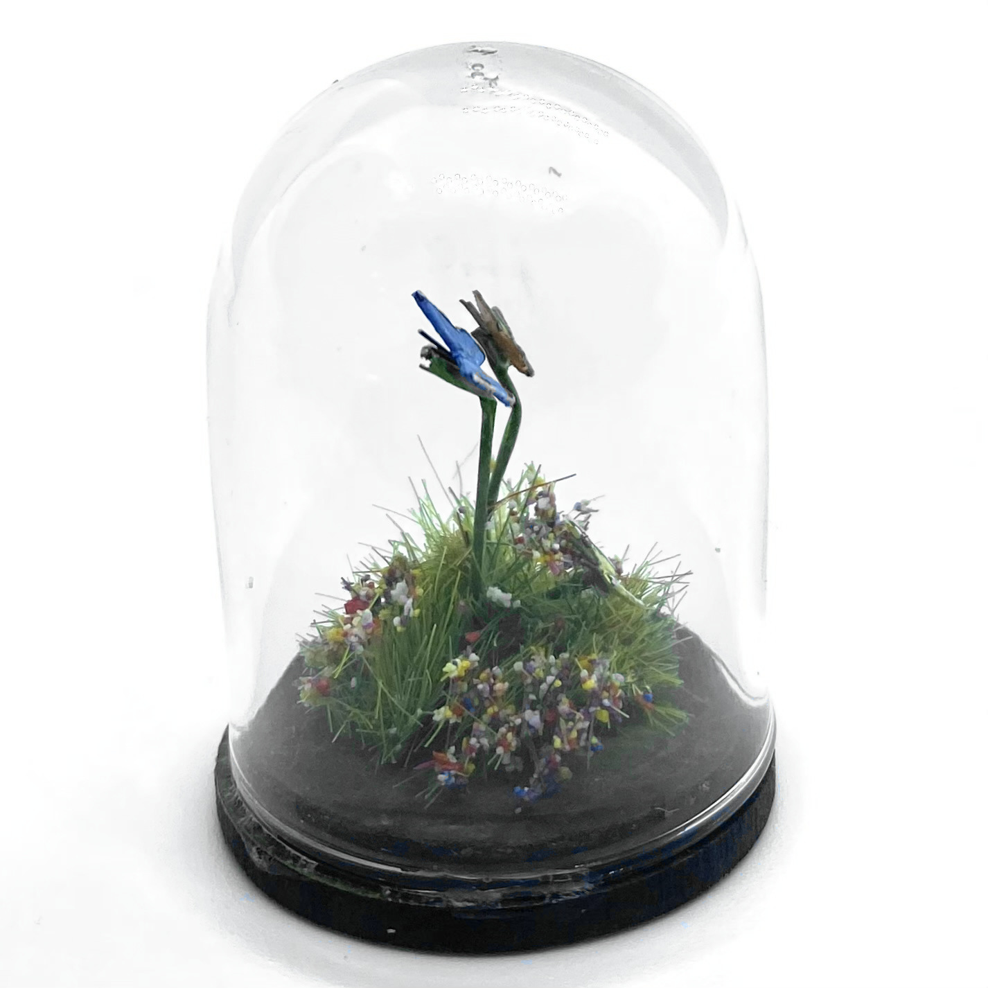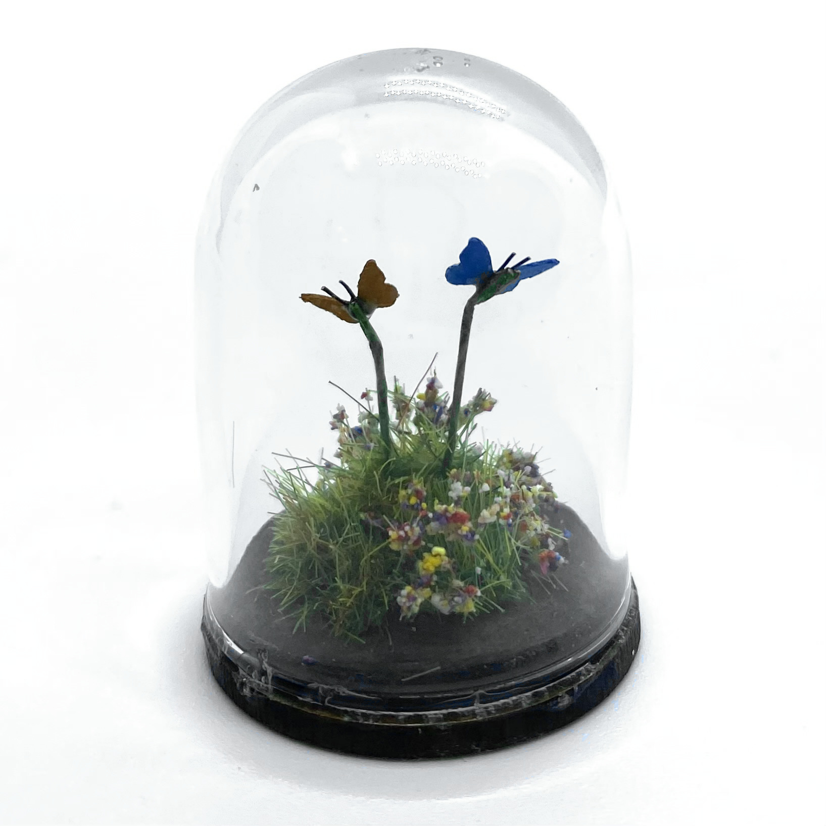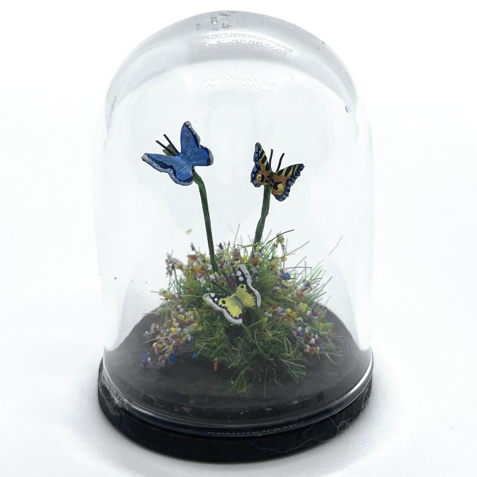 This natural history display is by the amazingly talented Laura Brownhill of Country Treasures. It shows three butterflies – a common blue, a tortoiseshell and a clouded yellow – poised over a tussock of grass and wildflowers. I bought it from Laura’s stand at Miniatura in October 2021, hard-pressed to choose between the different arrangements of butterflies. She has even gone to the trouble of identifying the butterflies on the bottom, for which I was grateful, as I’m no naturalist. The label on the base also bears her signature ‘Laura Brownhill’ and the date 2021. It was originally bought for the Parlour, but has mysteriously found its way into Felix’s room, one of his prized possessions, which inspires him in his own butterfly collecting.
