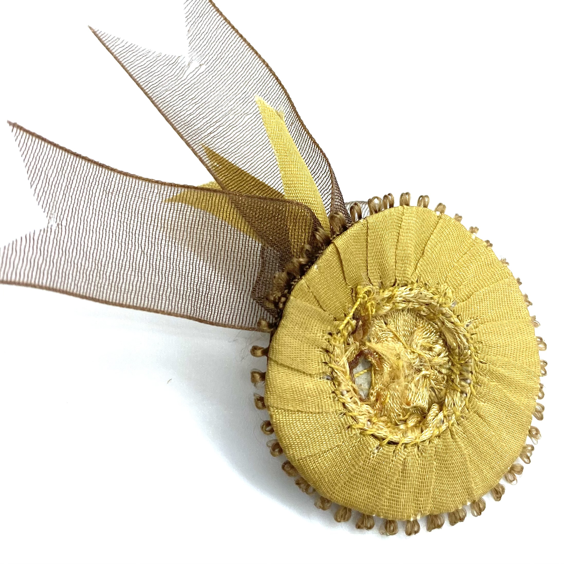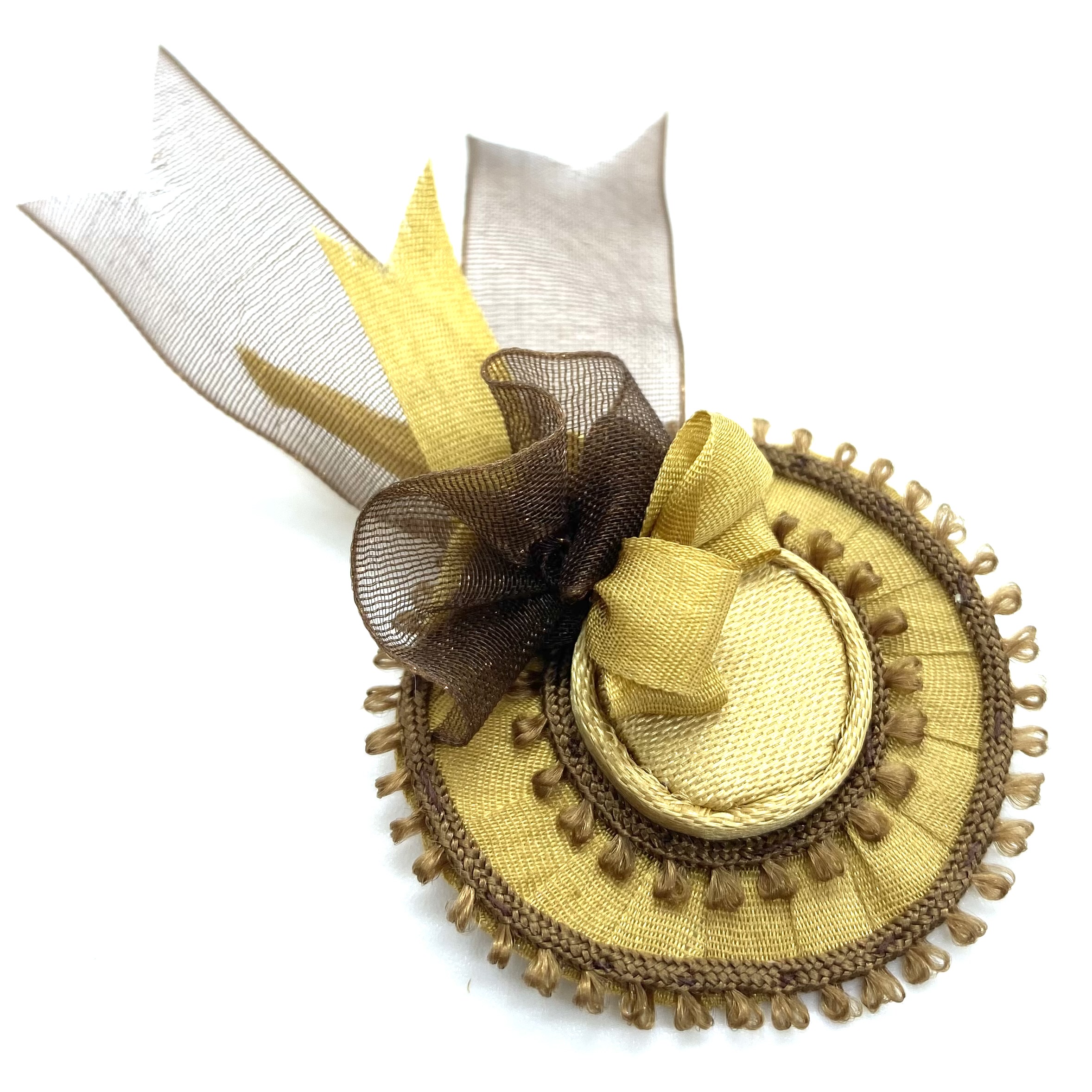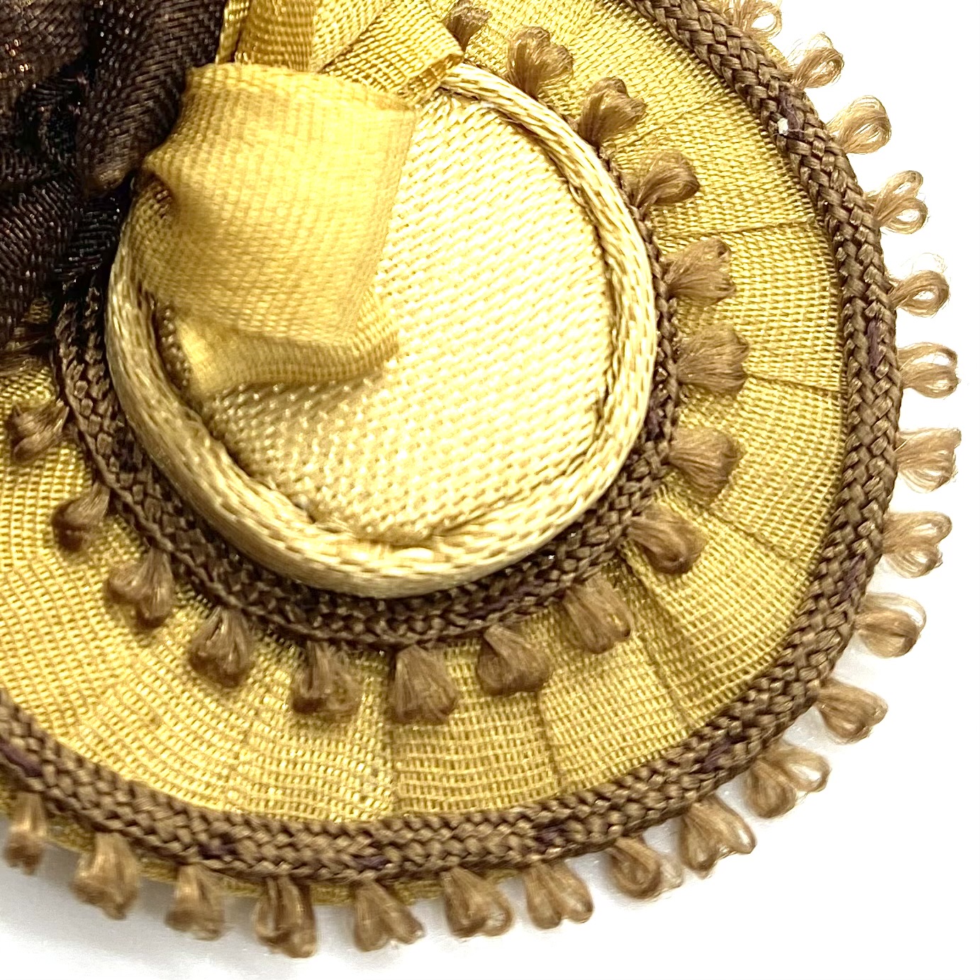 By happy coincidence, our first Miniatura in October 2021 was also the first for the Miniature Hat Boutique. This beautiful hat caught my eye thanks to its colouring, with the antique gold trimmed with bronze braid and ribbons, and the care that has gone into every detail, from the pleats to the little decorative knots of thread around the brim.