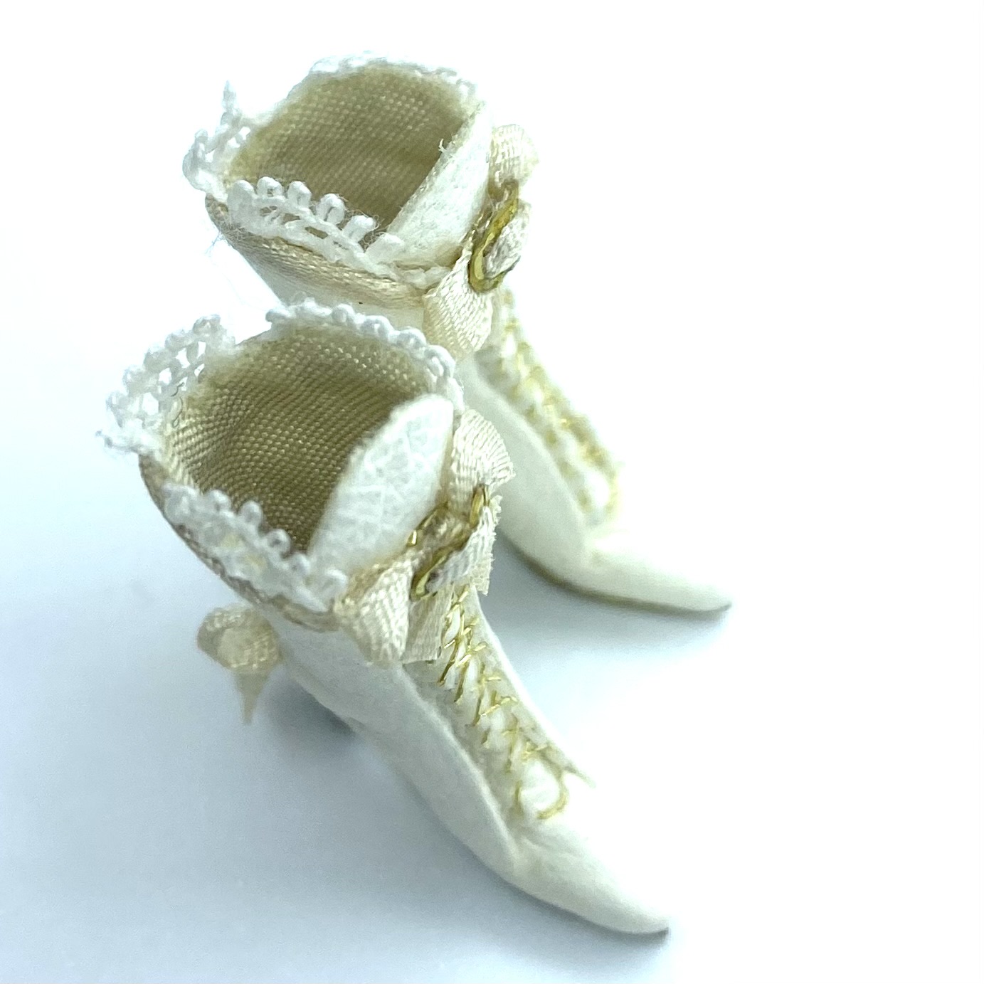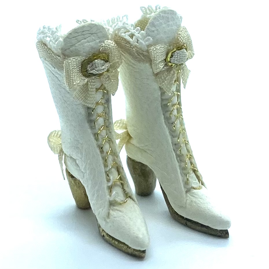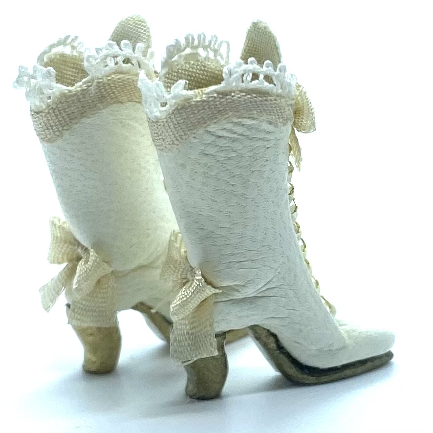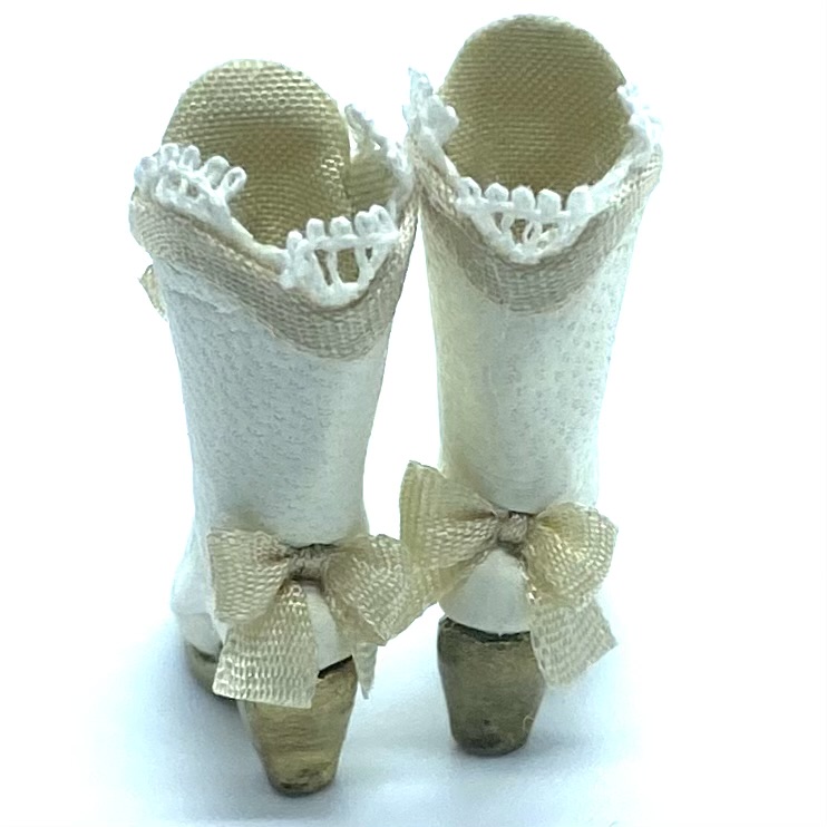 This pair of elegant white leather bridal boots was part of my first purchase from Perri Edwards at Miniatura in October 2021. I was attracted by the unbelievable finesse of the craftsmanship, with very fine white leather set off with ruffles, laces and bows. Beautiful. Isabella, the eldest daughter of the family, is soon to be married and is accumulating her trousseau, among which I’m sure these will be a highlight.