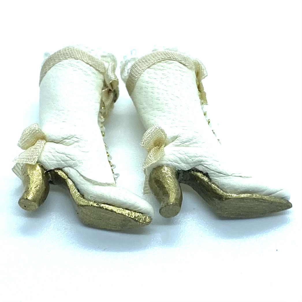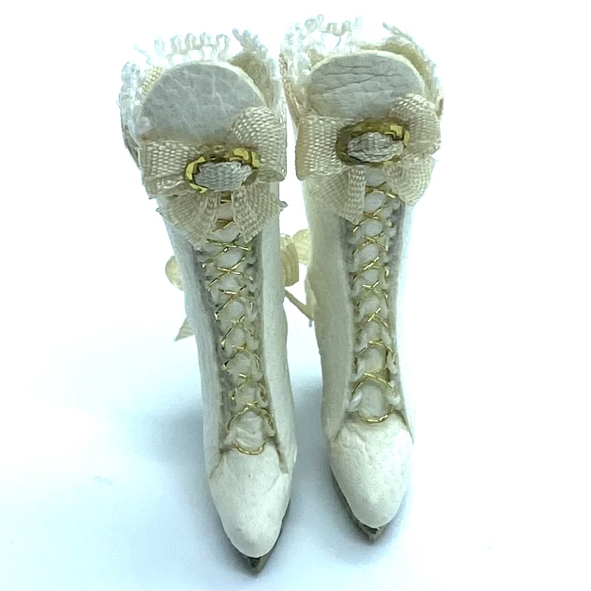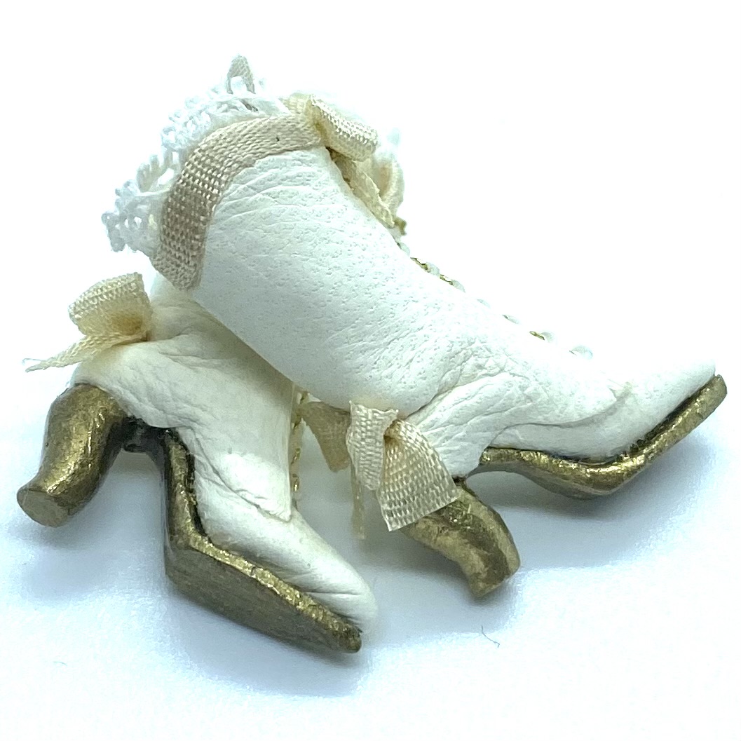 This pair of elegant white leather bridal boots was part of my first purchase from Perri Edwards at Miniatura in October 2021. I was attracted by the unbelievable finesse of the craftsmanship, with very fine white leather set off with ruffles, laces and bows. Beautiful. Isabella, the eldest daughter of the family, is soon to be married and is accumulating her trousseau, among which I’m sure these will be a highlight.