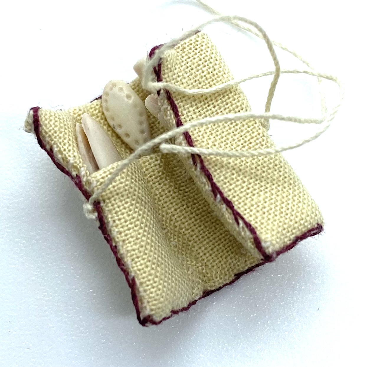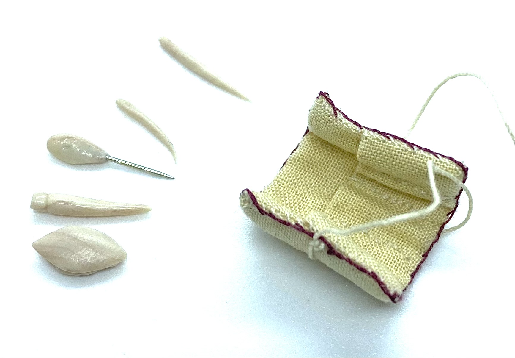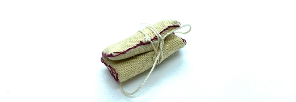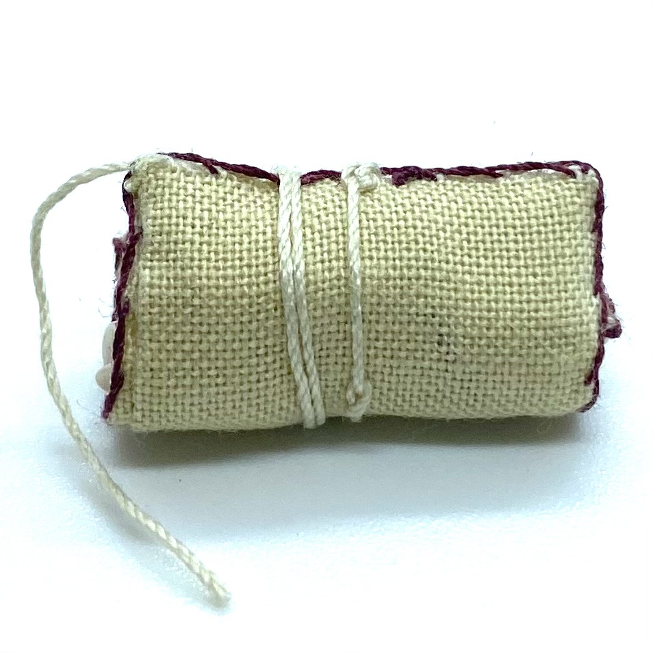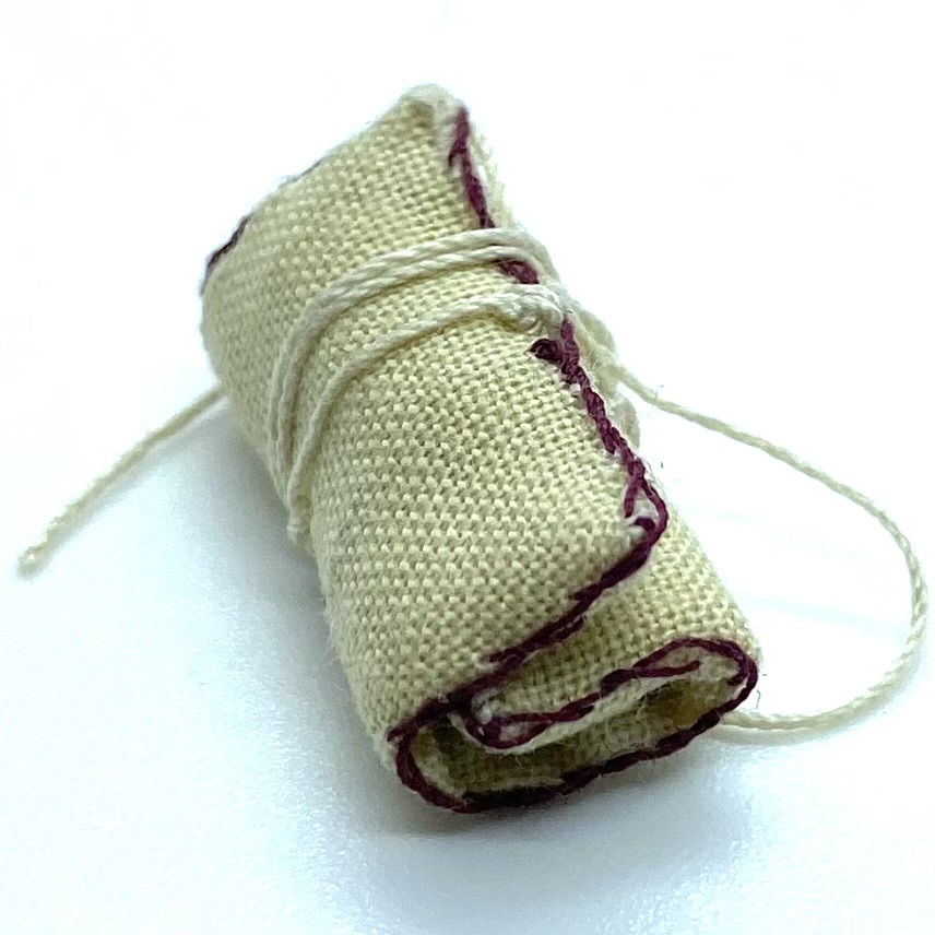 A huswif is a sewing set rolled up in a fabric holder. This example in plain linen, and filled with bone accessories, is the cherished possession of one of the maids, who works the Sewing Room. Its inner pockets contain needles, a shuttle, a bodkin and other goodies which I am too unhandy to identify. We also have a patterned huswif, also made by Jennifer Pauls, which is elegant enough for the lady of the house to use in the Parlour.