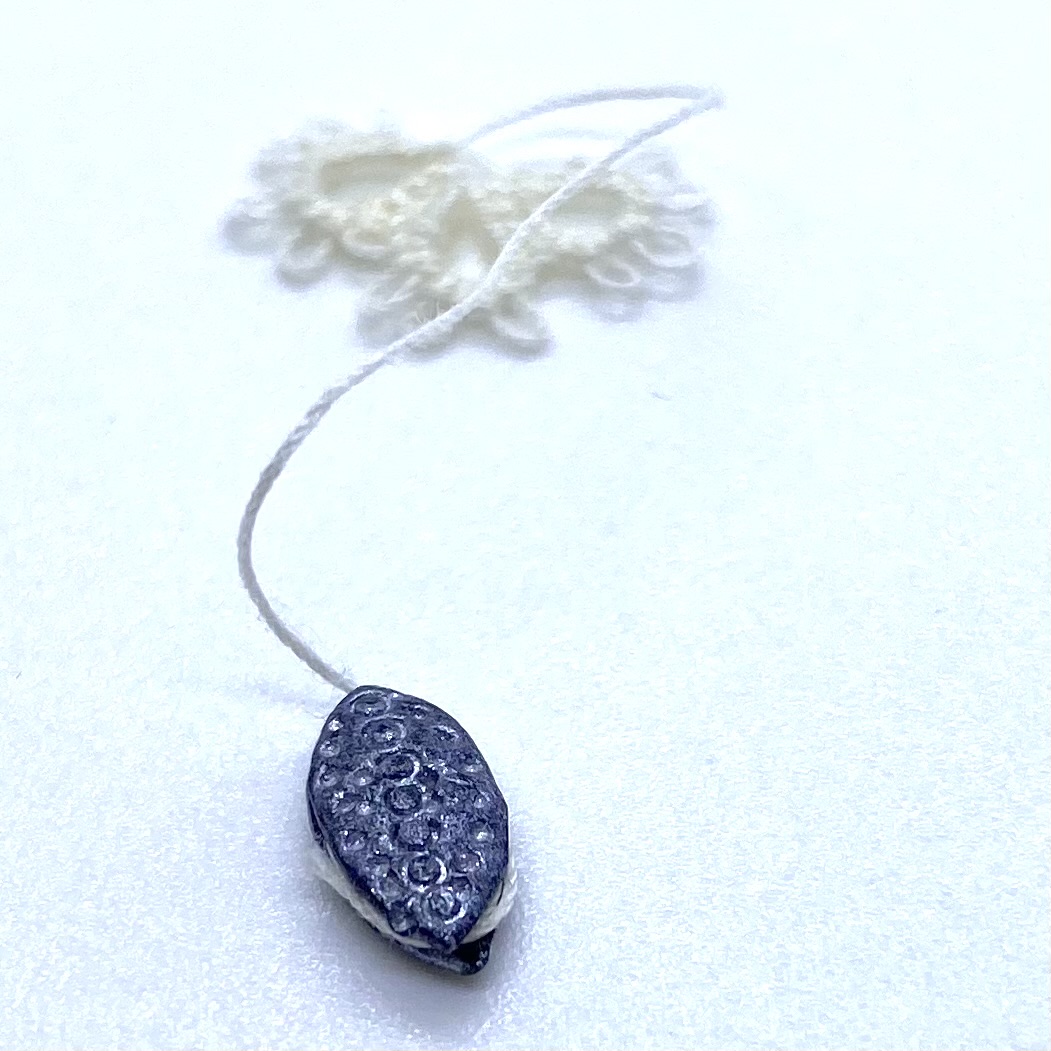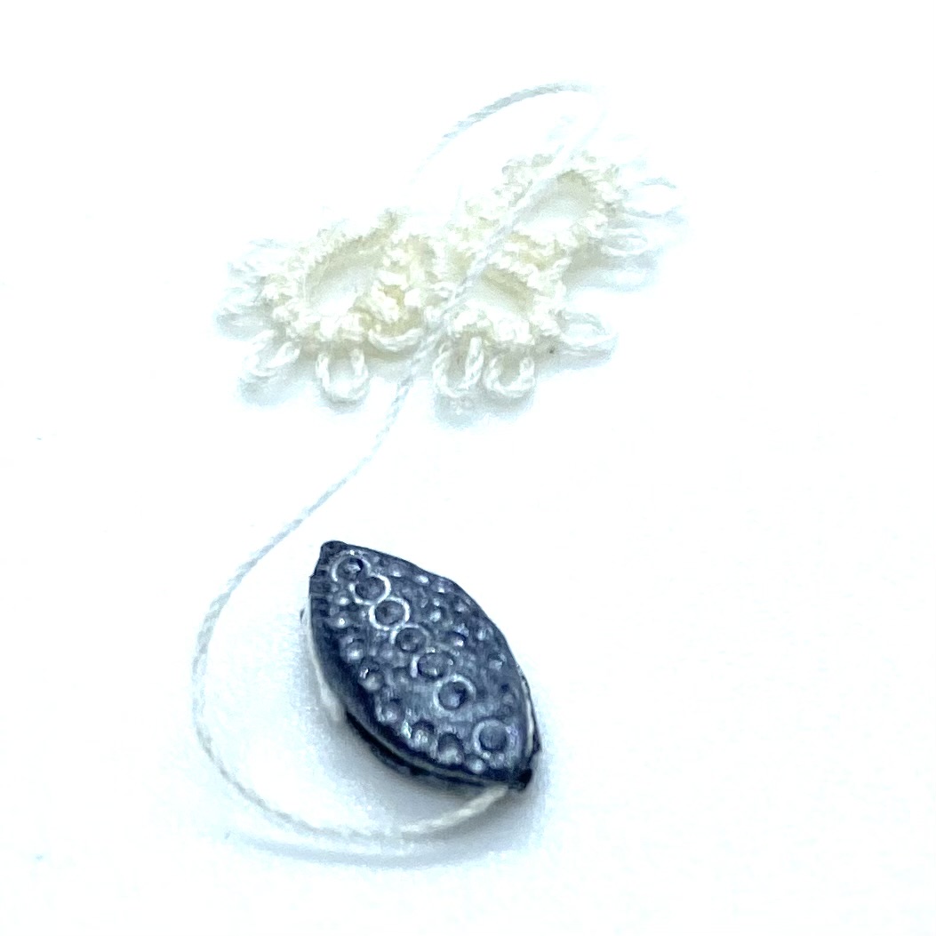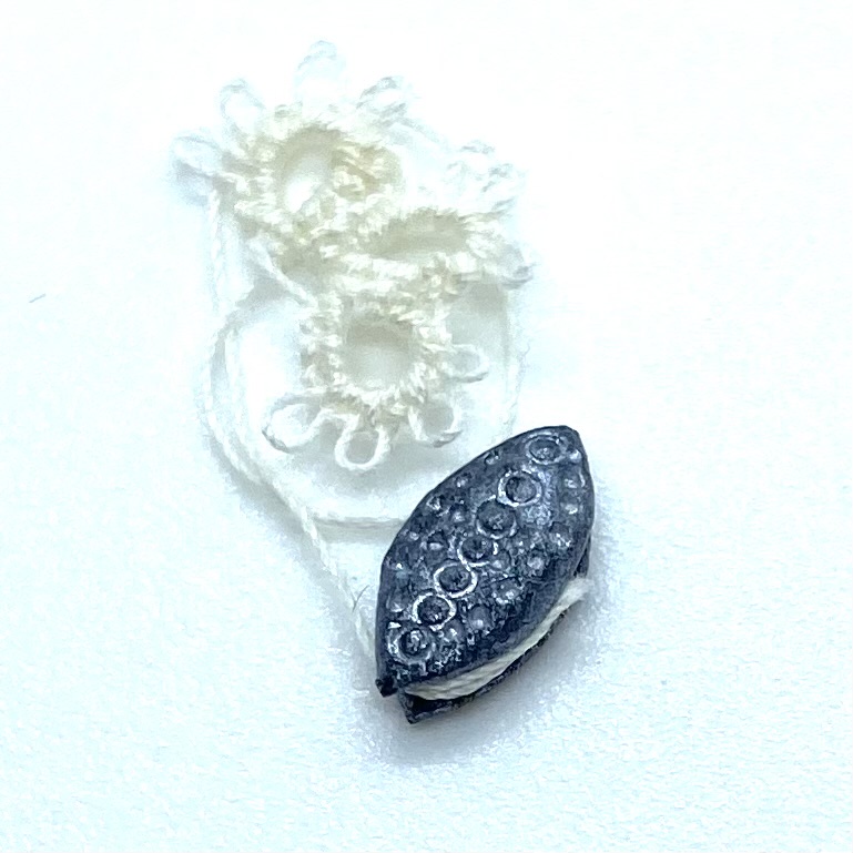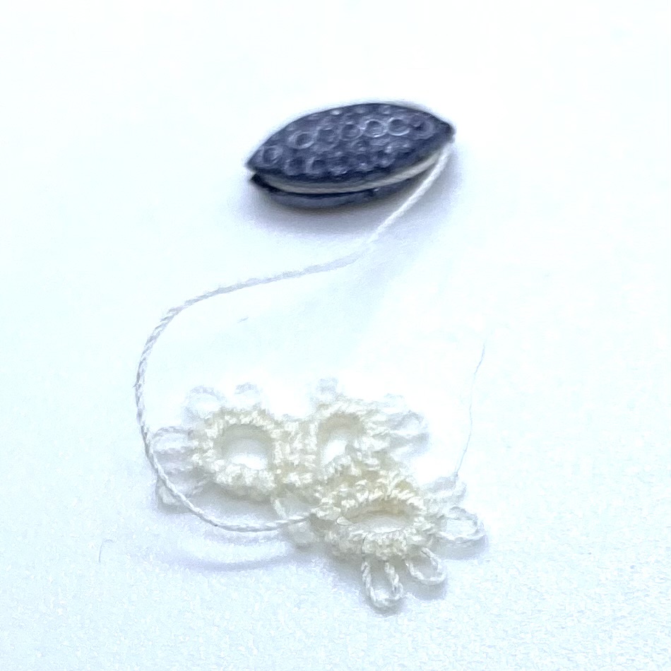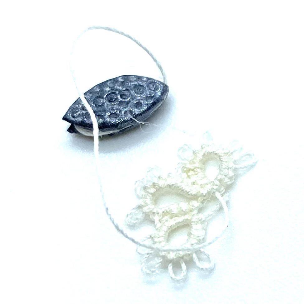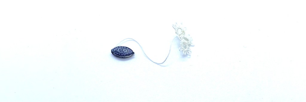 Dimensions: 9 x 4 mm. / ⅜ x ⅛ inches (shuttle); 12 x 9 mm. / ½ x ⅜ inches (tatted mat fragment)
