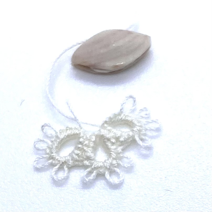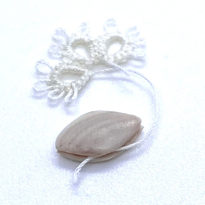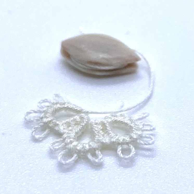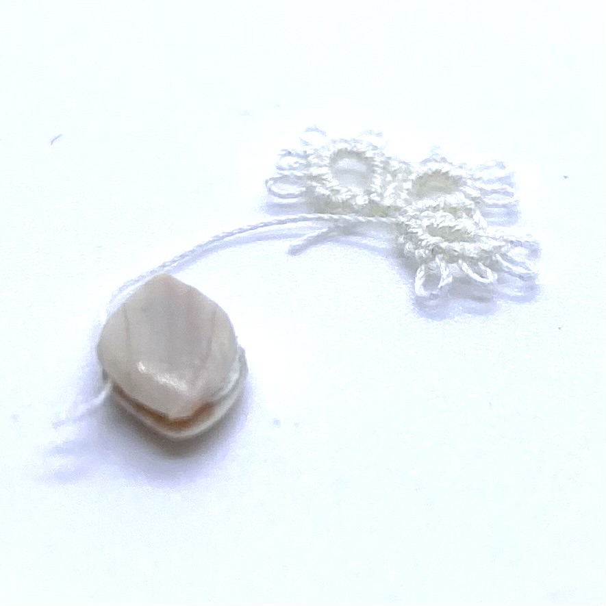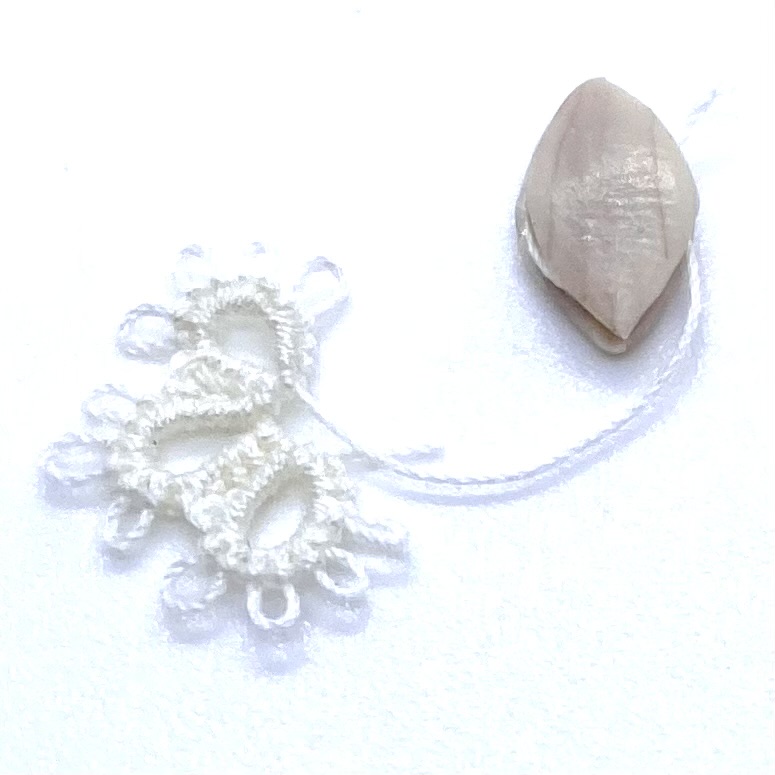 Dimensions: 9 x 4 mm. / ⅜ x ⅛ inches (shuttle); 12 x 9 mm. / ½ x ⅜ inches (tatted mat fragment)