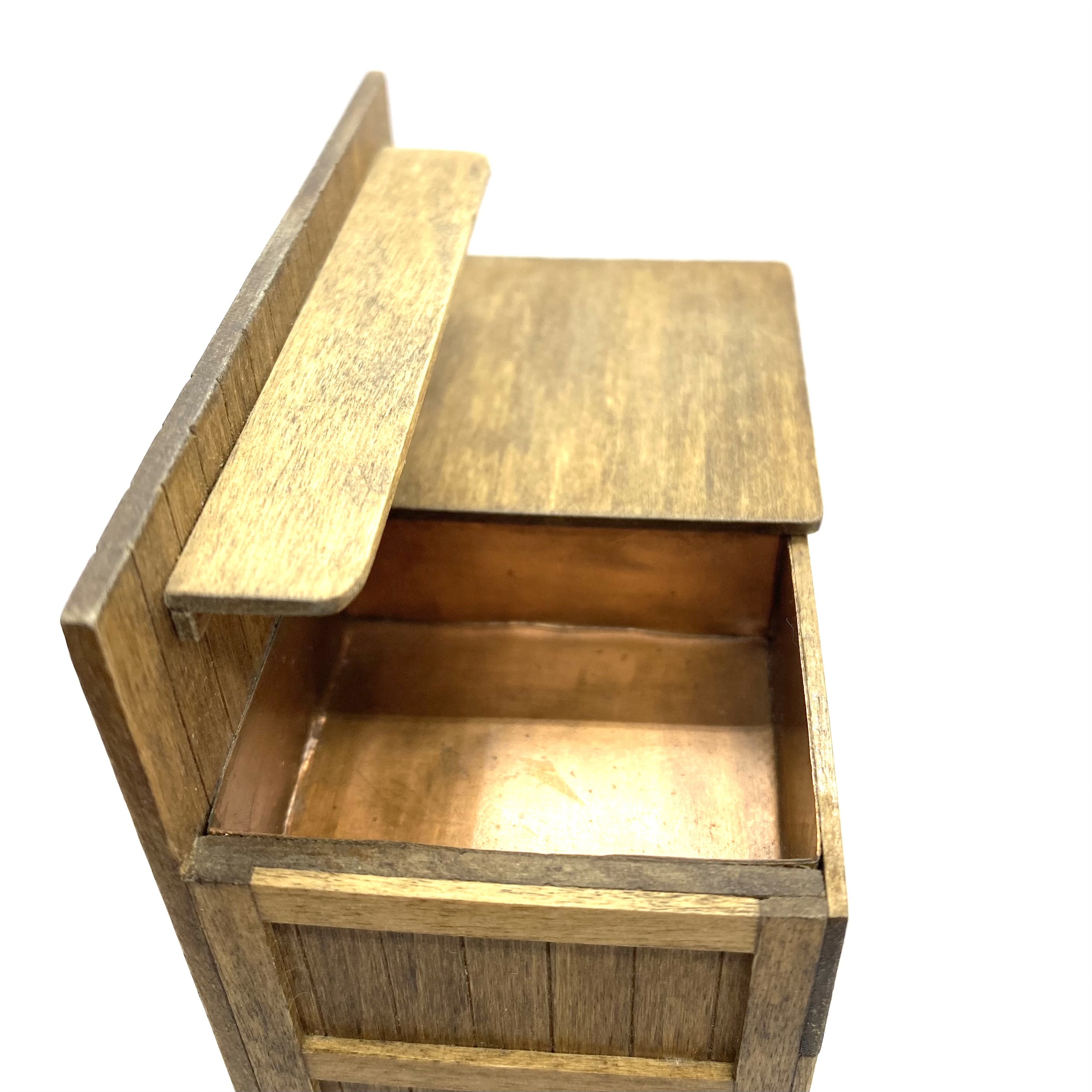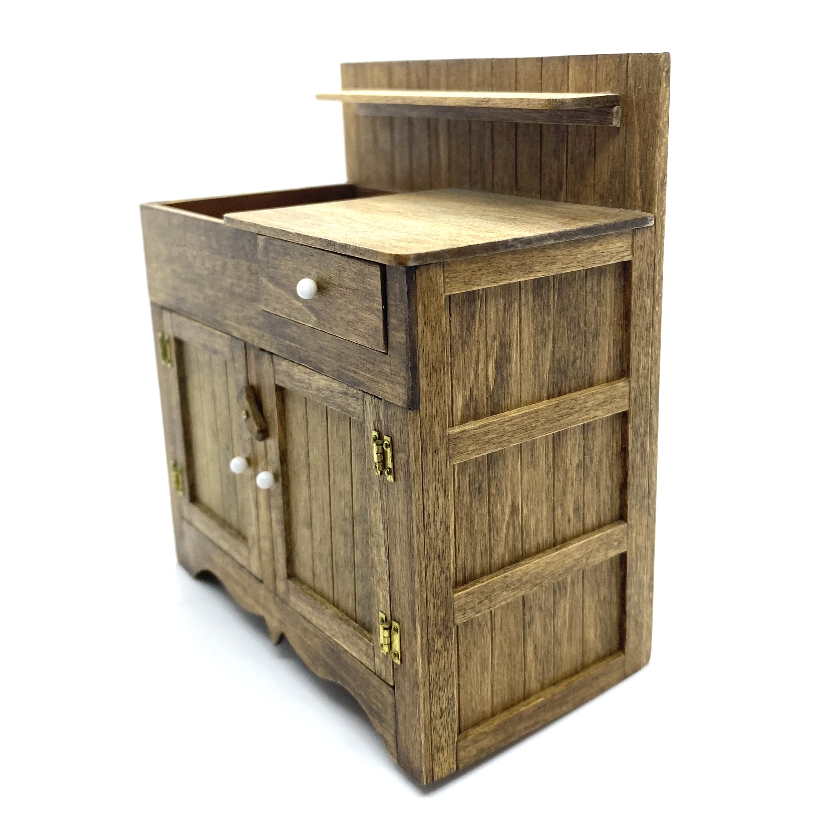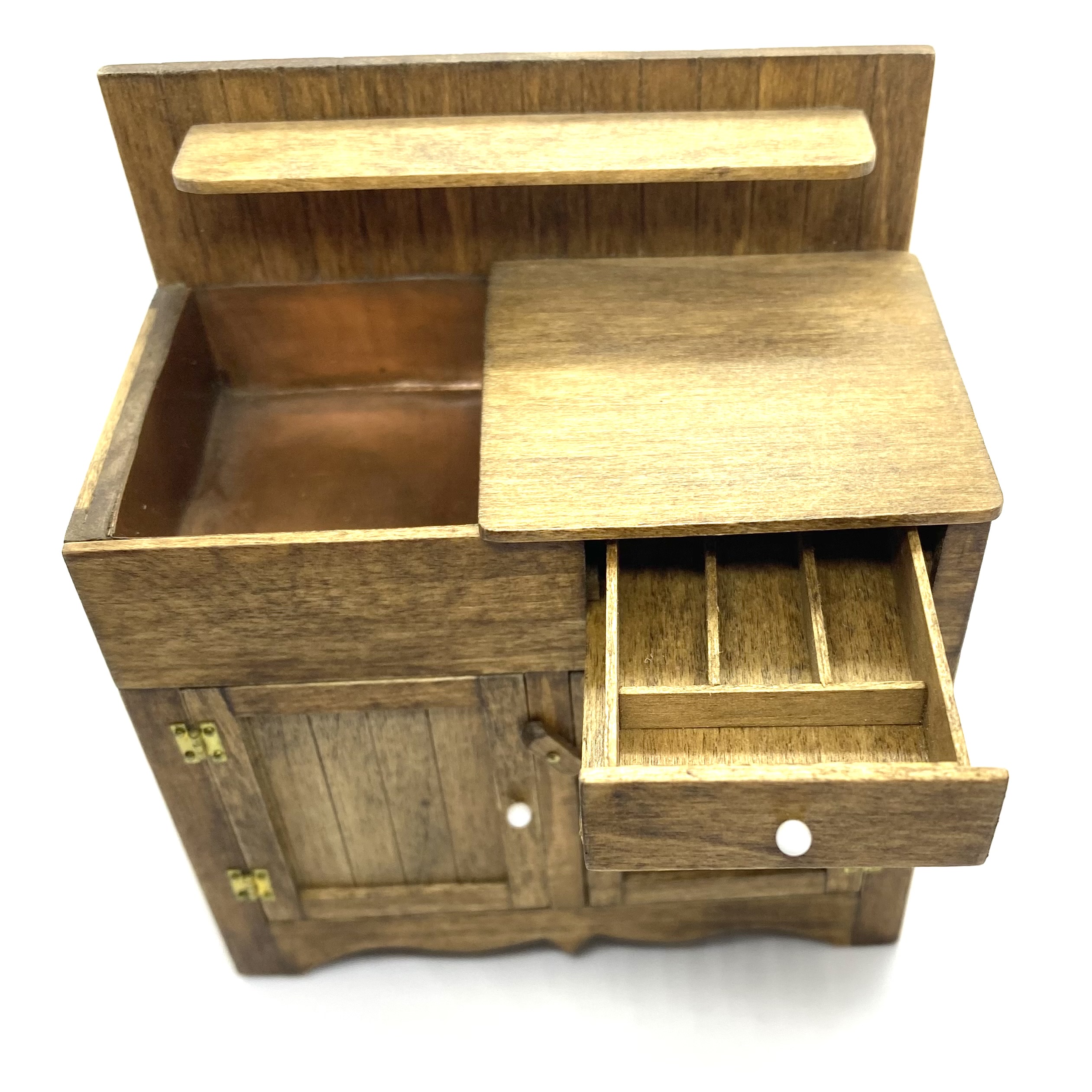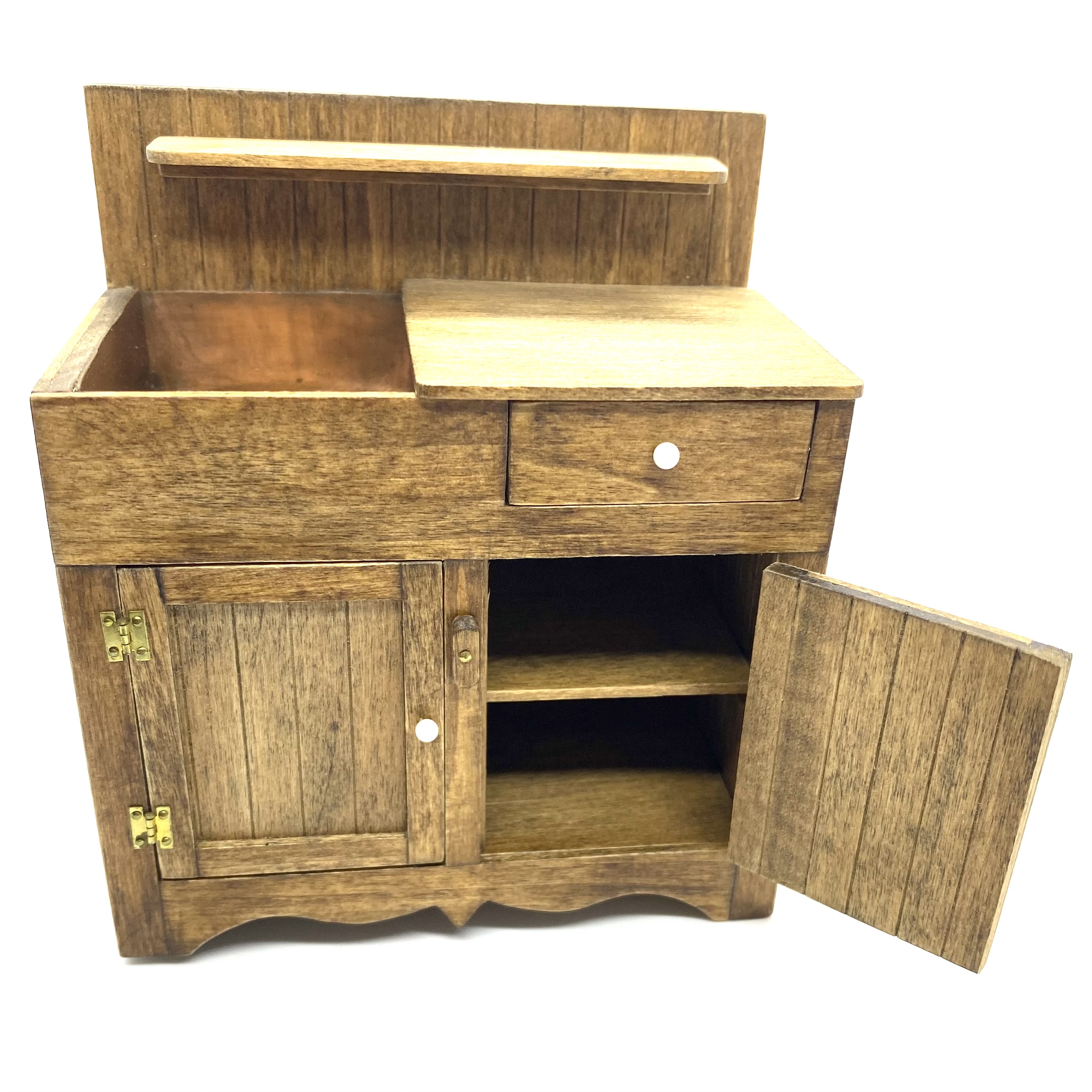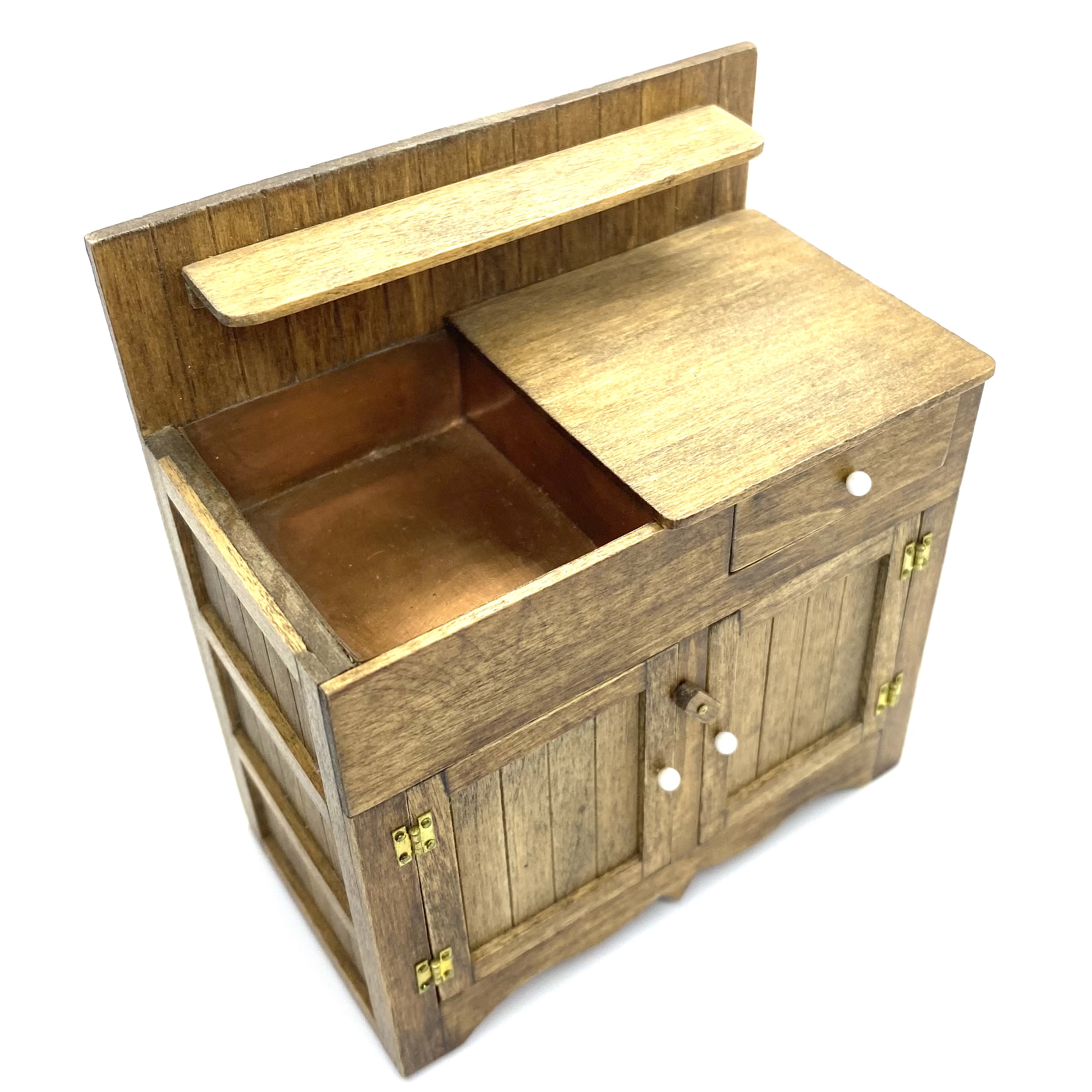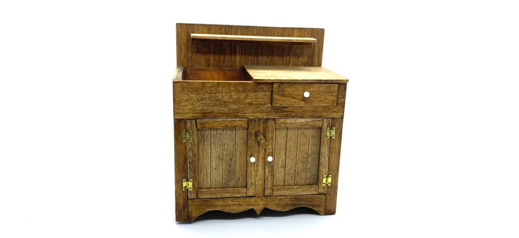 This beautiful country-style dry sink is signed on the underside by ‘J Nazak’, an artisan about whom I can discover next to nothing. My research revealed that she or he also created a primitive-style kitchen dresser with pull-out metal-lined bins, and a pie safe with pierced metal doors, both of which match this sink in execution and in the type of handles used. These pieces were sold on eBay in early 2022. I presume that all three pieces were made as a set or series, though the dresser is dated 1990 and the pie safe, like this dry sink, 1988.
