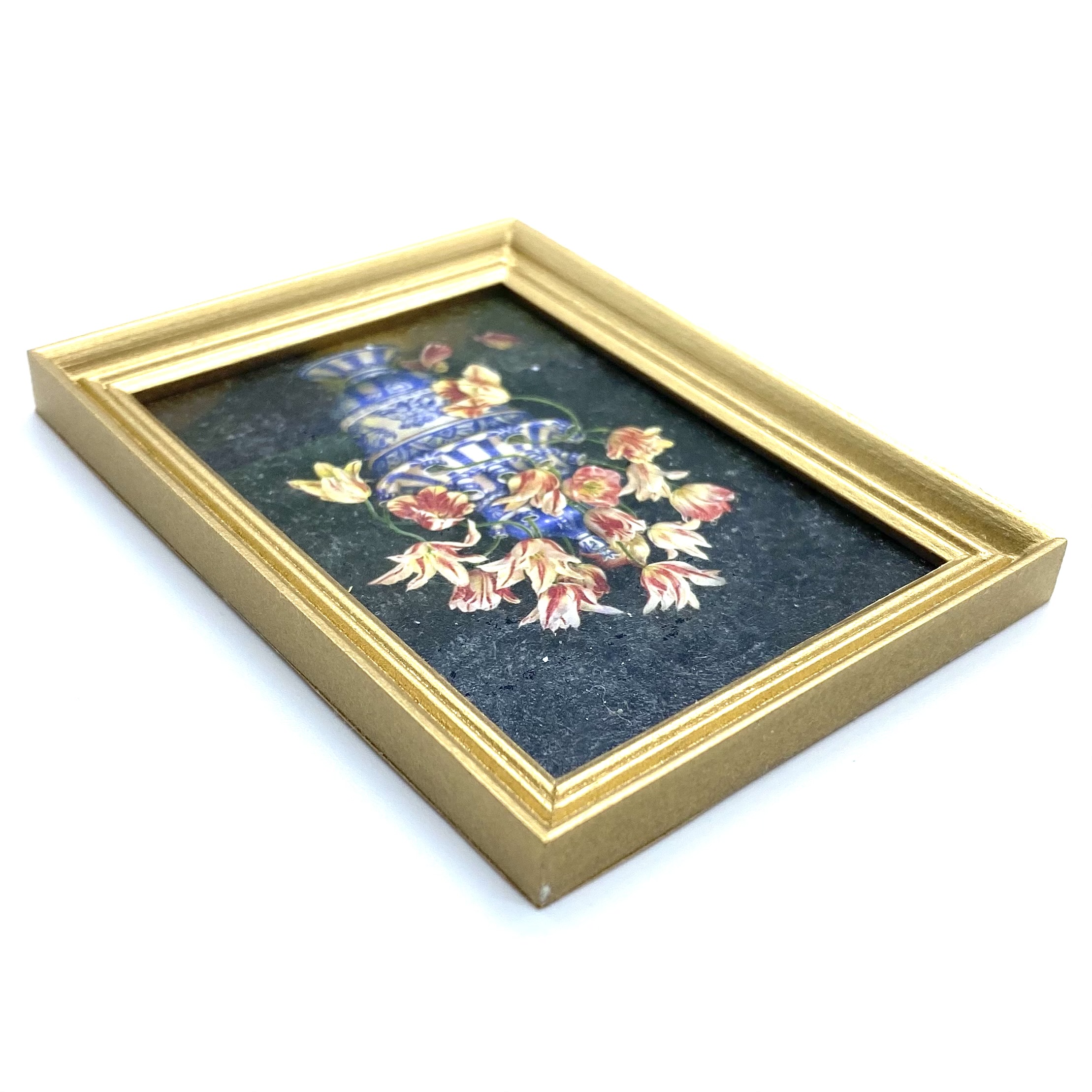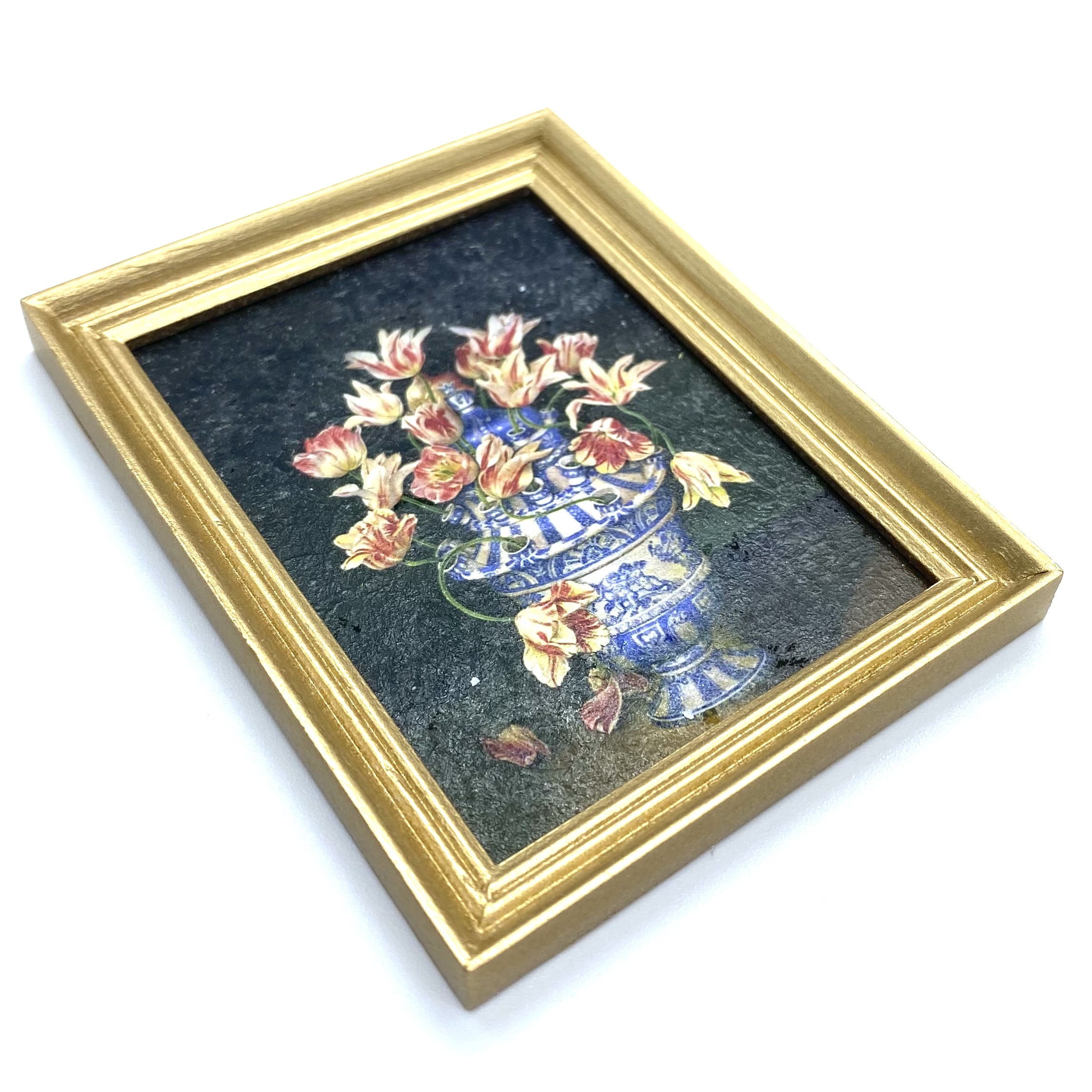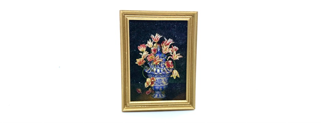 Created using Mariangela’s impressive technique, which gives these prints the appearance of real textured miniature paintings. With its blue and white vase, this picture will bring together the Dutch still-lives and the Chinese and Delft porcelain on display in the Drawing Room.