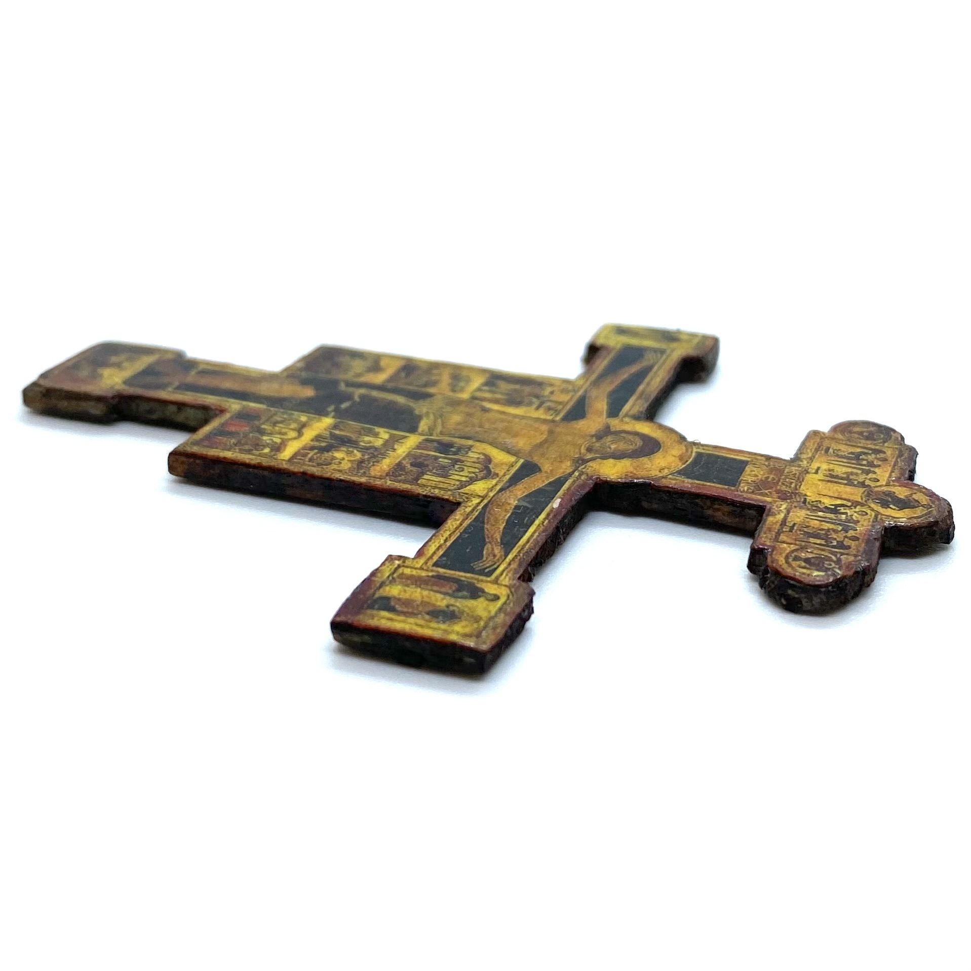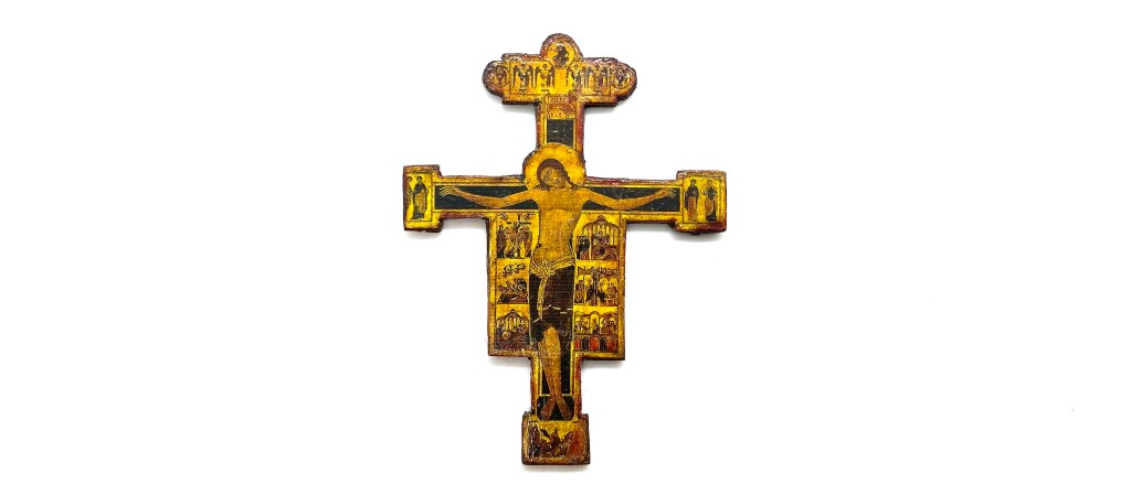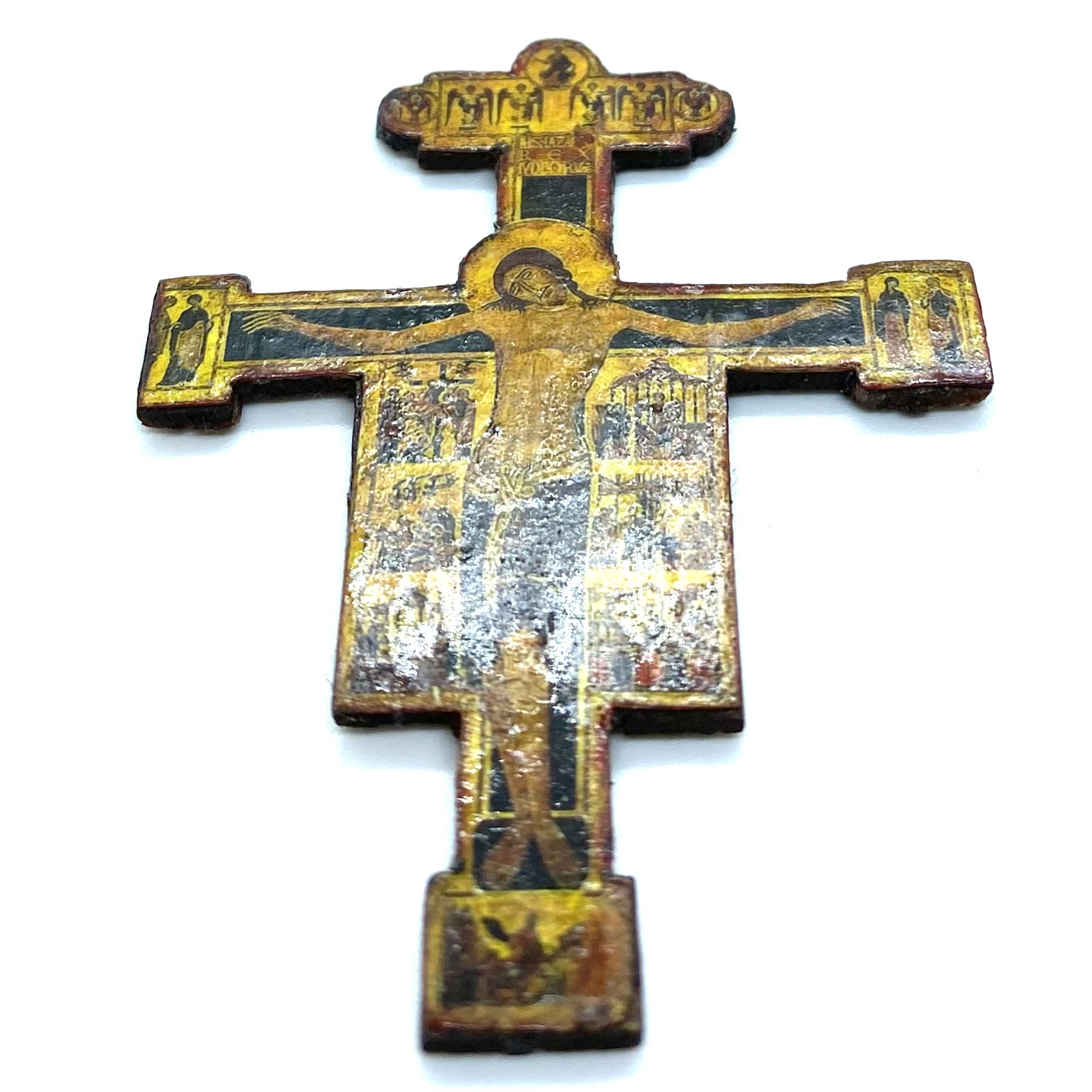 This lovely miniature replica of a medieval crucifix recalls the wooden crosses hanging over the altar in Florentine churches. Mariangela has even paid attention to the back, where the panel looks authentically ‘braced’ with rods of wood. An evocative, austere piece for the Gallery.