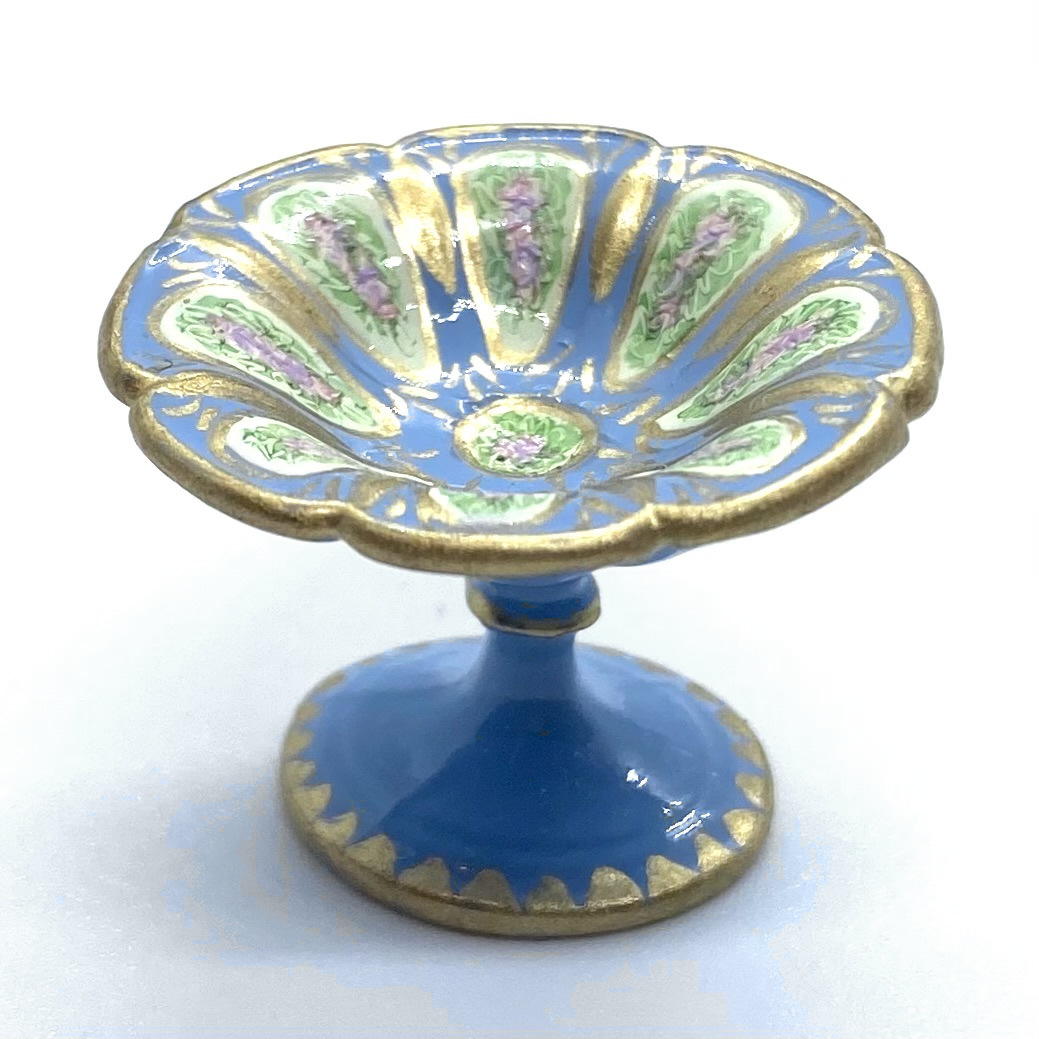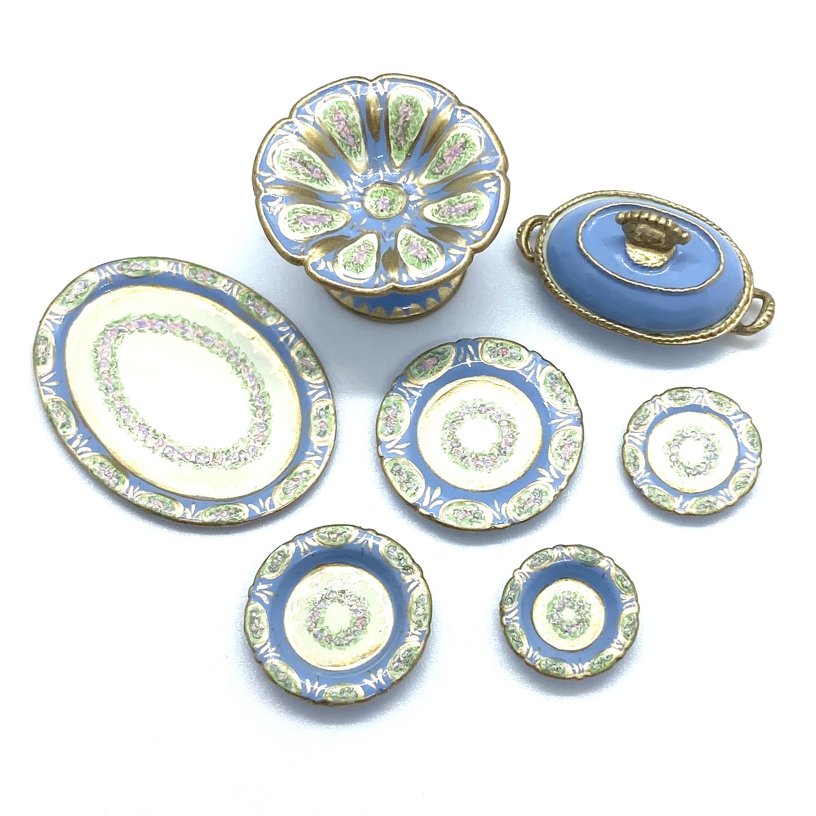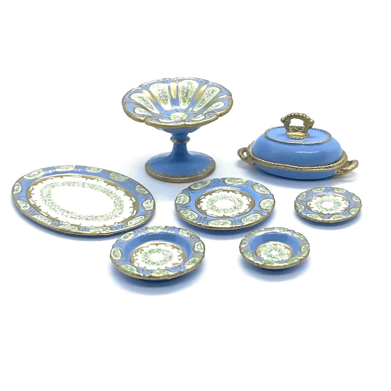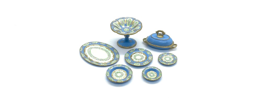 Dimensions: 15 x 29 x 17 mm. / ⅝ x 1 ⅛ x ⅝ inches (covered serving dishes); 3 x 35 x 25 mm. / ⅛ x 1 ⅜ x 1 inches (oval platter); 3 x 21 mm. / ⅛ x ⅞ inches (dinner plates); 3 x 14 mm. / ⅛ x ½ inches (salad plates); 4 x 18 mm. / ⅛ x ¾ inches (soup bowls); 4 x 14 mm. / ⅛ x ½ (pudding bowls); 18 x 26 mm. / ¾ x 1 inches (compote) (dimensions with three values are height x width x depth; those with two values are height x diameter)