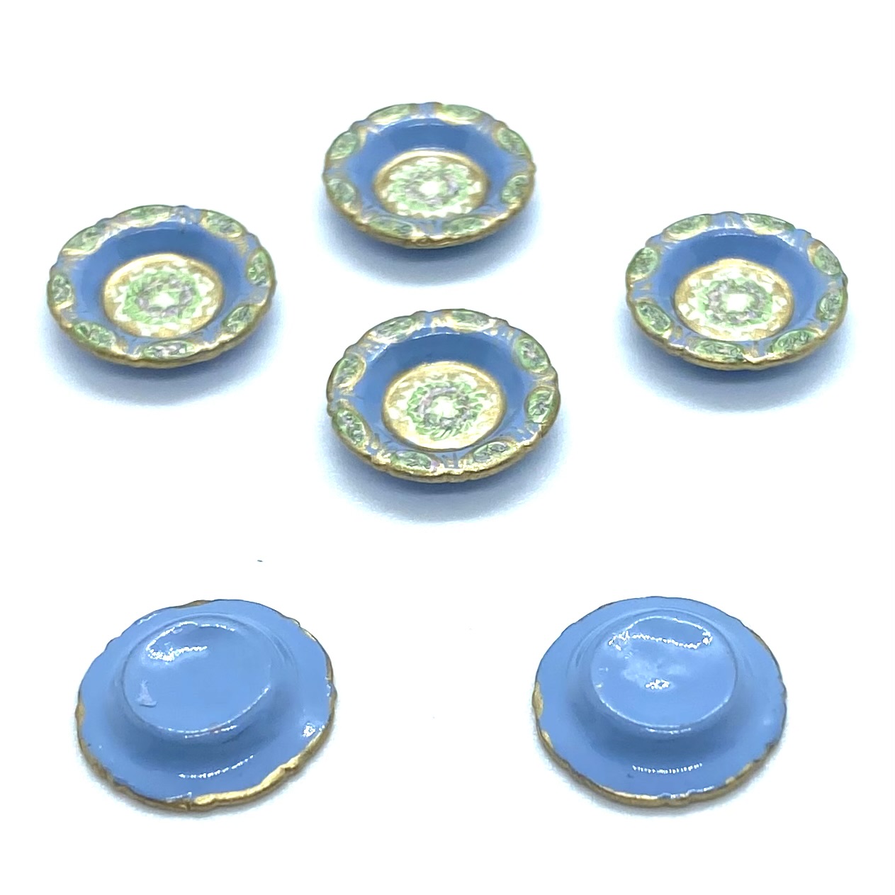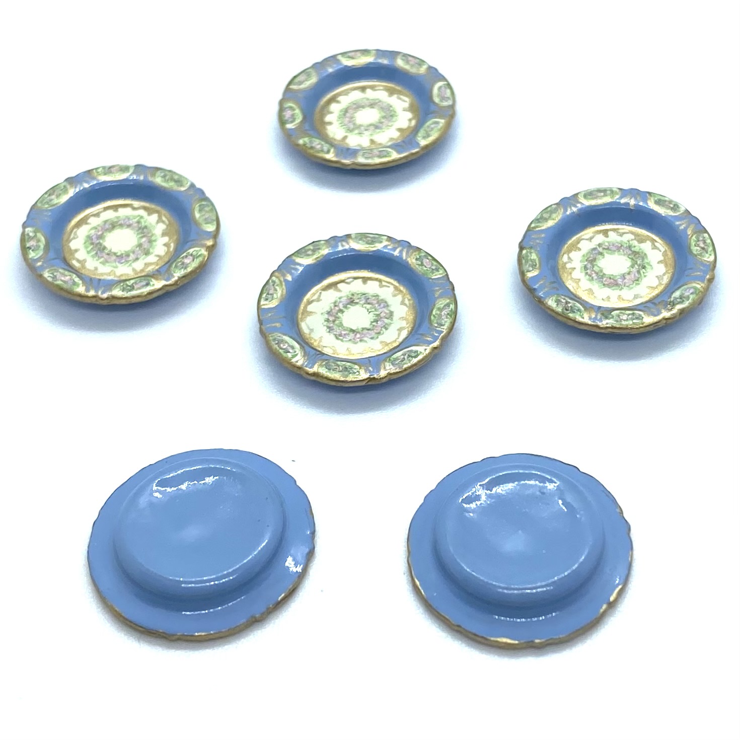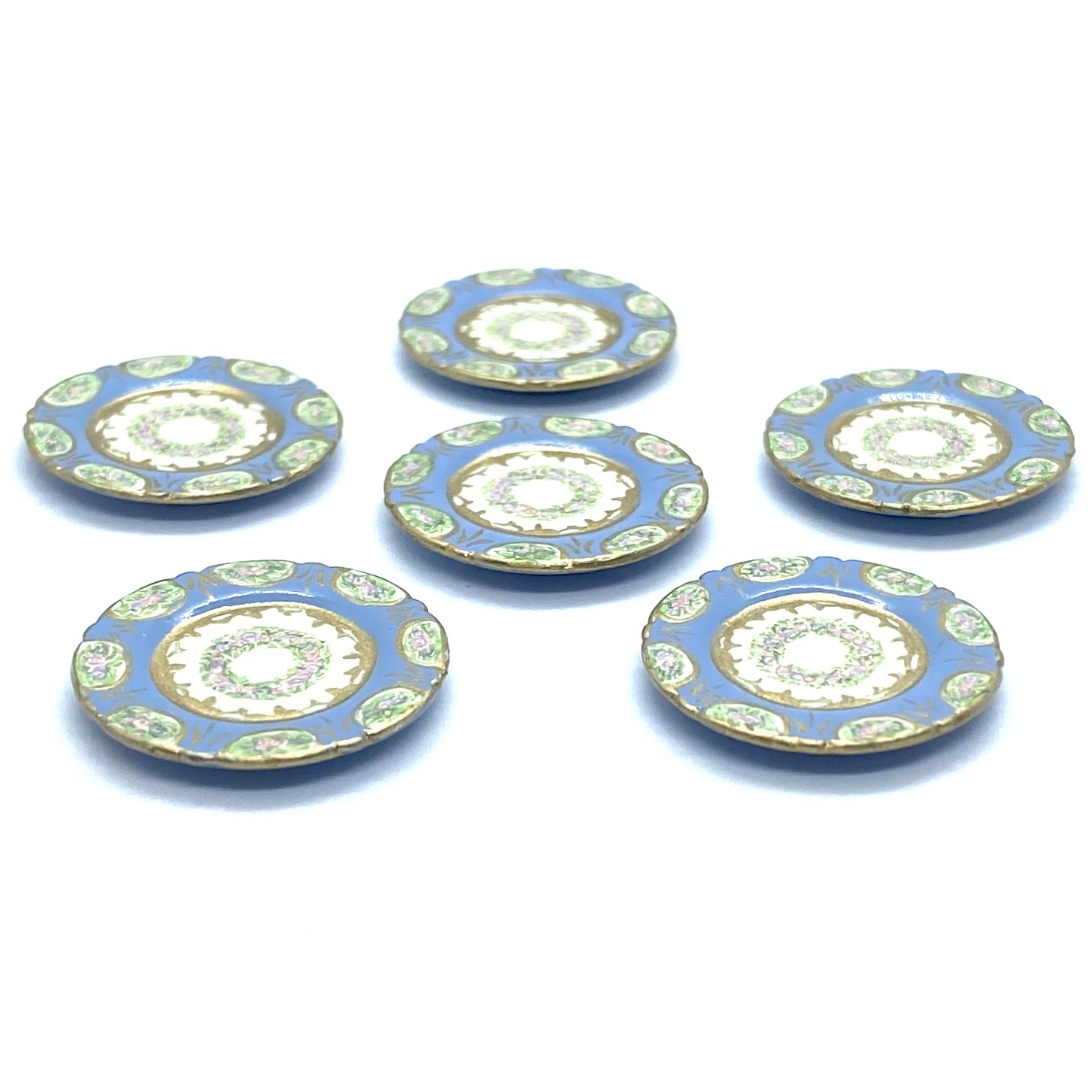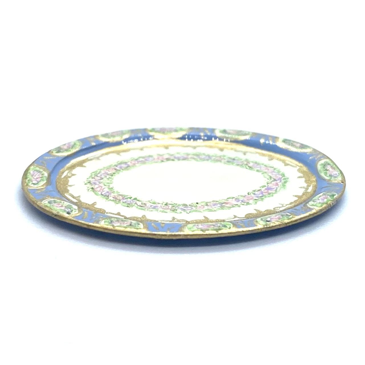 Dimensions: 15 x 29 x 17 mm. / ⅝ x 1 ⅛ x ⅝ inches (covered serving dishes); 3 x 35 x 25 mm. / ⅛ x 1 ⅜ x 1 inches (oval platter); 3 x 21 mm. / ⅛ x ⅞ inches (dinner plates); 3 x 14 mm. / ⅛ x ½ inches (salad plates); 4 x 18 mm. / ⅛ x ¾ inches (soup bowls); 4 x 14 mm. / ⅛ x ½ (pudding bowls); 18 x 26 mm. / ¾ x 1 inches (compote) (dimensions with three values are height x width x depth; those with two values are height x diameter)