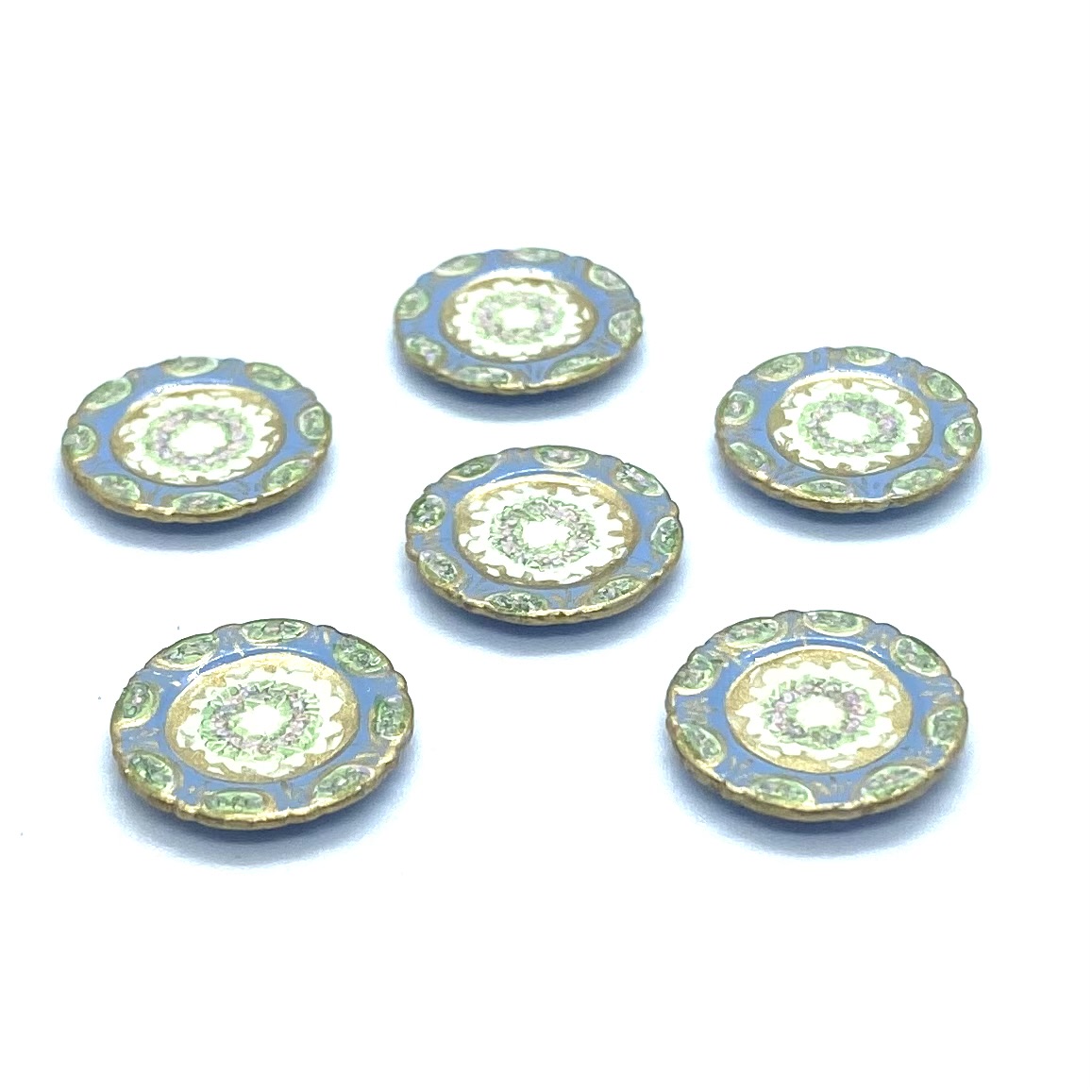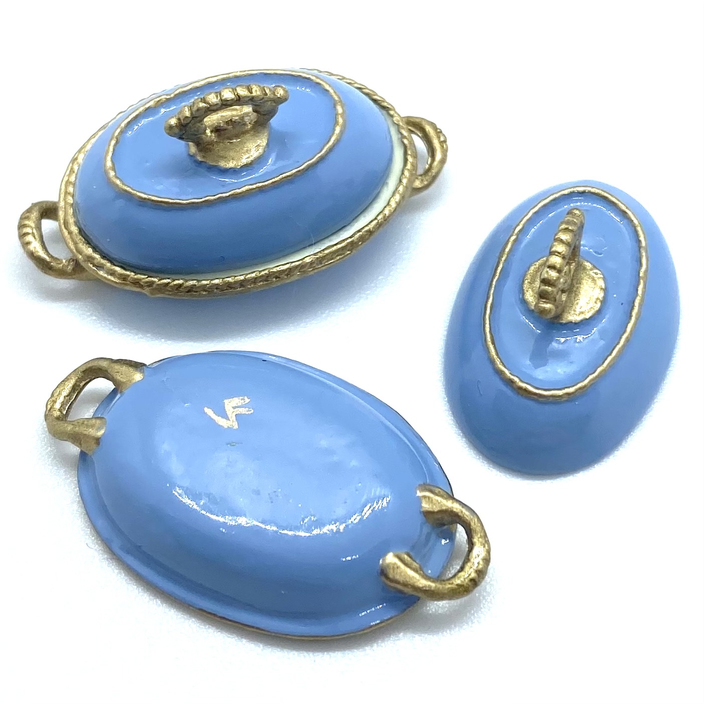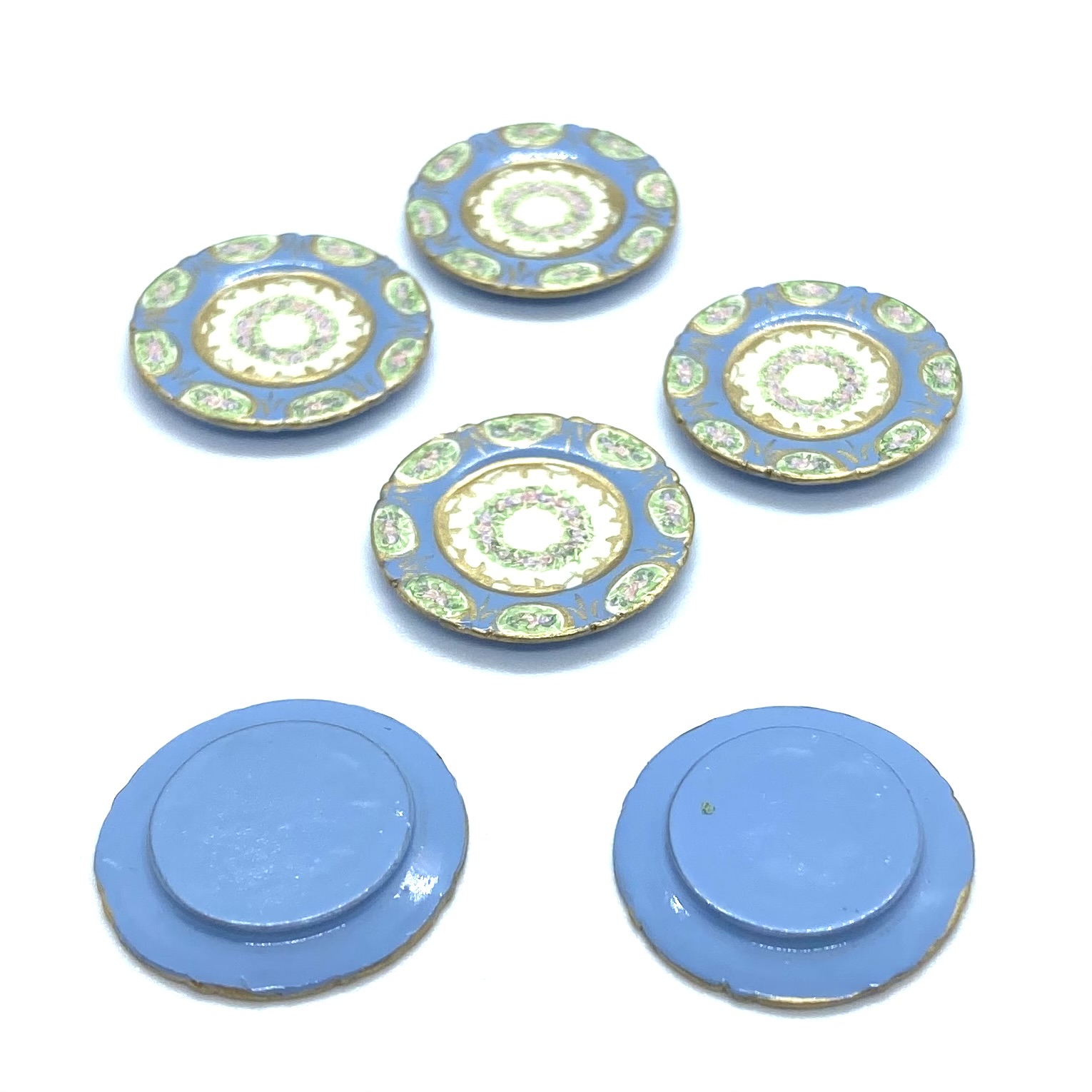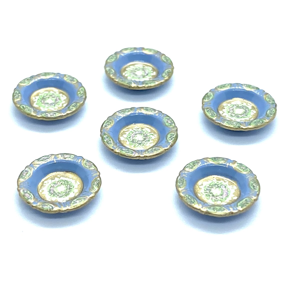 Dimensions: 15 x 29 x 17 mm. / ⅝ x 1 ⅛ x ⅝ inches (covered serving dishes); 3 x 35 x 25 mm. / ⅛ x 1 ⅜ x 1 inches (oval platter); 3 x 21 mm. / ⅛ x ⅞ inches (dinner plates); 3 x 14 mm. / ⅛ x ½ inches (salad plates); 4 x 18 mm. / ⅛ x ¾ inches (soup bowls); 4 x 14 mm. / ⅛ x ½ (pudding bowls); 18 x 26 mm. / ¾ x 1 inches (compote) (dimensions with three values are height x width x depth; those with two values are height x diameter)