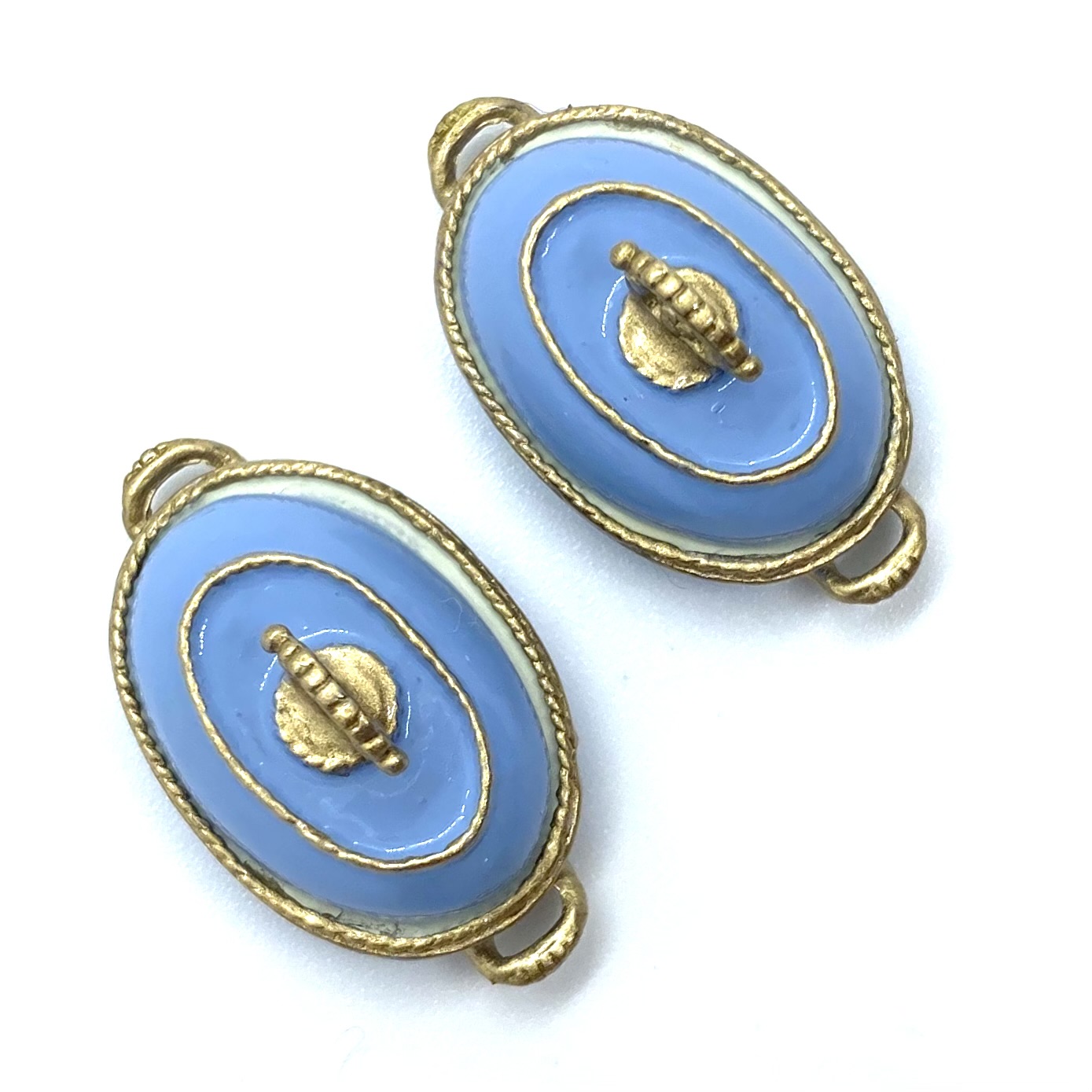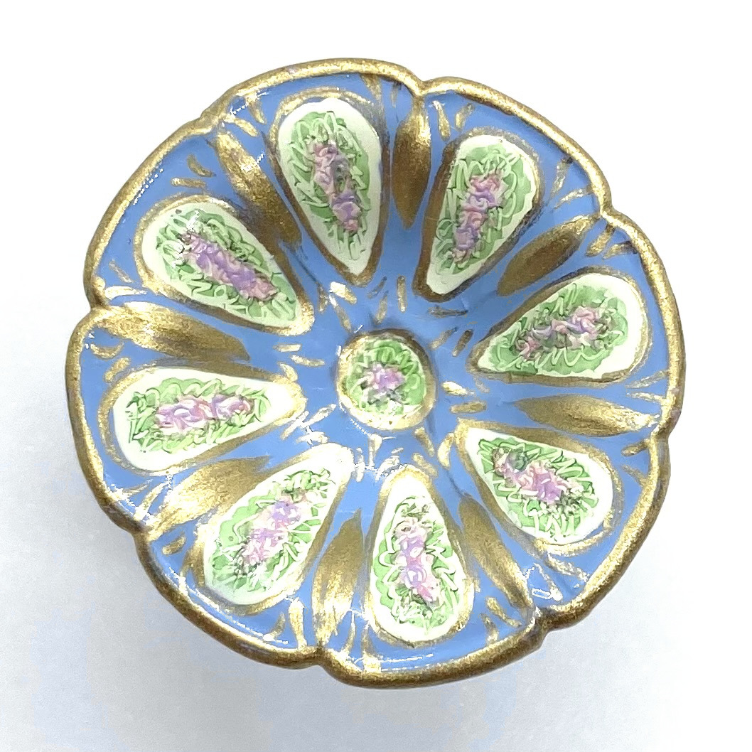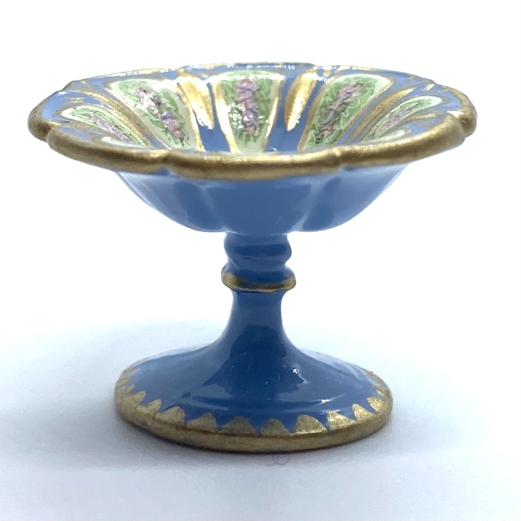 This grand dinner service by Victoria Fasken is cast in metal and then hand-painted with a blue floral design and heighted with gold. Designed for six, it includes one compote, two covered dishes, one platter, and six each of dinner plates, salad plates, soup bowls and pudding bowls. The compote and covered dishes are signed with initials, but the rest of the service is unsigned.