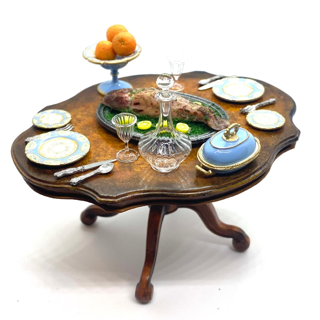 Some pieces from the dinner service in action with the fish platter, decanter and glasses, breakfast table, oranges and basic cutlery