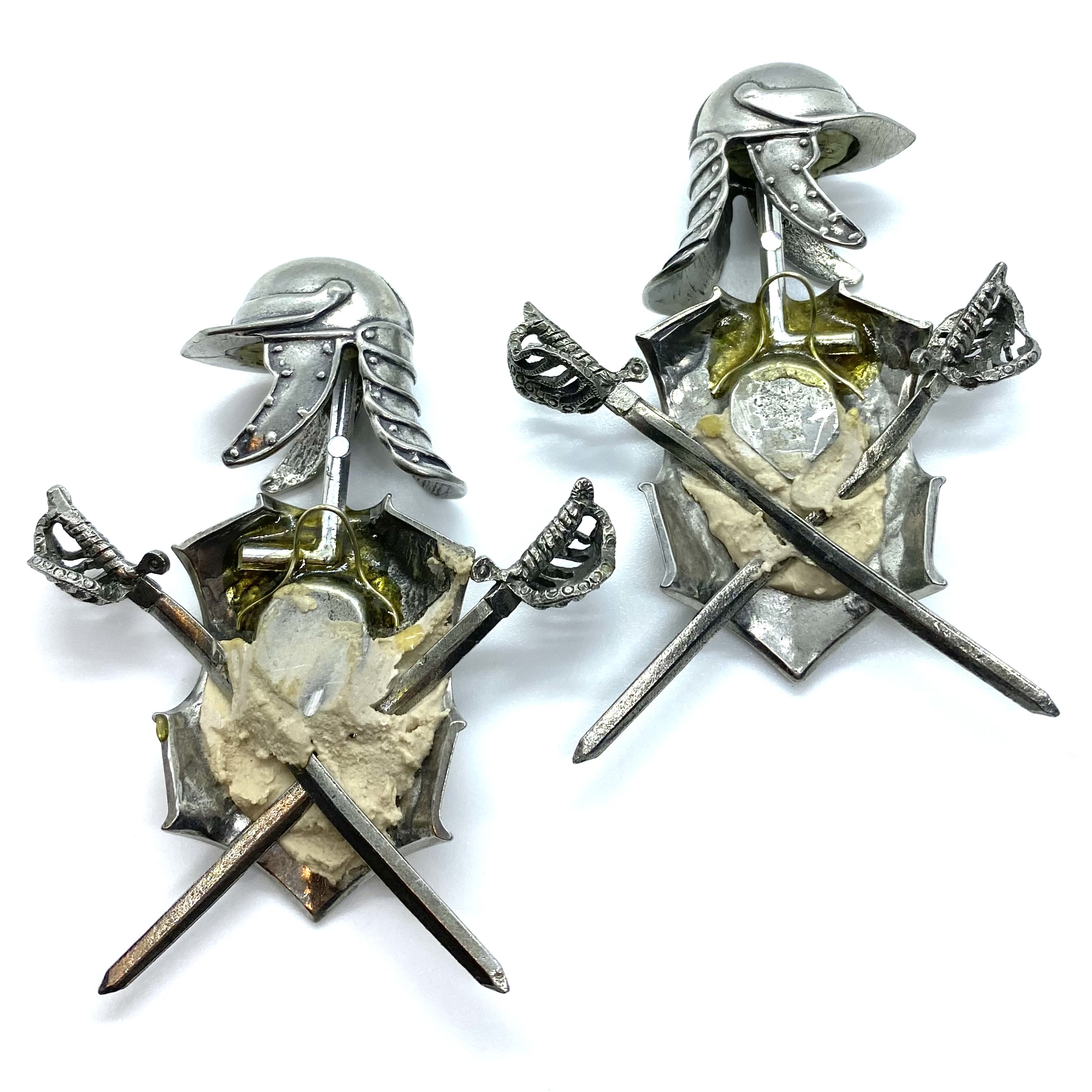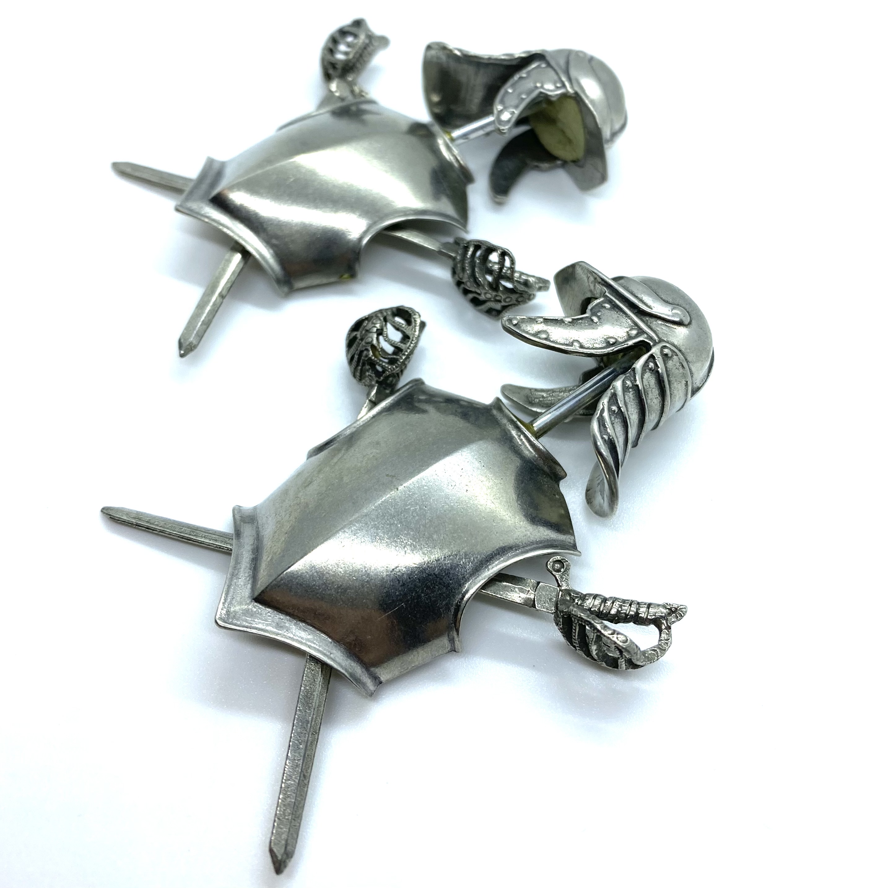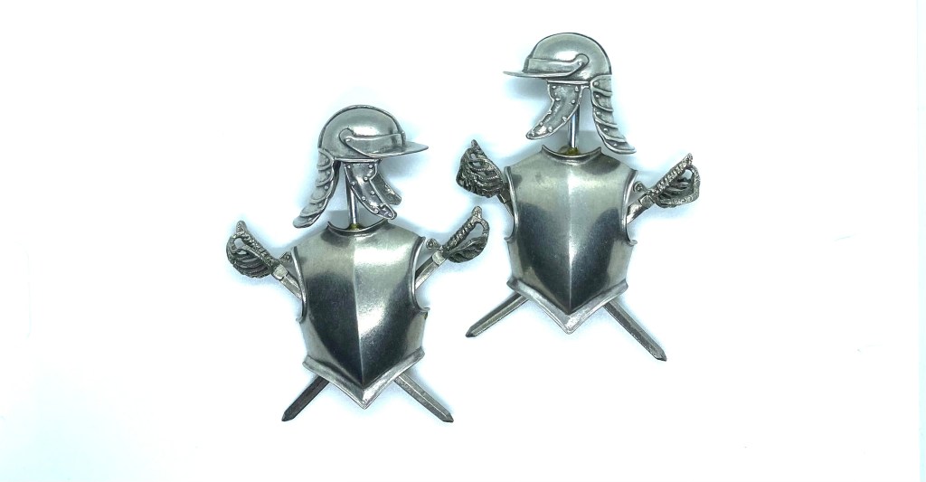 It isn’t a proper stately home without some old armour lying around somewhere. This pair of Civil War breastplates, each mounted with a lobster-tail helmet and a pair of crossed swords, will look great on either side of the fireplace in the Dining Room. Made by the late artisan John Hodgson, who is better known for his stupendous furniture, these breastplates come from the estate of miniature-maker Stan Dickinson and his wife Barbara Kinghorn-Dickinson. I bought them from Barbara’s son Chris, who was disposing of most of their collection. These are beautiful objects: not only perfect in spirit, but solidly made: they have quite a heft to them.