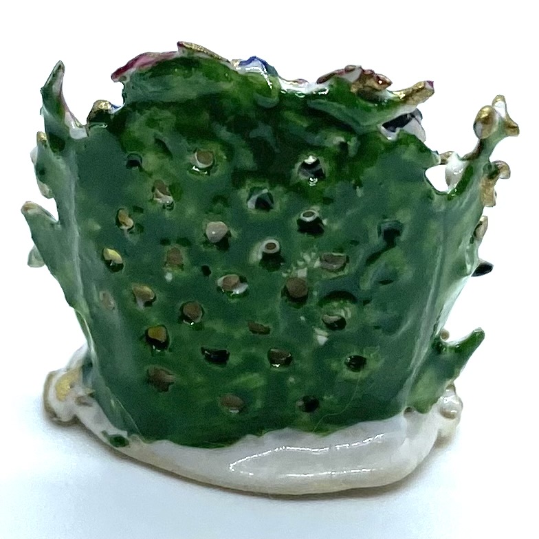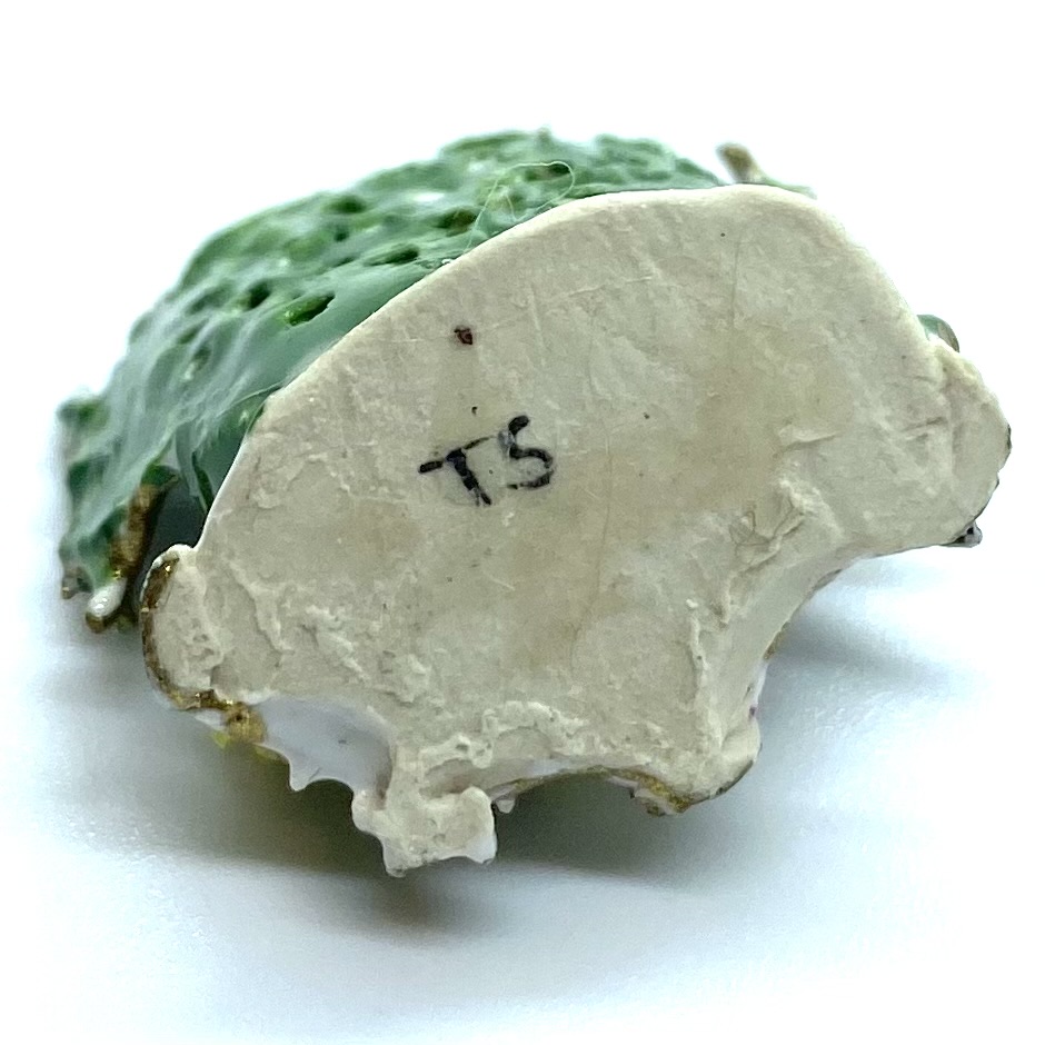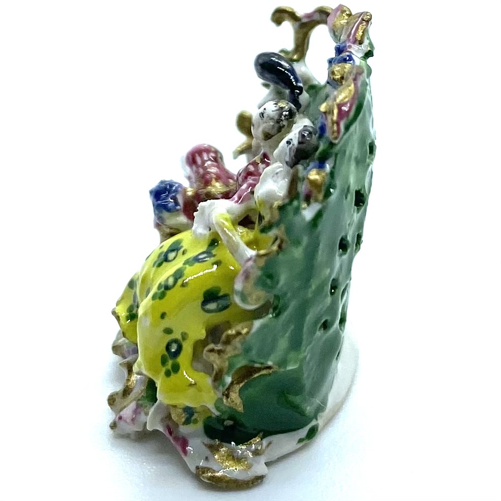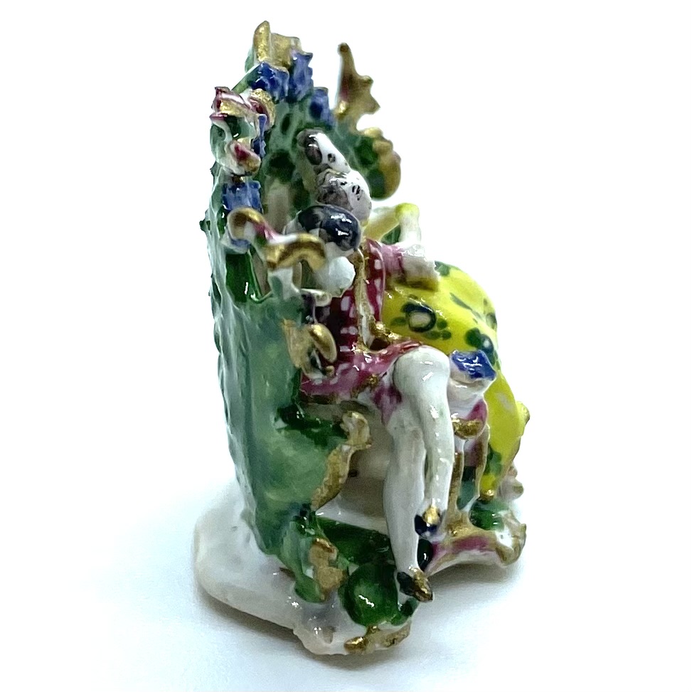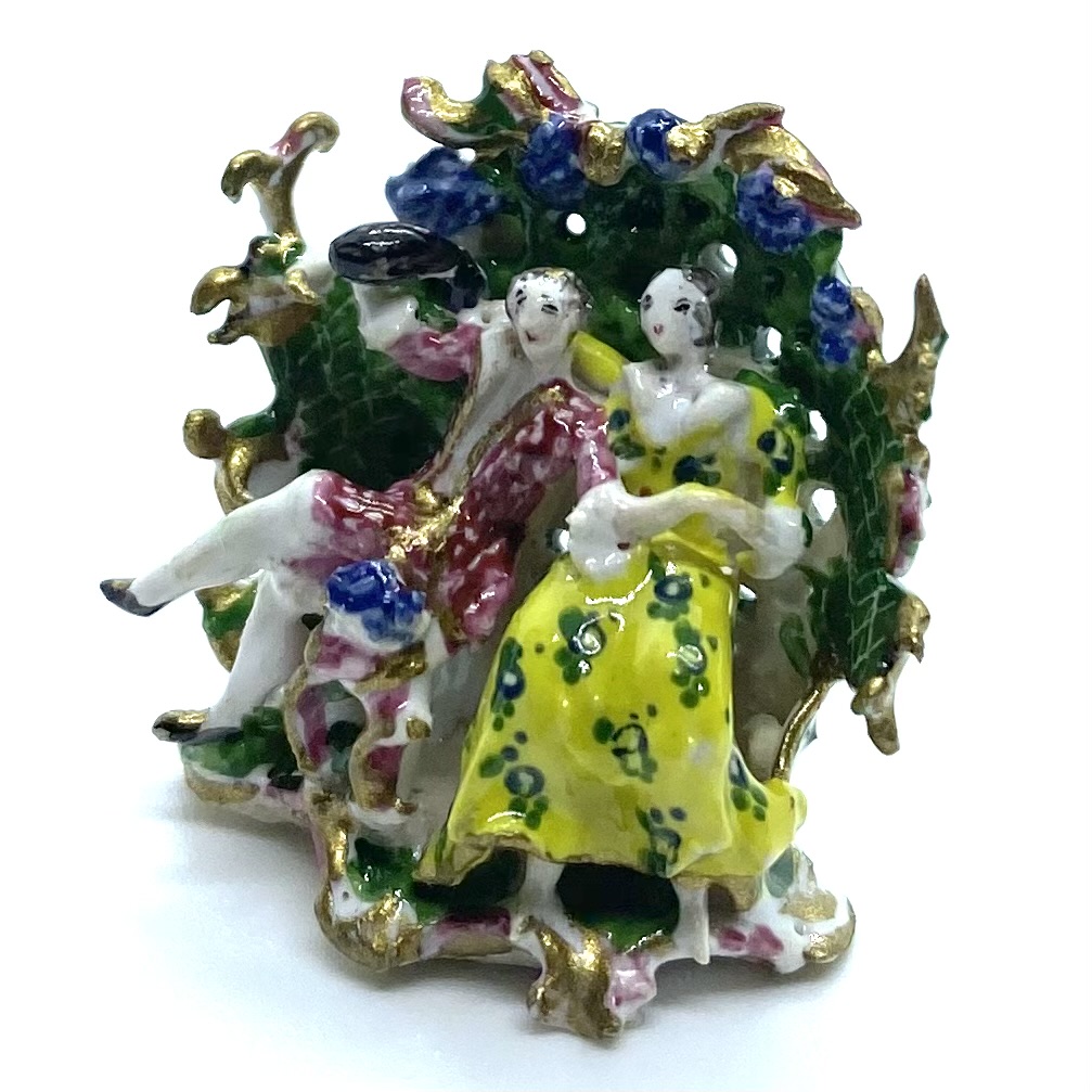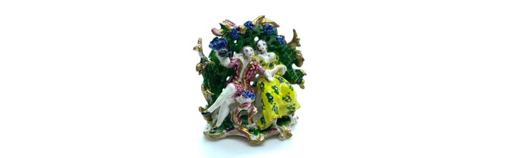 As far as possible, I kept our early purchases as miniature as possible, so that they didn’t take up too much space. And what better way than to collect miniature porcelain figurines? Tricia Street, whose more elaborate works command hefty prices, makes gorgeous Meissen-style porcelain pieces which simply exude Rococo style. This is one of two pieces by her that I bought from the collection of the late miniature-makers Stan Dickinson and his wife Barbara Kinghorn-Dickinson, via Barbara’s son Chris. The fan of background greenery is classic Staffordshire.