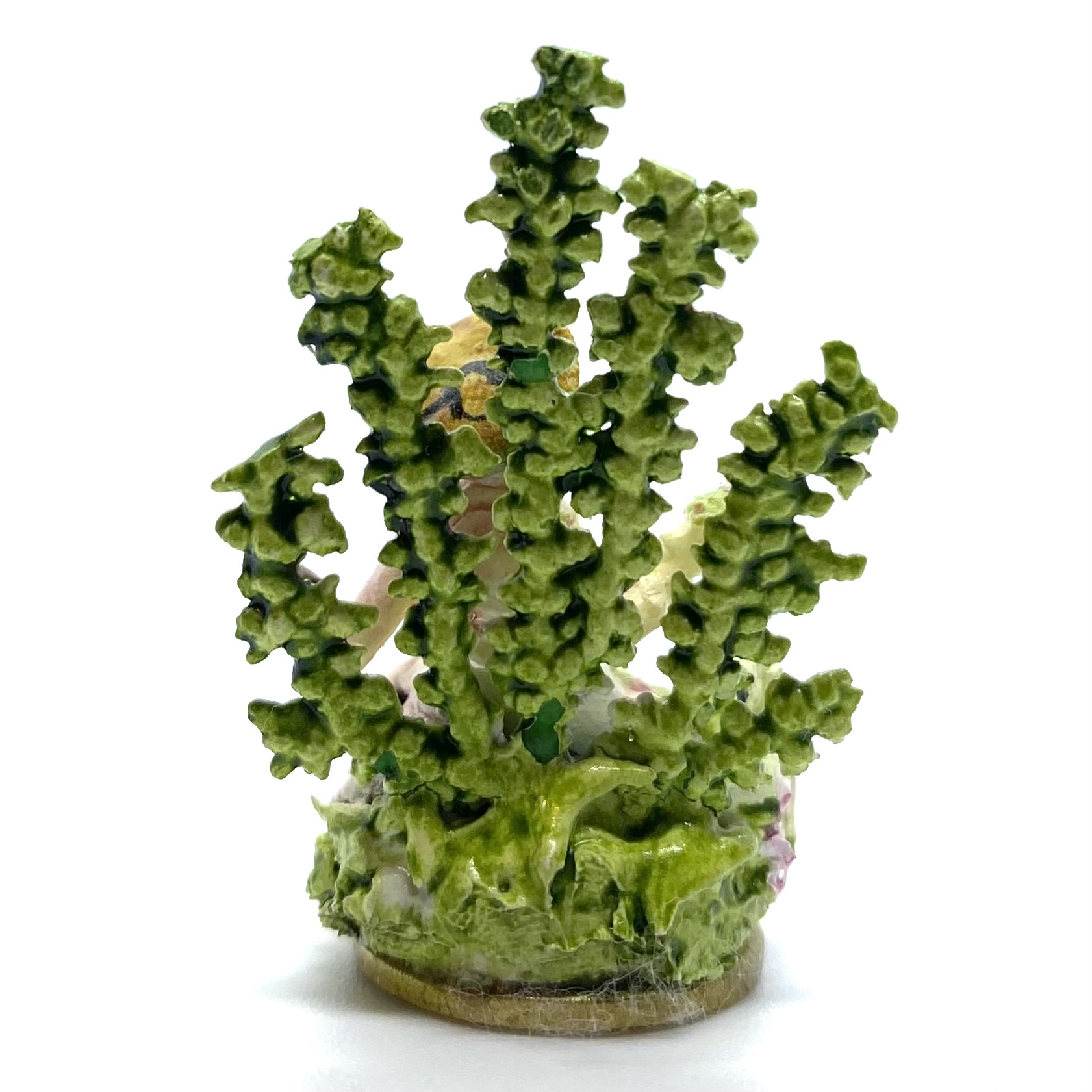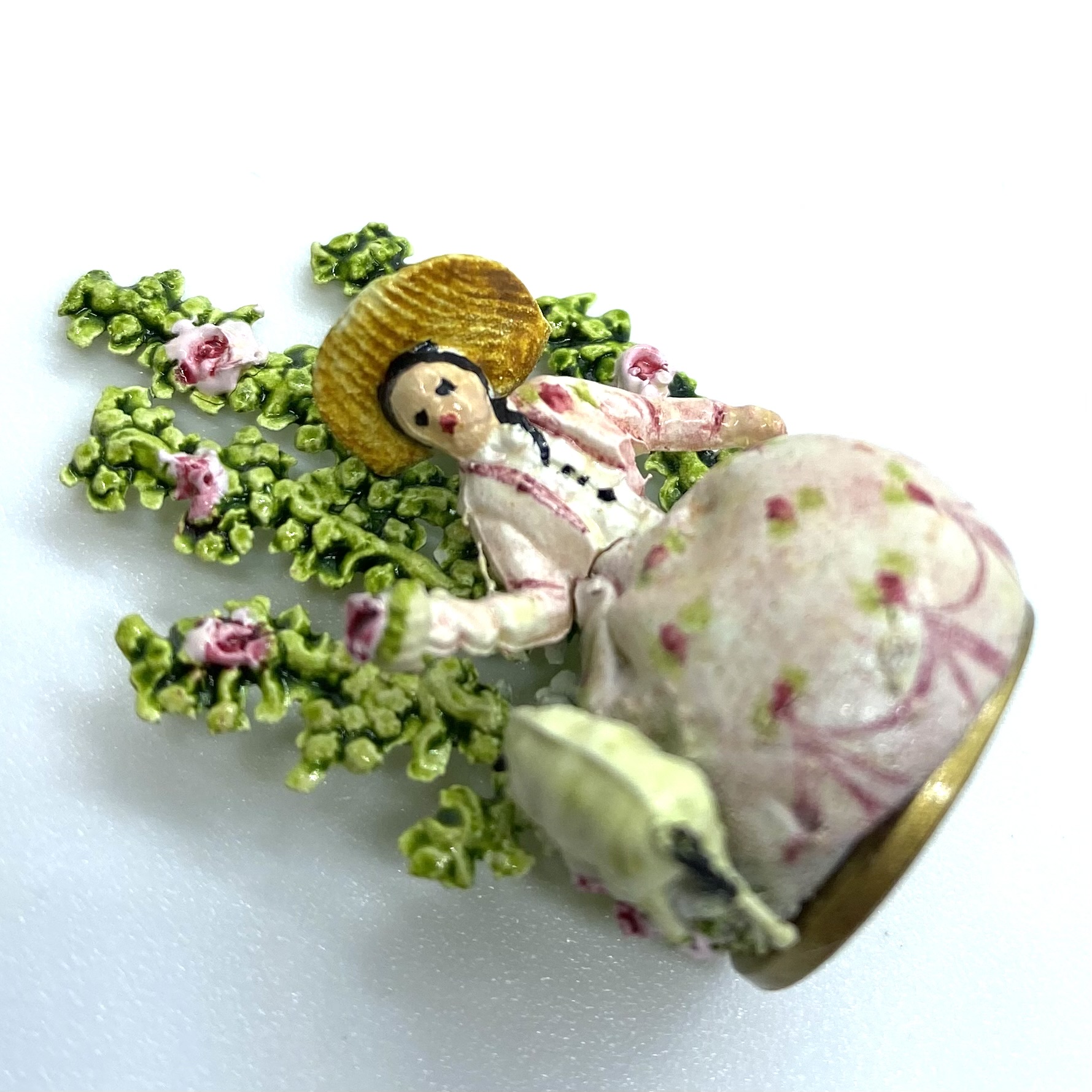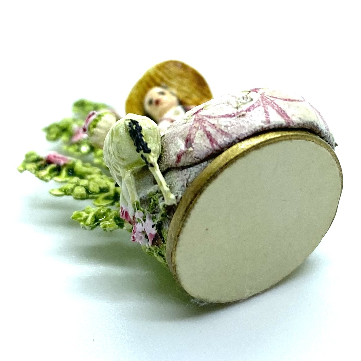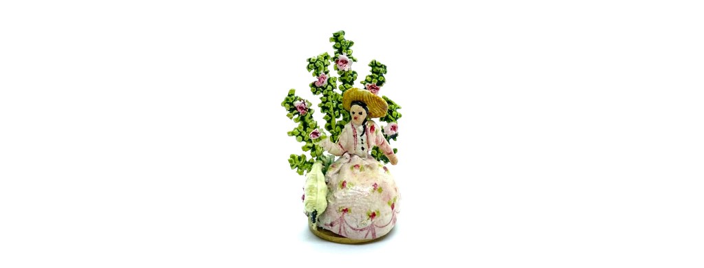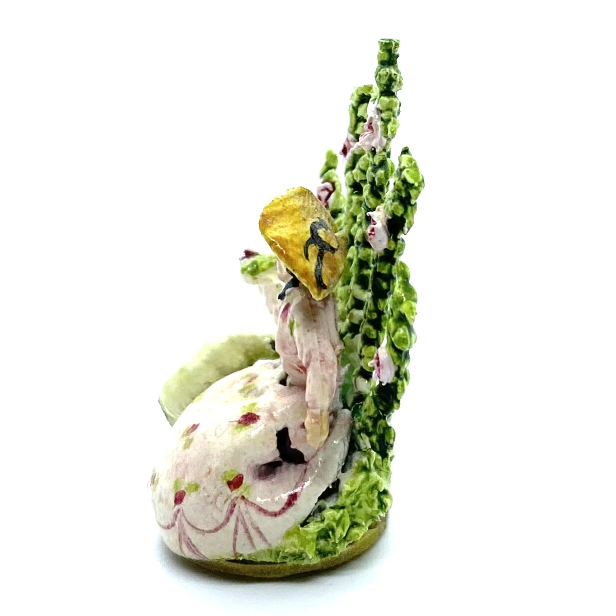 A typical Staffordshire-style figurine made by Kay Lewis, showing a figure with a sheep set against a spray of background greenery.