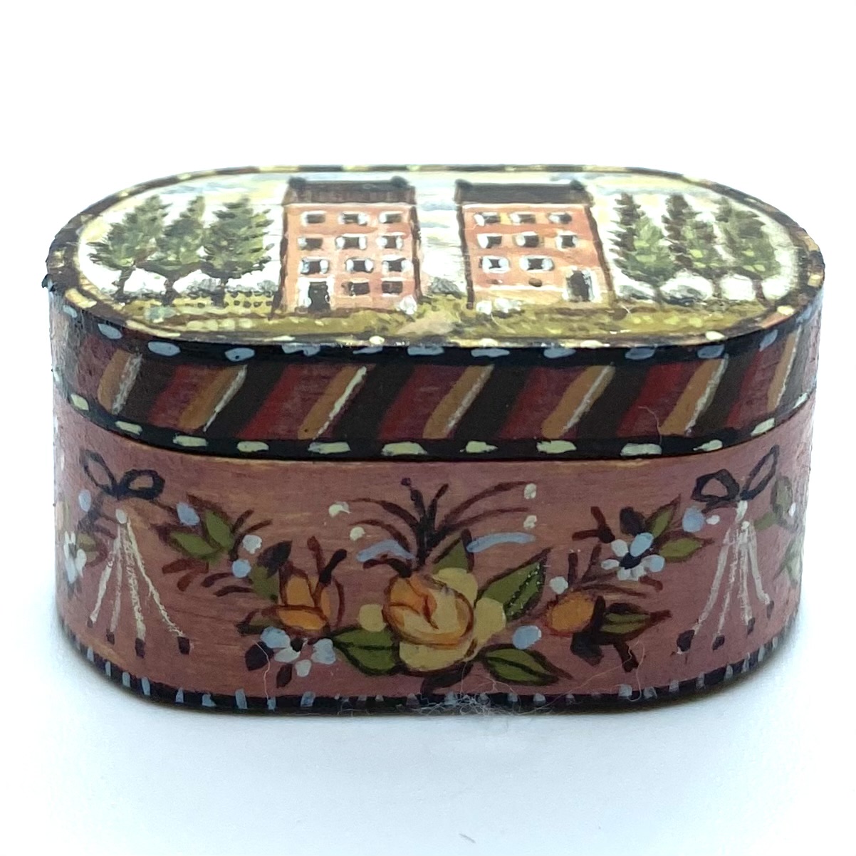 A very lucky eBay buy. The box is beautifully decorated with two symmetrical houses on the lid and garlands of flowers and fruit around the sides.