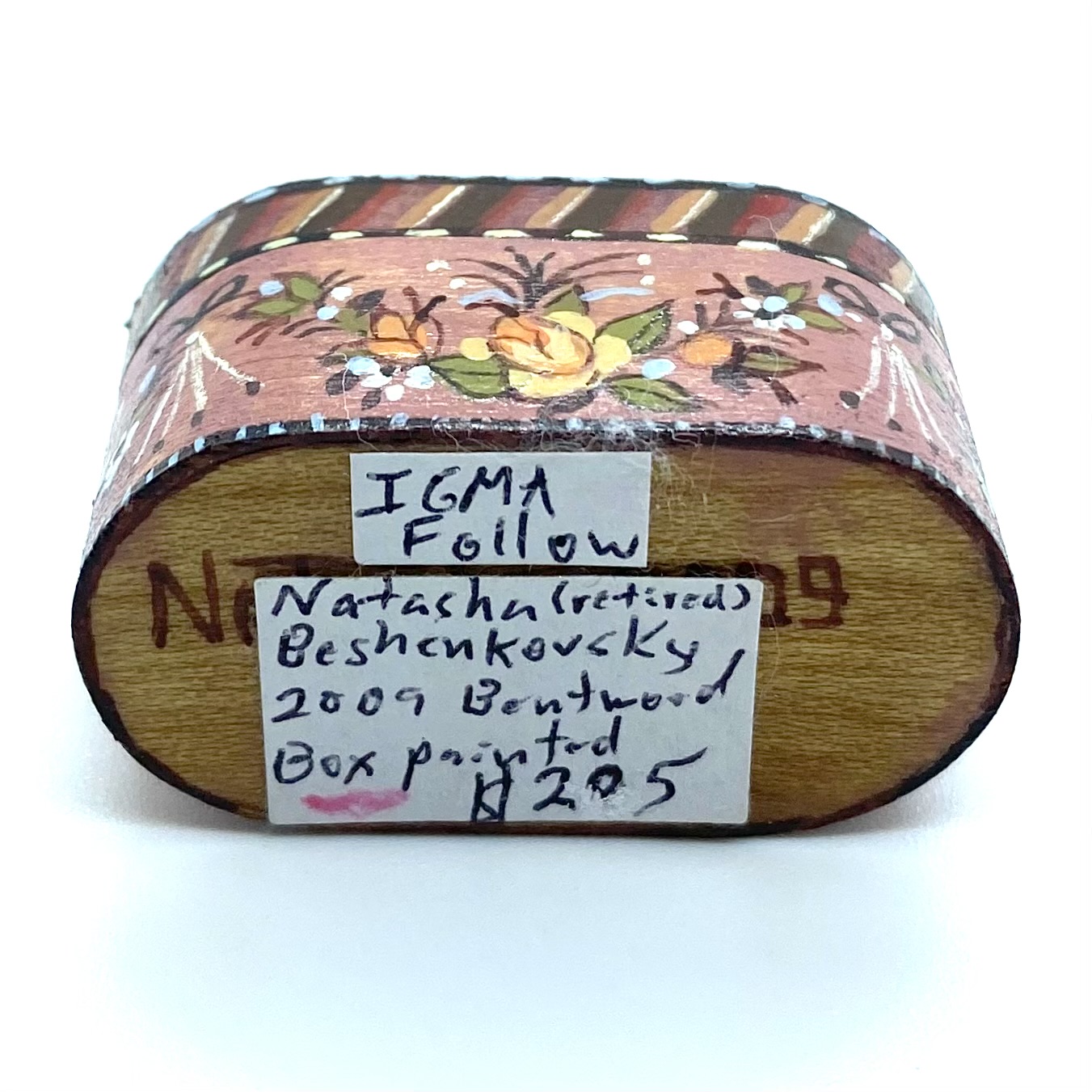 Inscriptions: signed and dated ‘Natasha 2009’ (on the base), hidden (when I bought it) by a later label reading ‘IGMA Fellow Natasha Beshenkovsky (retired) 2009 Bentwood Box painted $205’. That label has now been removed, revealing the signature and date again