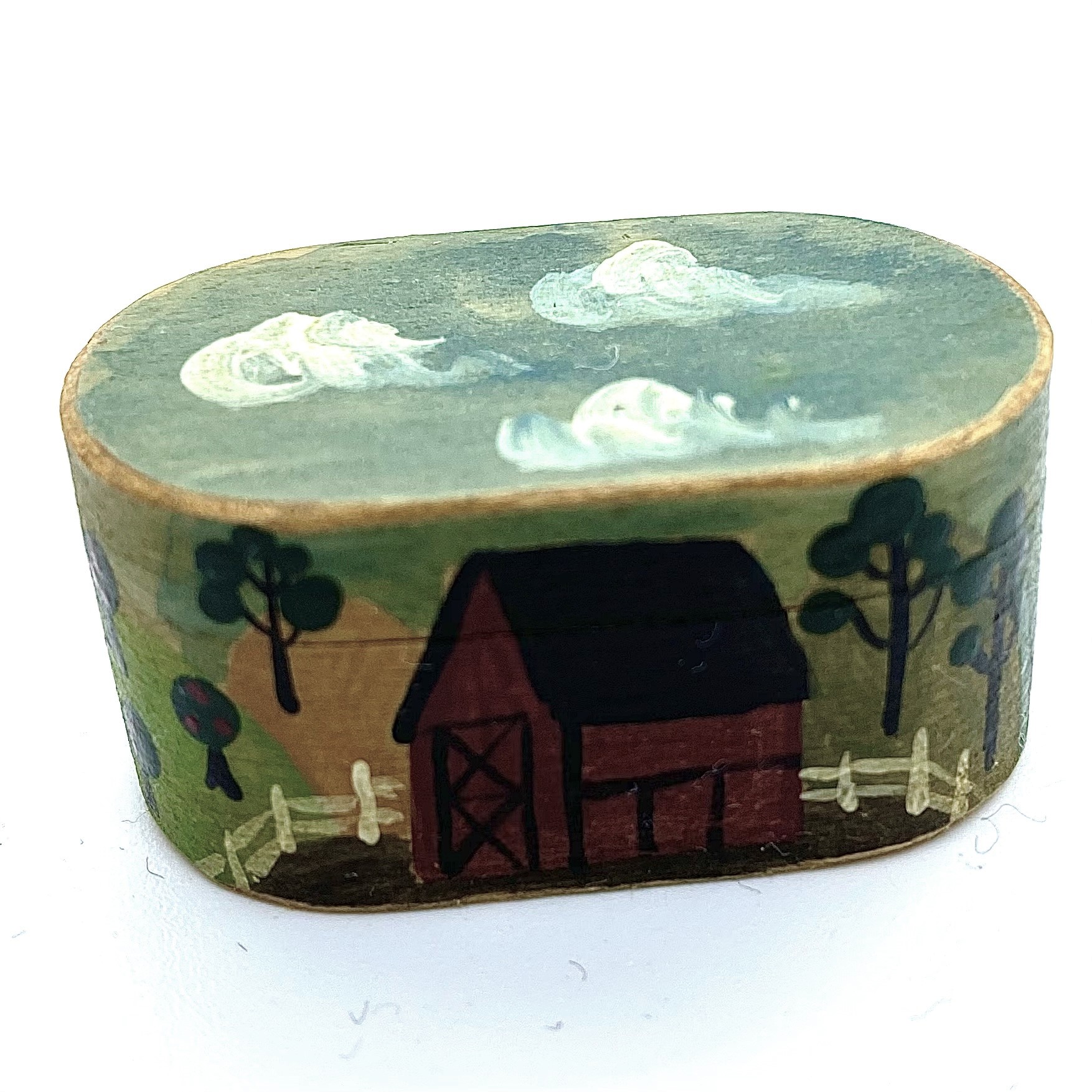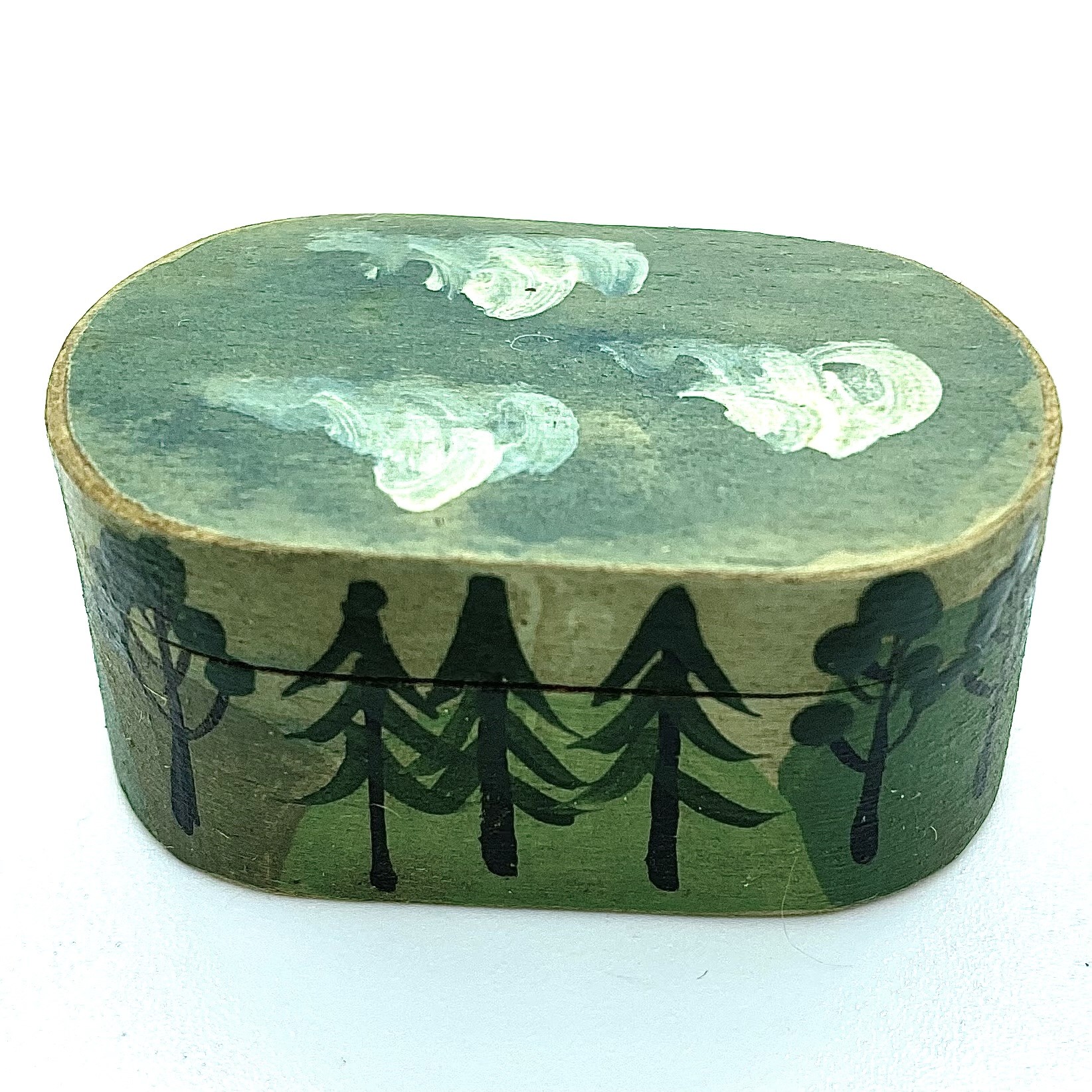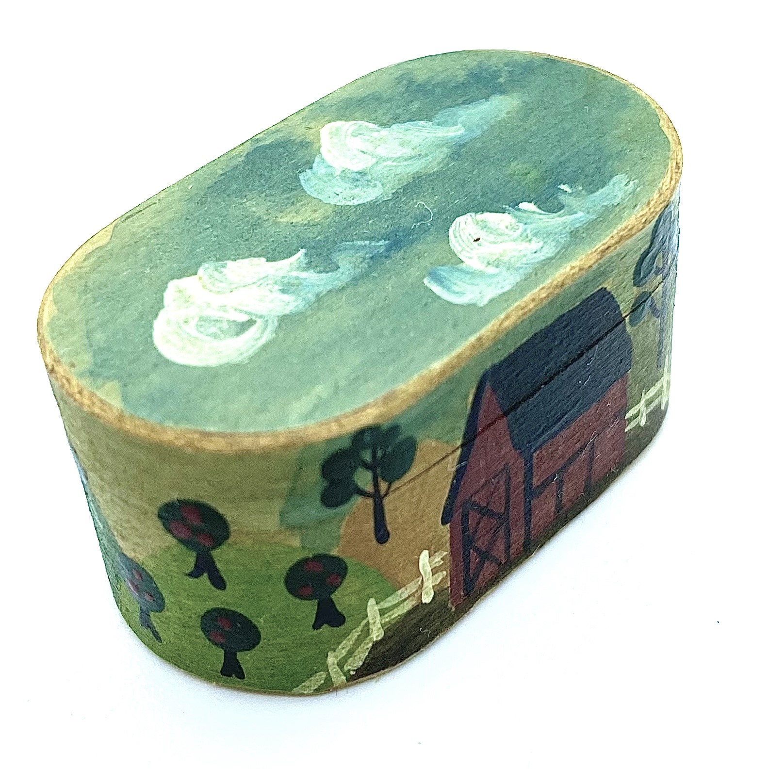 When I say large, of course, everything is relative. This is the larger of two folk-art style boxes created by Al Chandronnait in the Quartermaine Collection. My suggestion of the date, and that the box is painted by Bearly Big Enough, is because this box came as a pair with the other – and that one is both signed and dated by Bearly Big Enough, as well as by Chandronnait. The painting style is so similar, and the choice of motifs so comparable, that it’s very likely that both boxes were created as part of the same partnership. For whatever reason, only Chandronnait signed this second box.