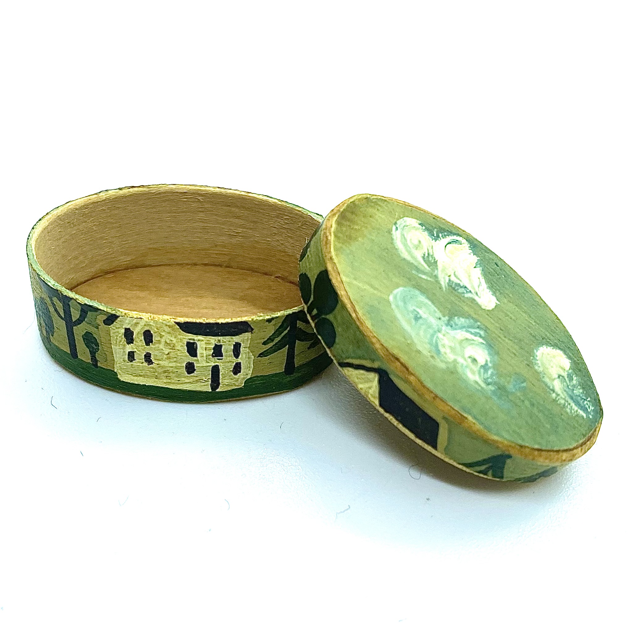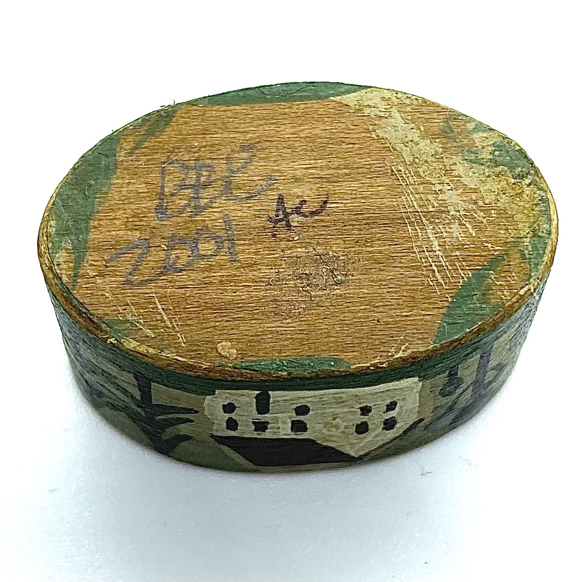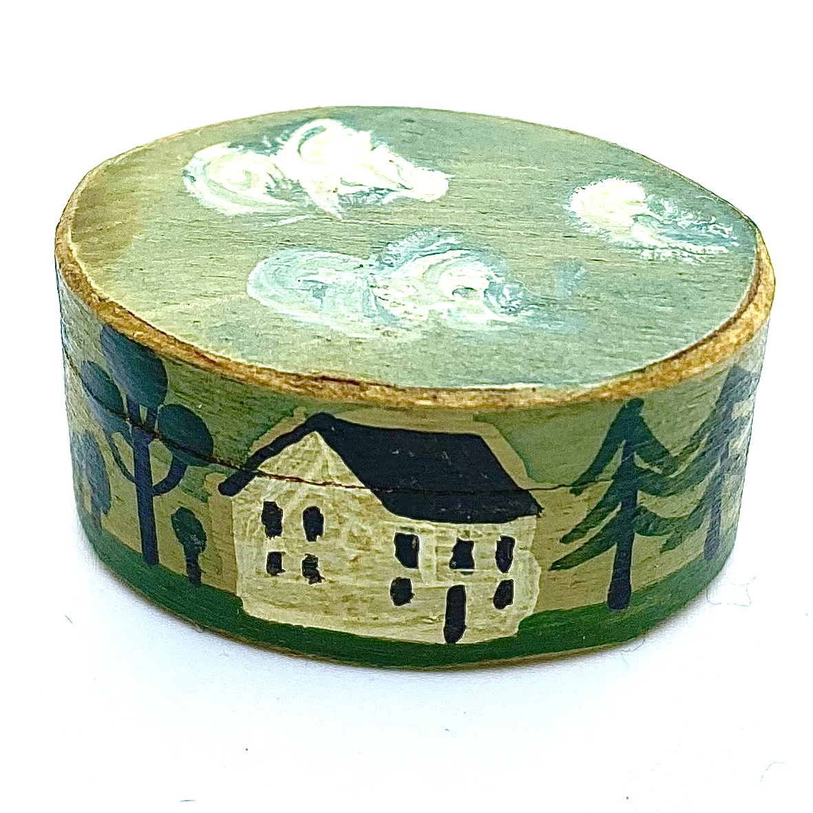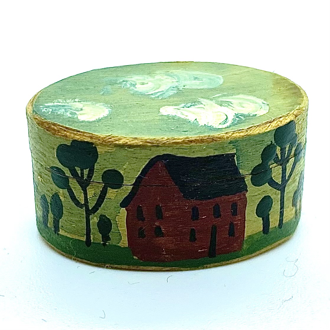 This Shaker-style storage or hat box was made and painted by the gifted mini basketmaker Al Chandronnait. It is one of two such boxes in the collection, very similar in decoration. Unlike the other, this box is signed and dated both by Chandronnait himself and by the painters, Bearly Big Enough, the specialists in wonderful folk-art style miniatures. The charming rustic quality of the boxes, and the colourful farm scenes painted on the sides, mean that they will fit perfectly in the Day Nursery.