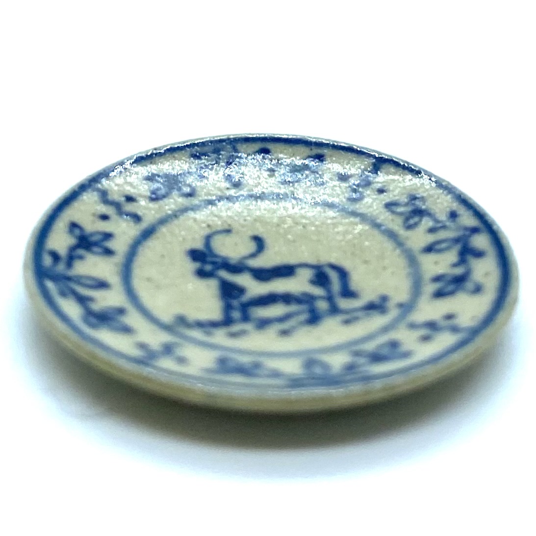 Charming little plate featuring a cow or steer with a decorative border of leaves. Part of a small collection of Graber plates which will be displayed on the dresser in the Servants’ Hall, in imitation of the blue-and-white porcelain shown upstairs in the Dining Room.