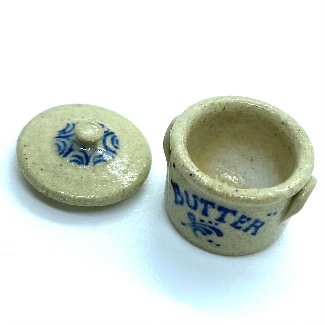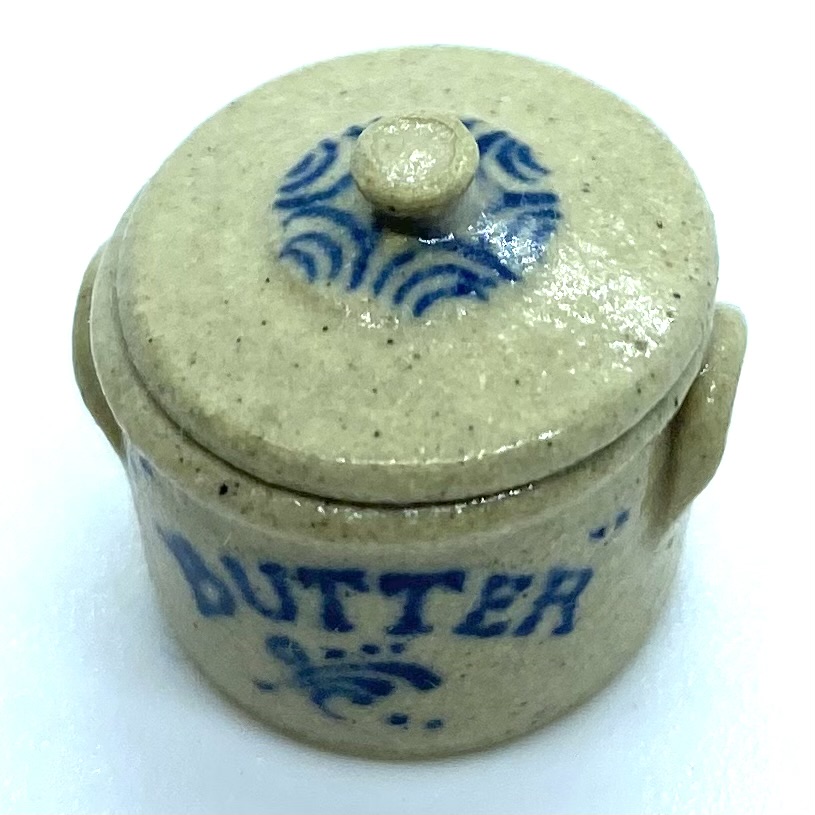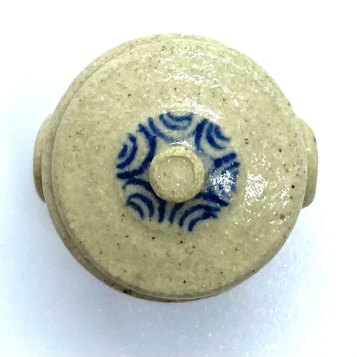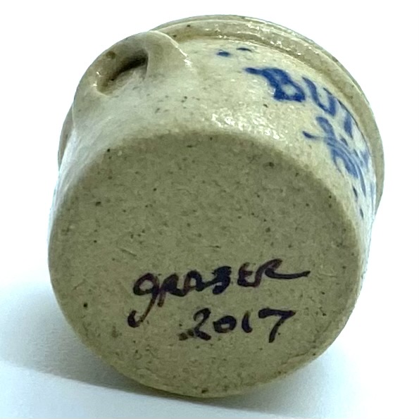 I can just imagine this little butter dish sitting on a tiled shelf in a cold-room. The thick stoneware will certainly keep the butter nice and cool. As ever with Jane’s works, it’s beautifully decorated, with an abstract spray pattern on the front and a pattern of concentric arches around the knob on the lid. It’s signed and dated ‘Graber 2017’ on the base.