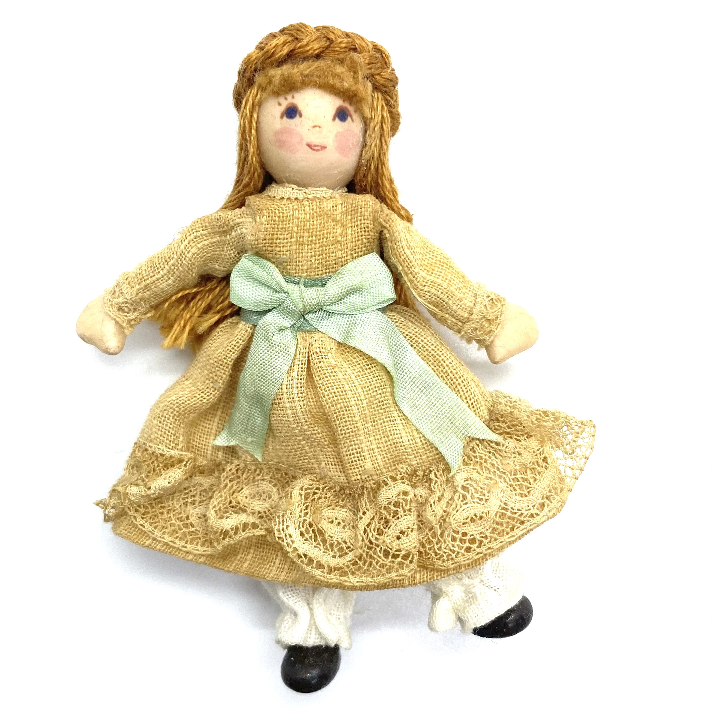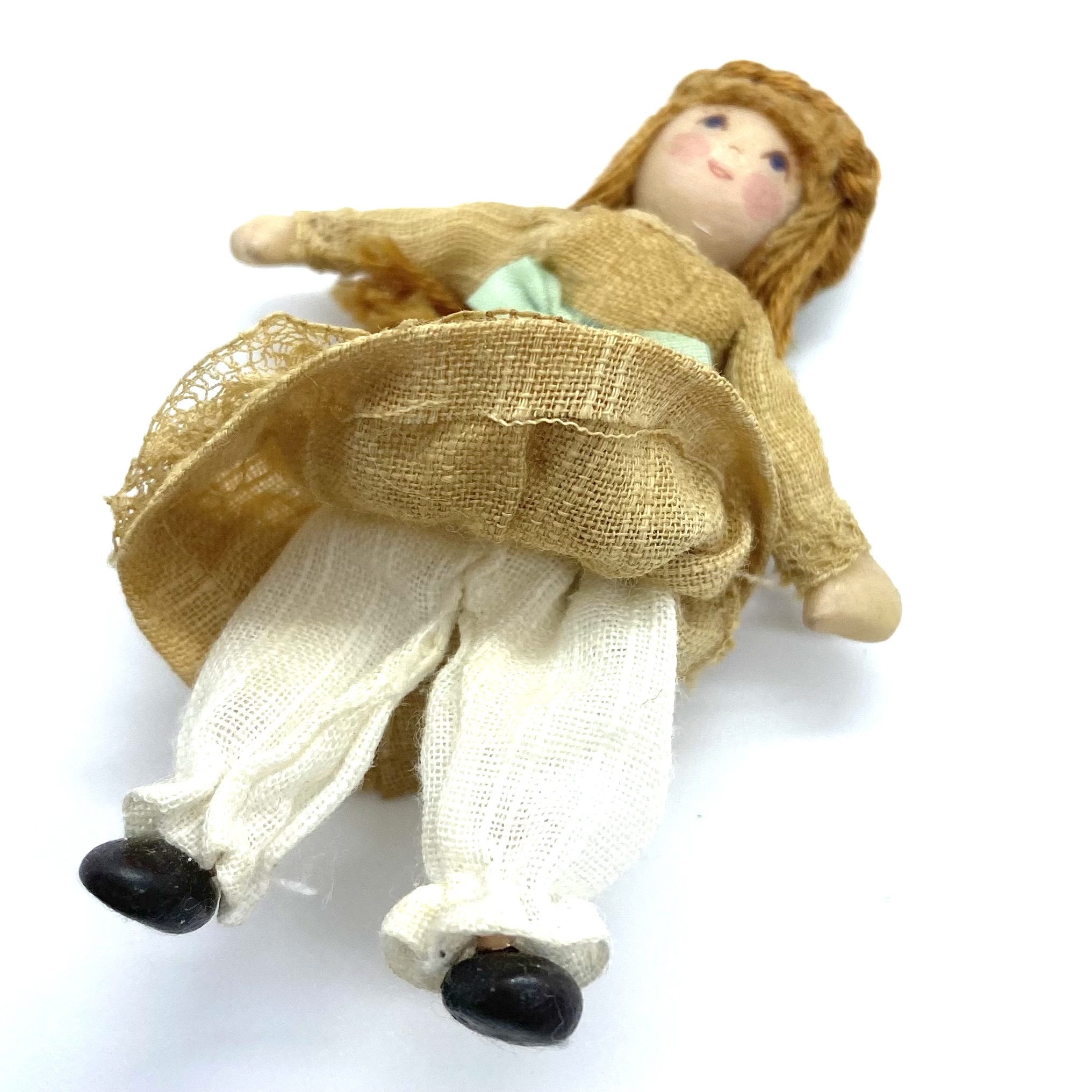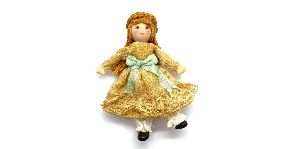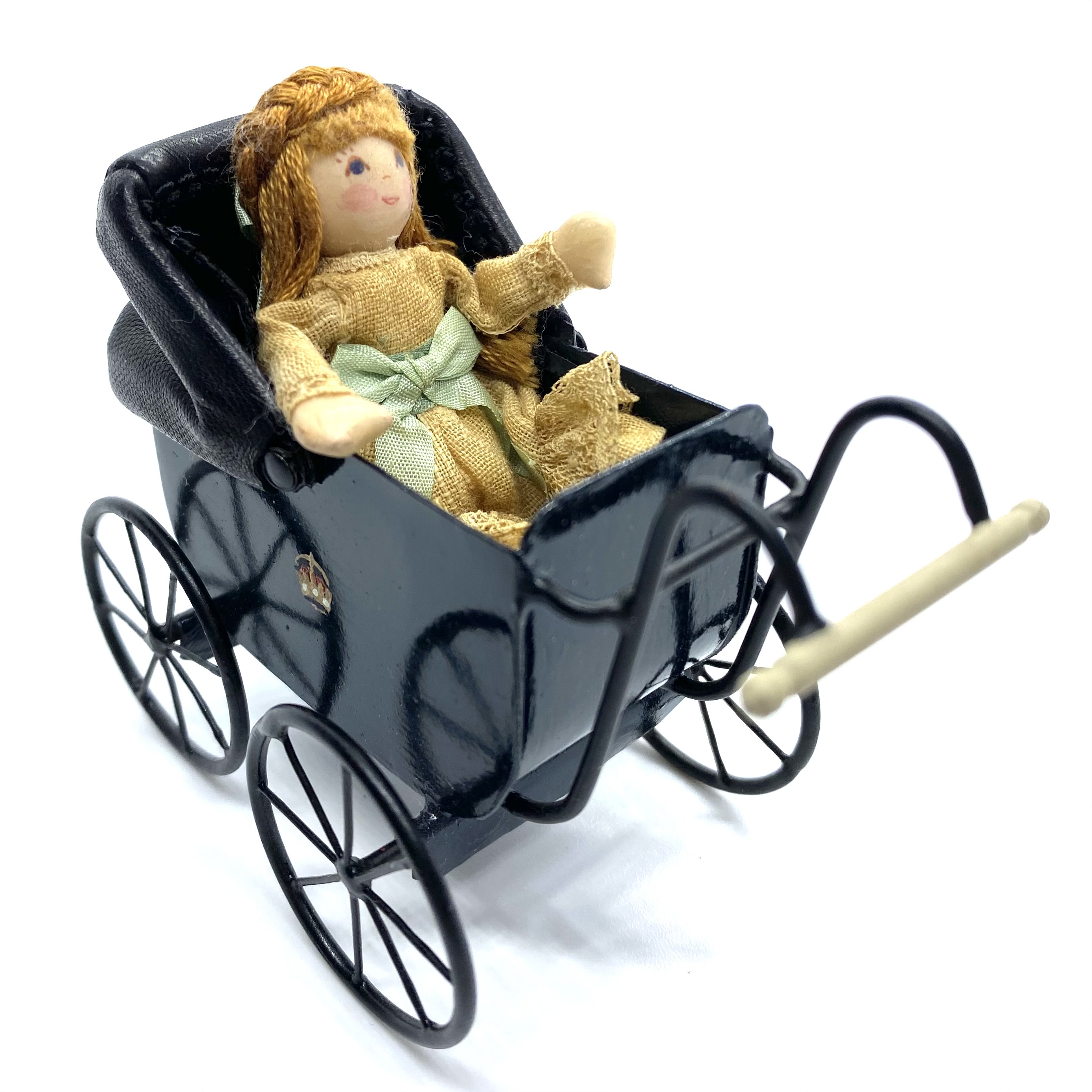 Unfortunately we don’t know who made this delightful little doll, with her big smile, whom we bought on eBay. She wears an ochre cotton dress trimmed with lace, and a blue silk ribbon around her waist, which matches the bow in her hair. Underneath, she has a pair of white cotton bloomers and black shoes. Rosie is among the favourite toys of the family and moves happily between Night Nursery and Day Nursery. By night, she’s ready to be cuddled and to guard against nightmares while, by day, she’s often to be found being wheeled around the Day Nursery in the dolls’ pram.