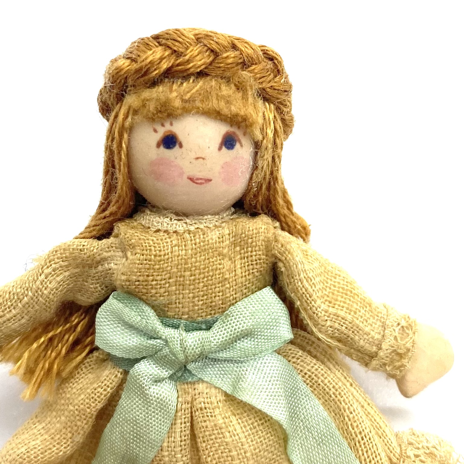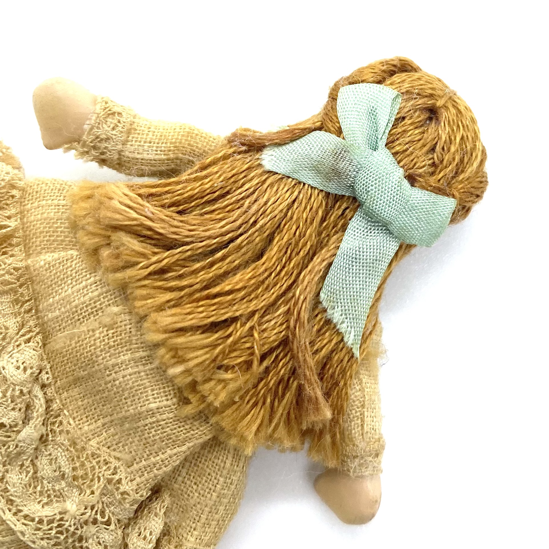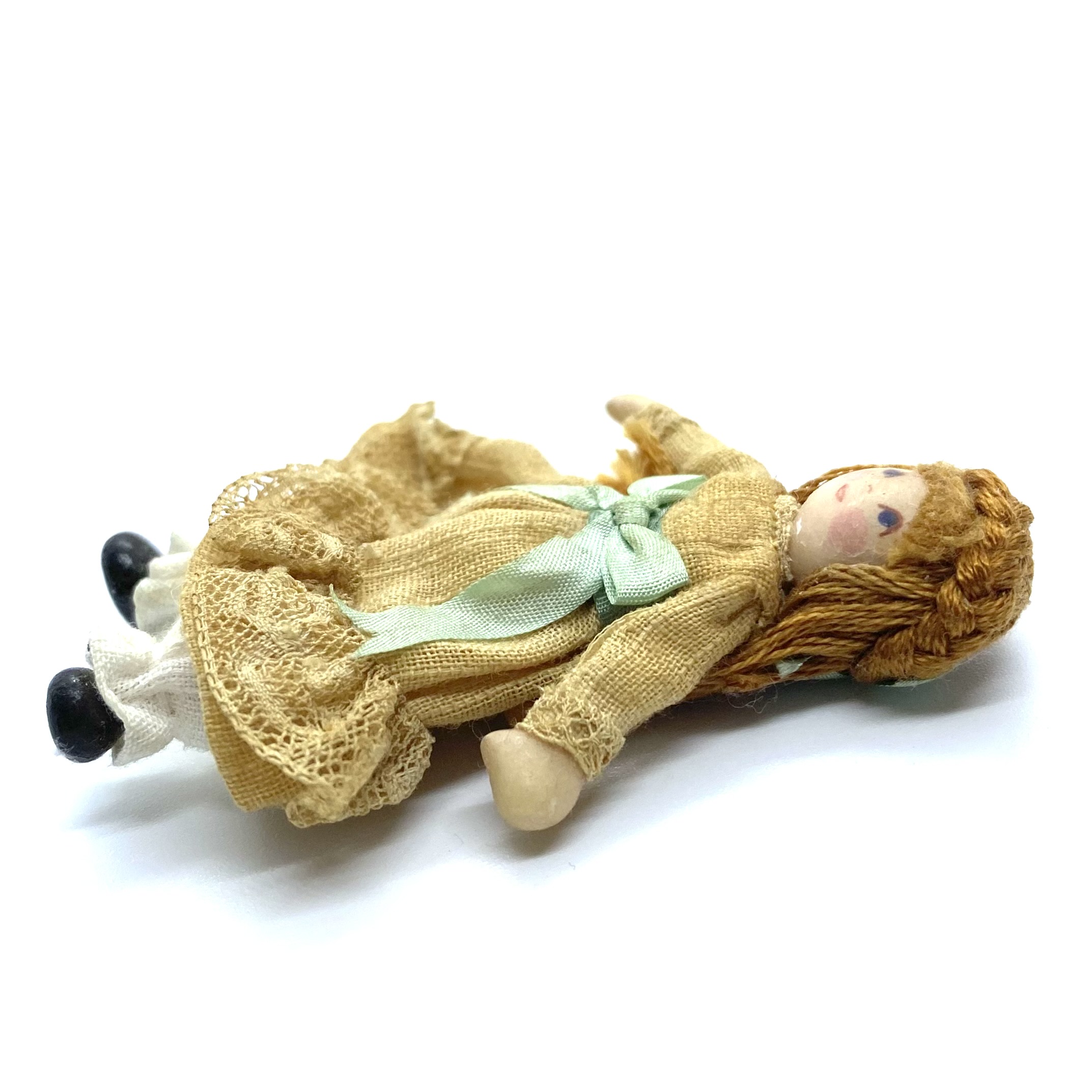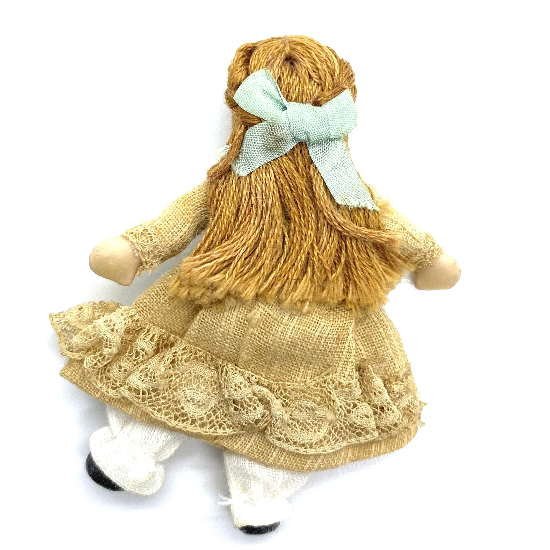 Unfortunately we don’t know who made this delightful little doll, with her big smile, whom we bought on eBay. She wears an ochre cotton dress trimmed with lace, and a blue silk ribbon around her waist, which matches the bow in her hair. Underneath, she has a pair of white cotton bloomers and black shoes. Rosie is among the favourite toys of the family and moves happily between Night Nursery and Day Nursery. By night, she’s ready to be cuddled and to guard against nightmares while, by day, she’s often to be found being wheeled around the Day Nursery in the dolls’ pram.
