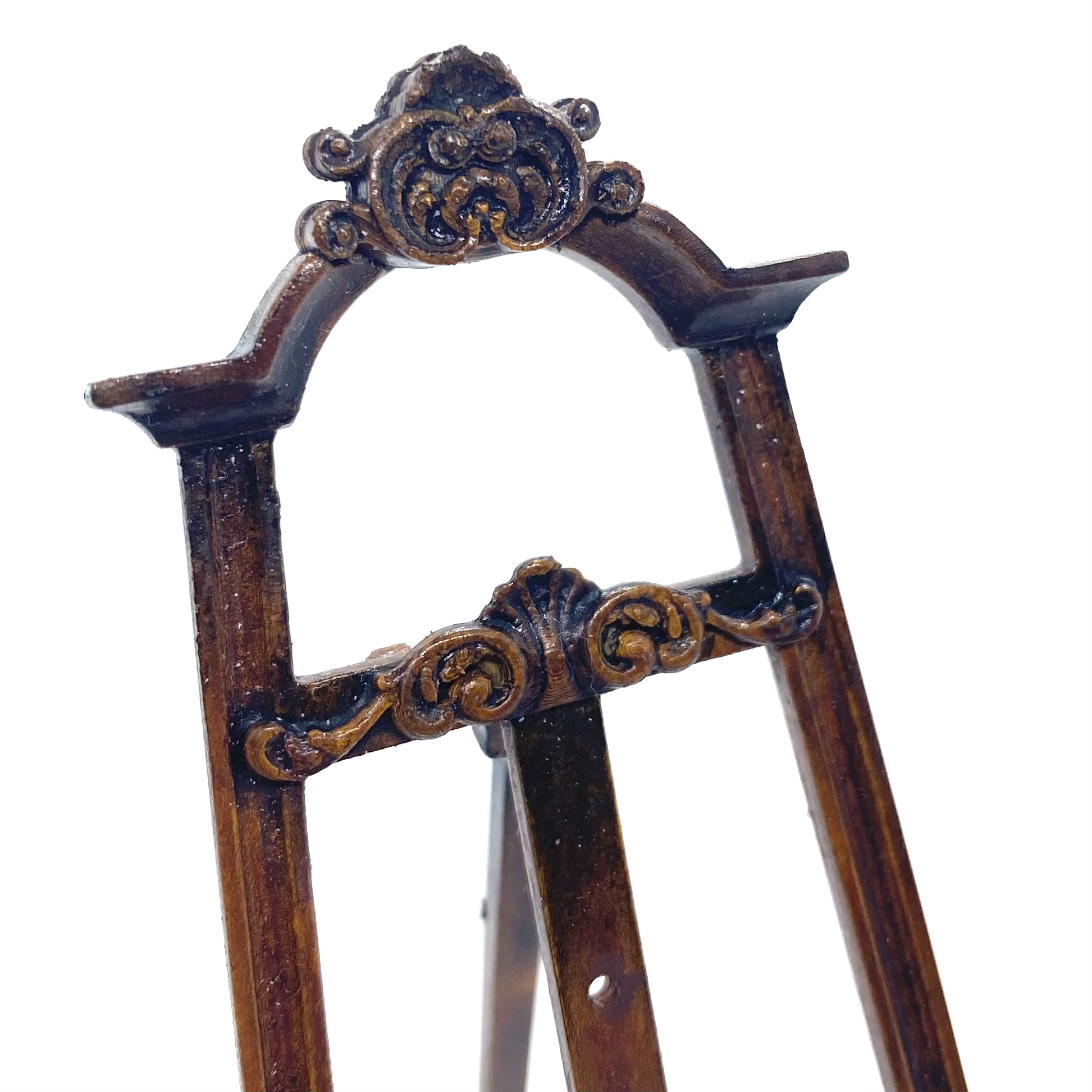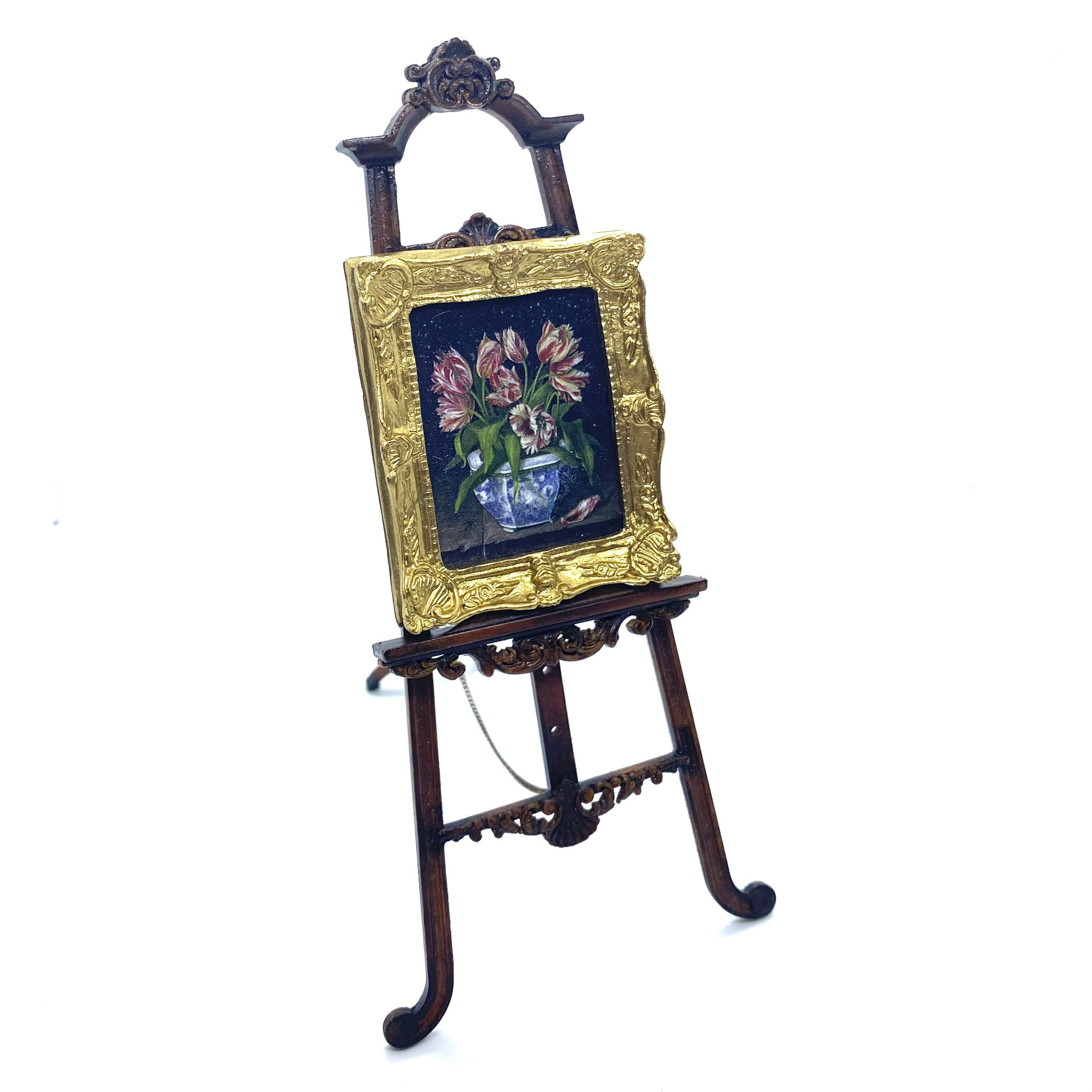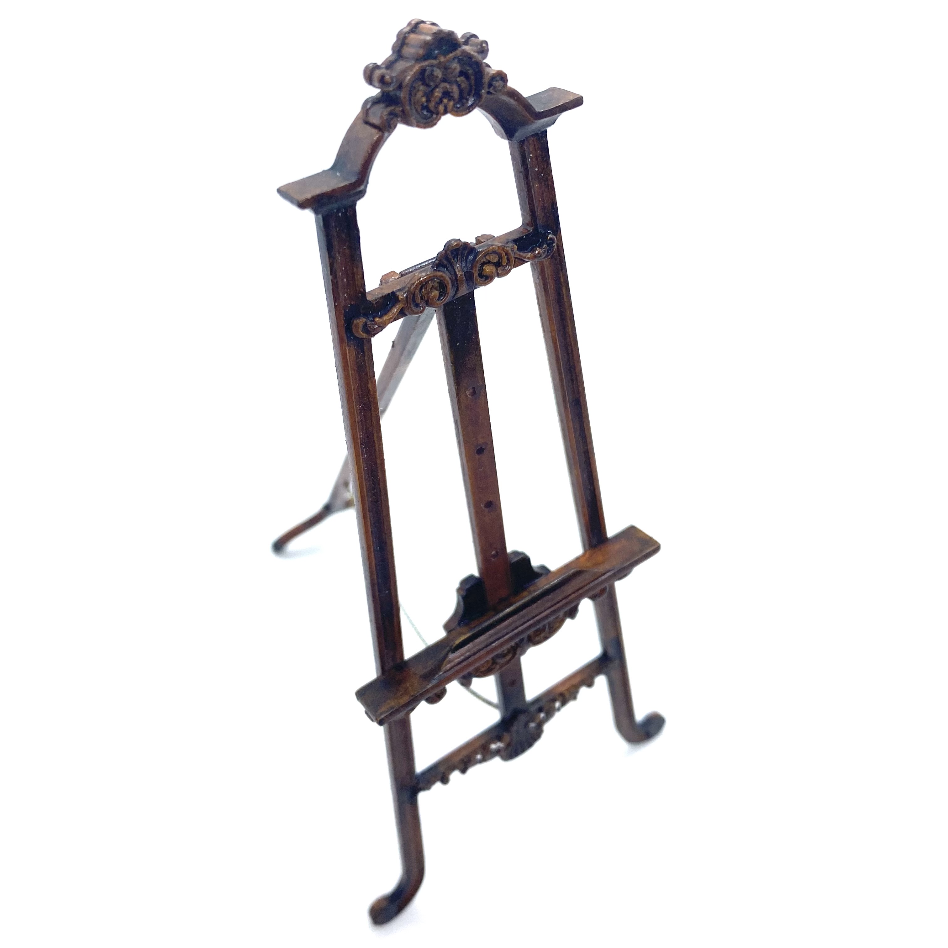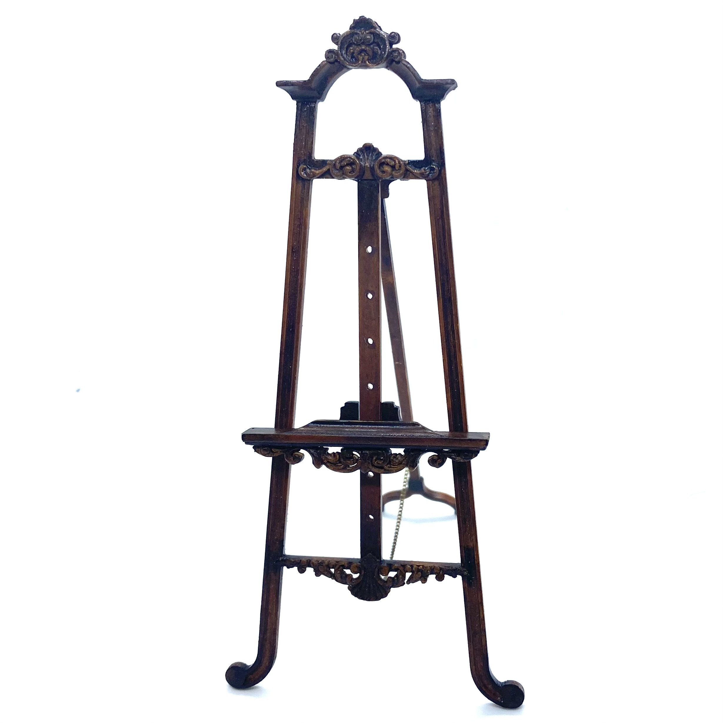 Another stupendous piece of furniture by Erzsébet Bodzas of Hungarian Miniatures. This easel is not only decorated with beautiful carvings, but also has a delicate chain attaching the back leg to the main body of the stand. Furthermore, the picture-rest can be moved up and down, should you wish, by unscrewing a tiny nut on the back to release the bolt, which can then be pegged into any one of a number of different holes, depending on the size of the frame to be displayed. Attention to detail always delights me and this is a stunner.