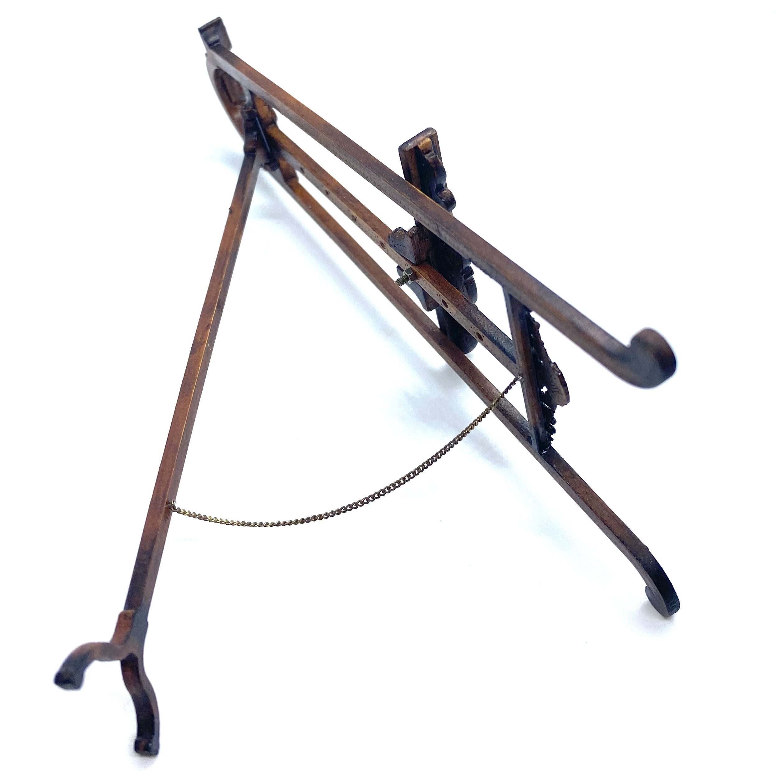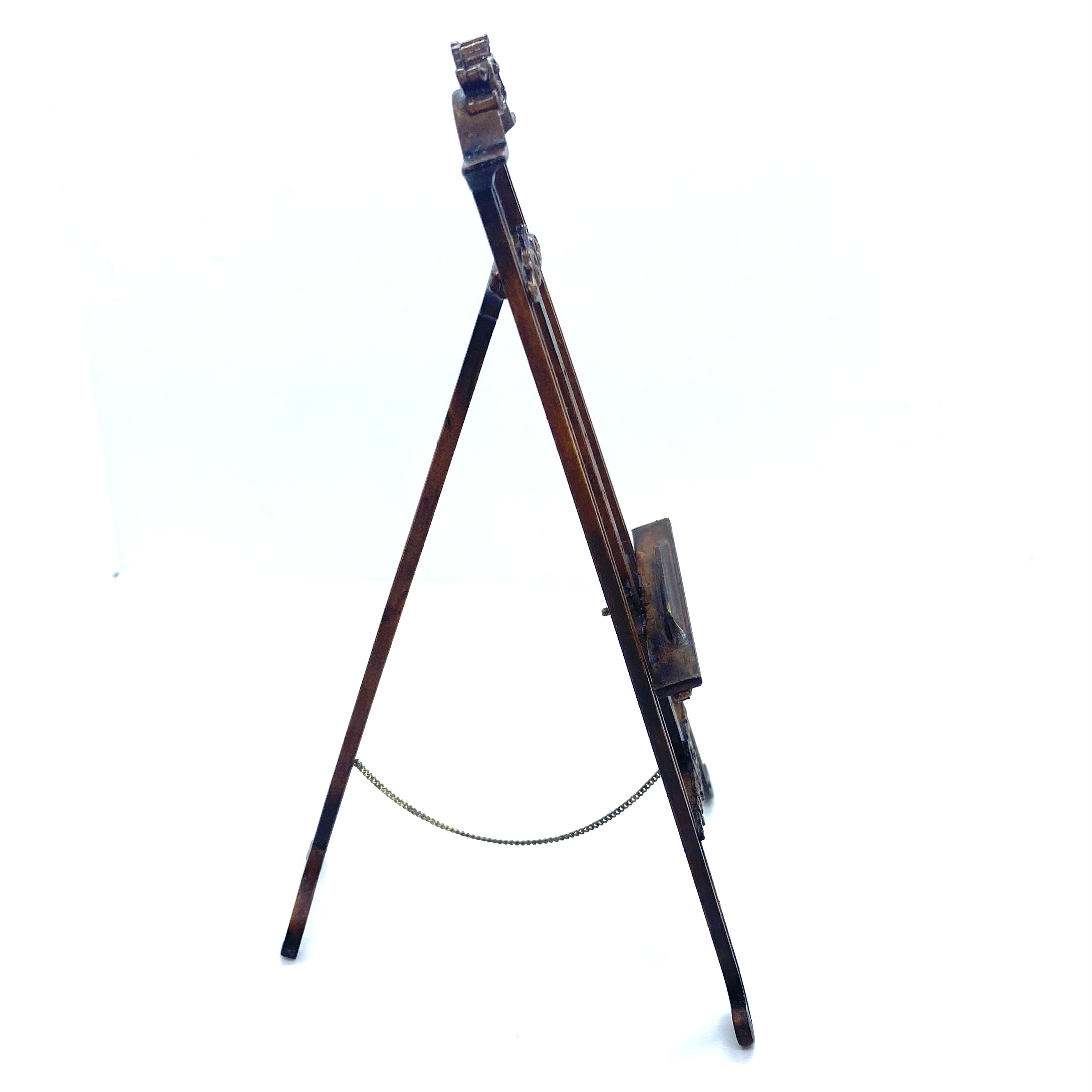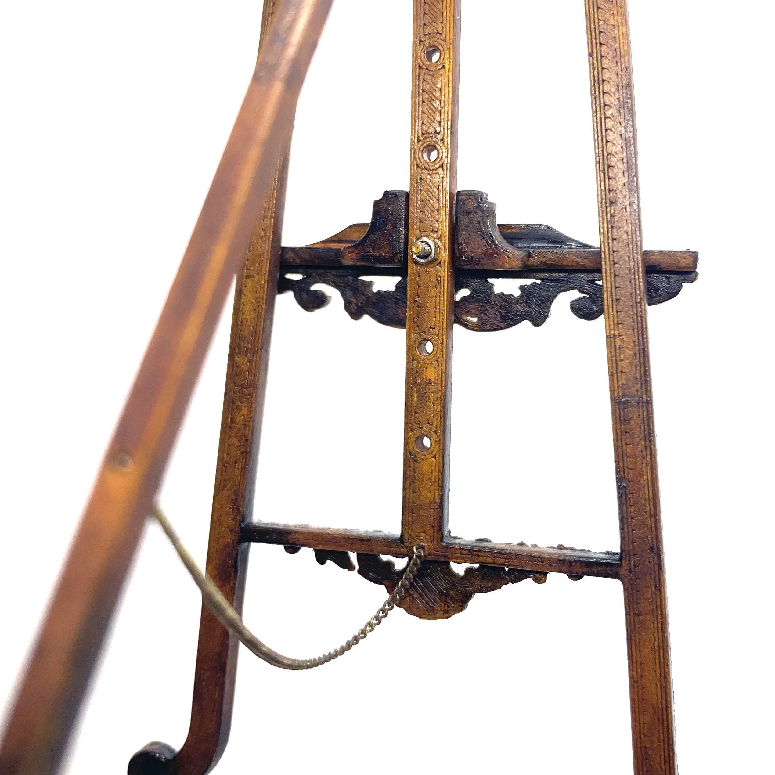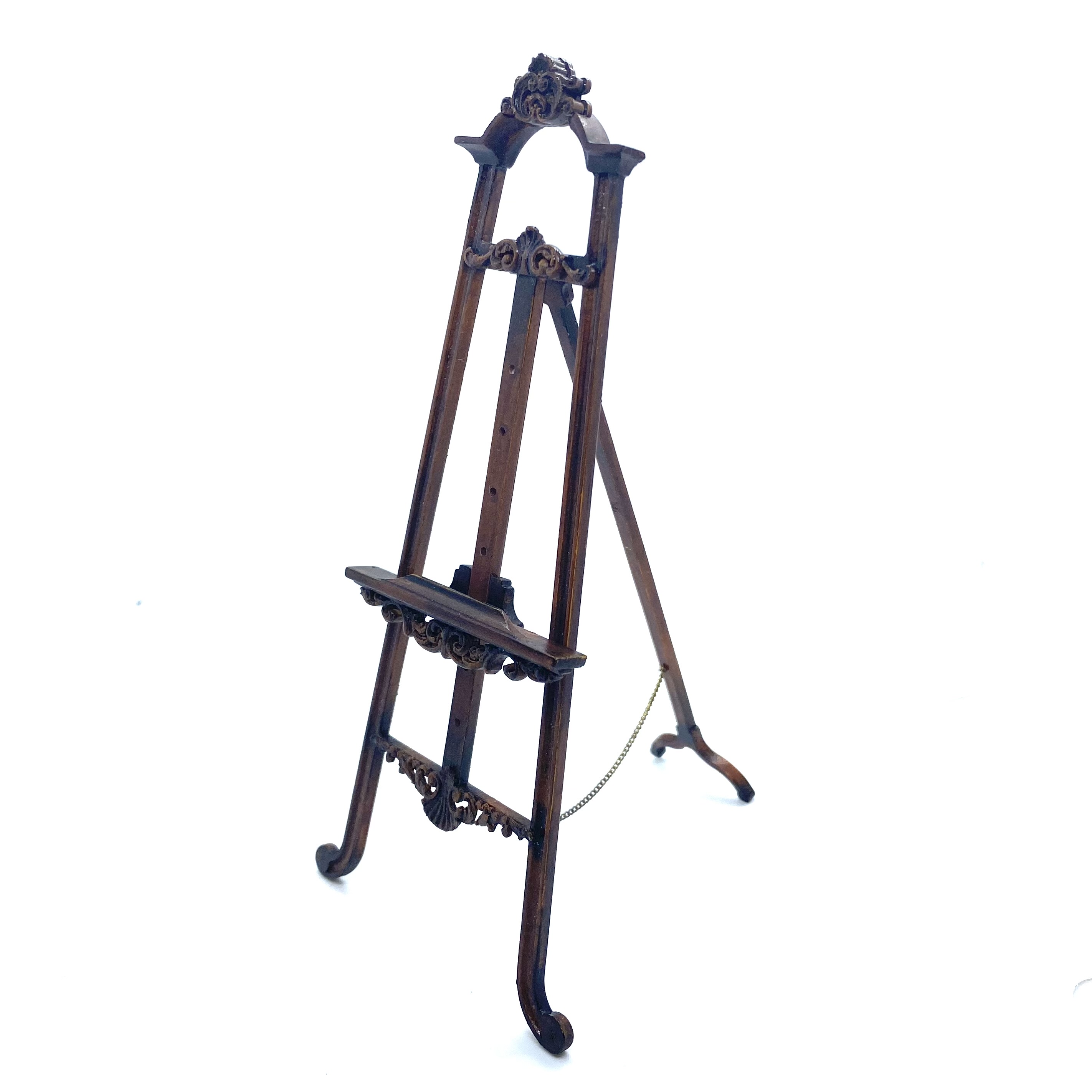 Another stupendous piece of furniture by Erzsébet Bodzas of Hungarian Miniatures. This easel is not only decorated with beautiful carvings, but also has a delicate chain attaching the back leg to the main body of the stand. Furthermore, the picture-rest can be moved up and down, should you wish, by unscrewing a tiny nut on the back to release the bolt, which can then be pegged into any one of a number of different holes, depending on the size of the frame to be displayed. Attention to detail always delights me and this is a stunner.