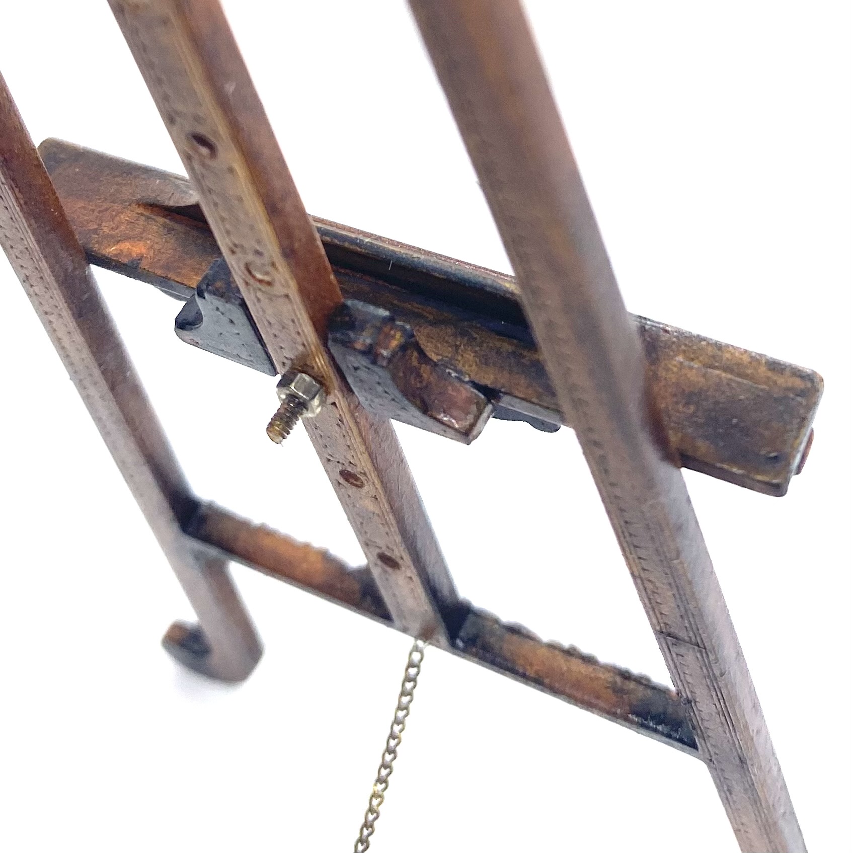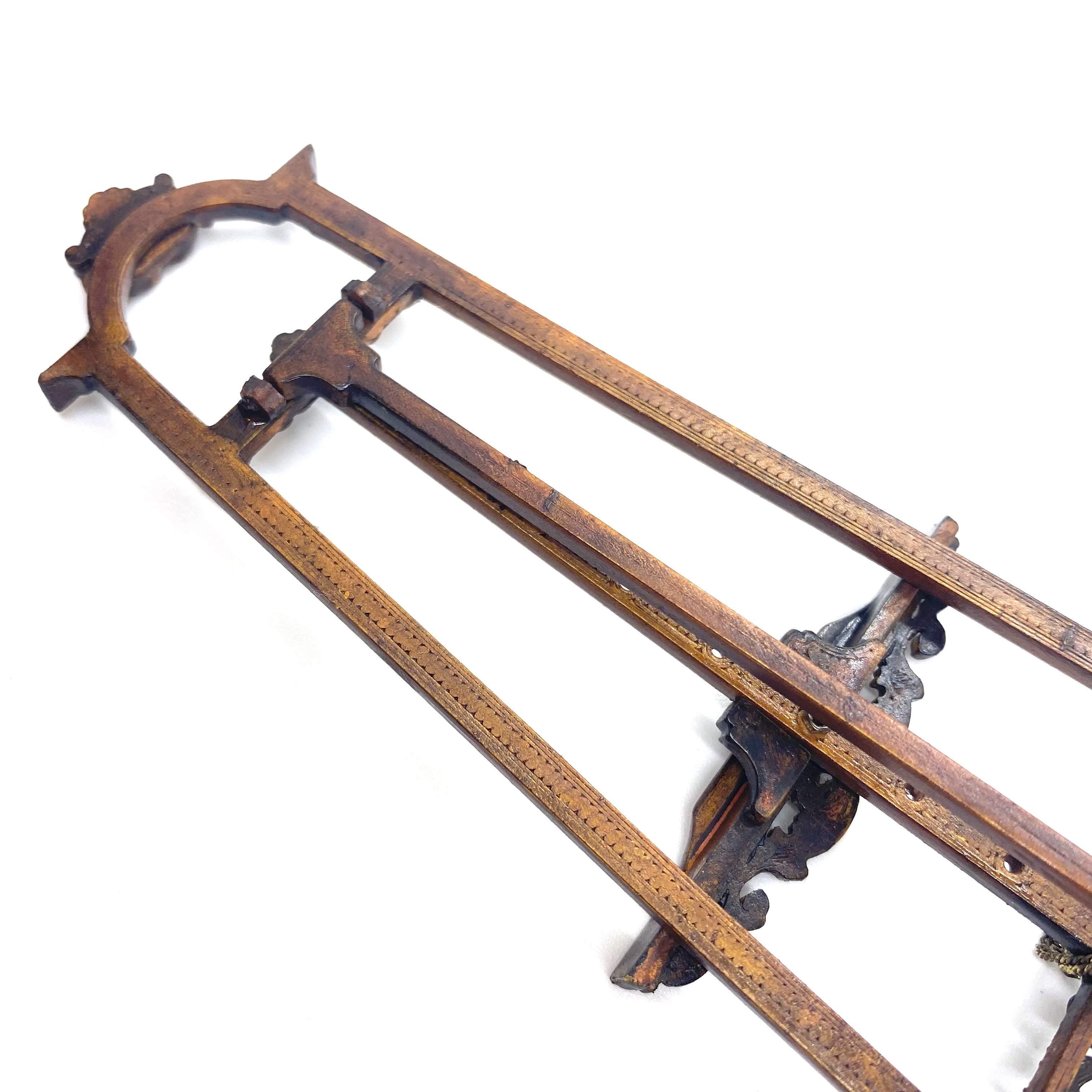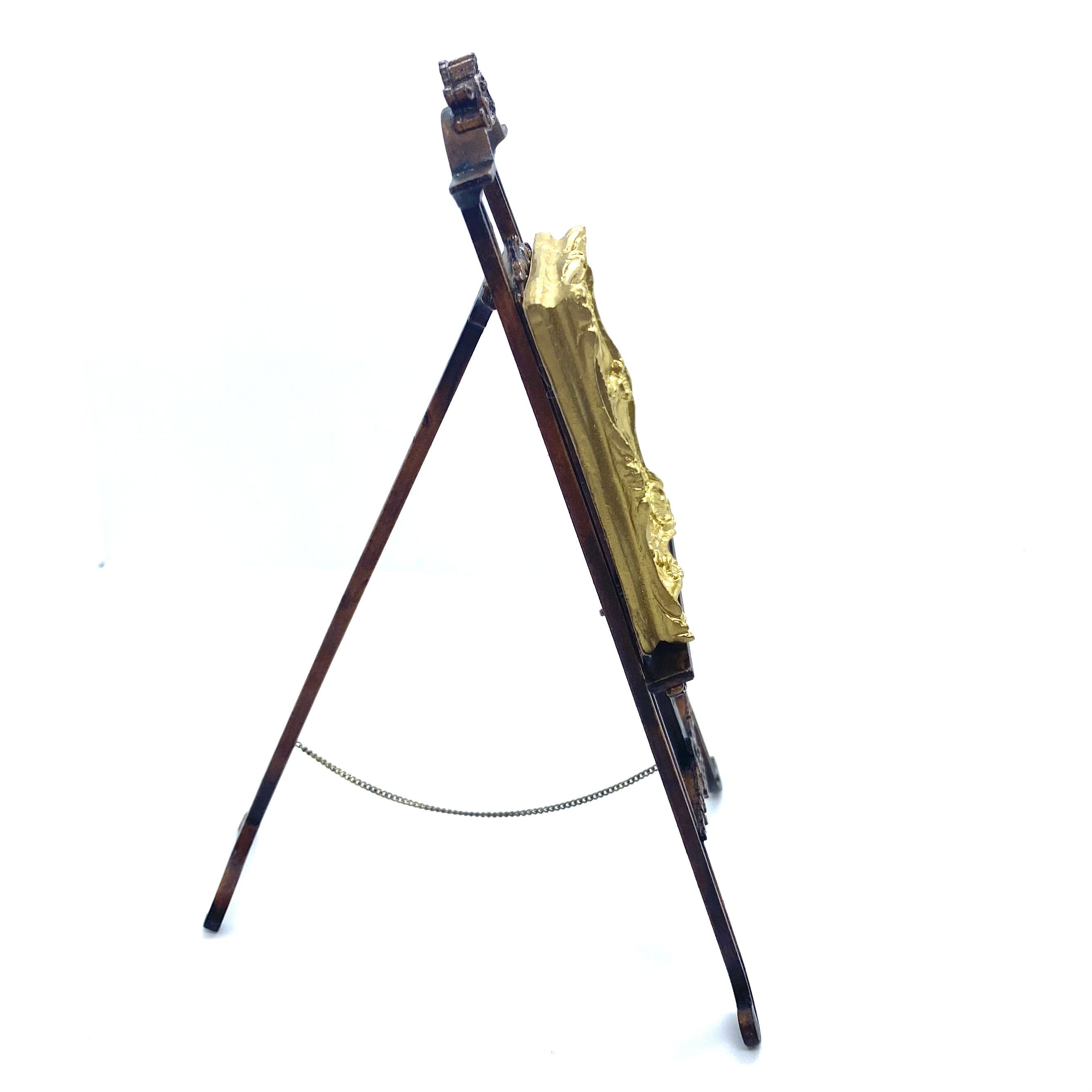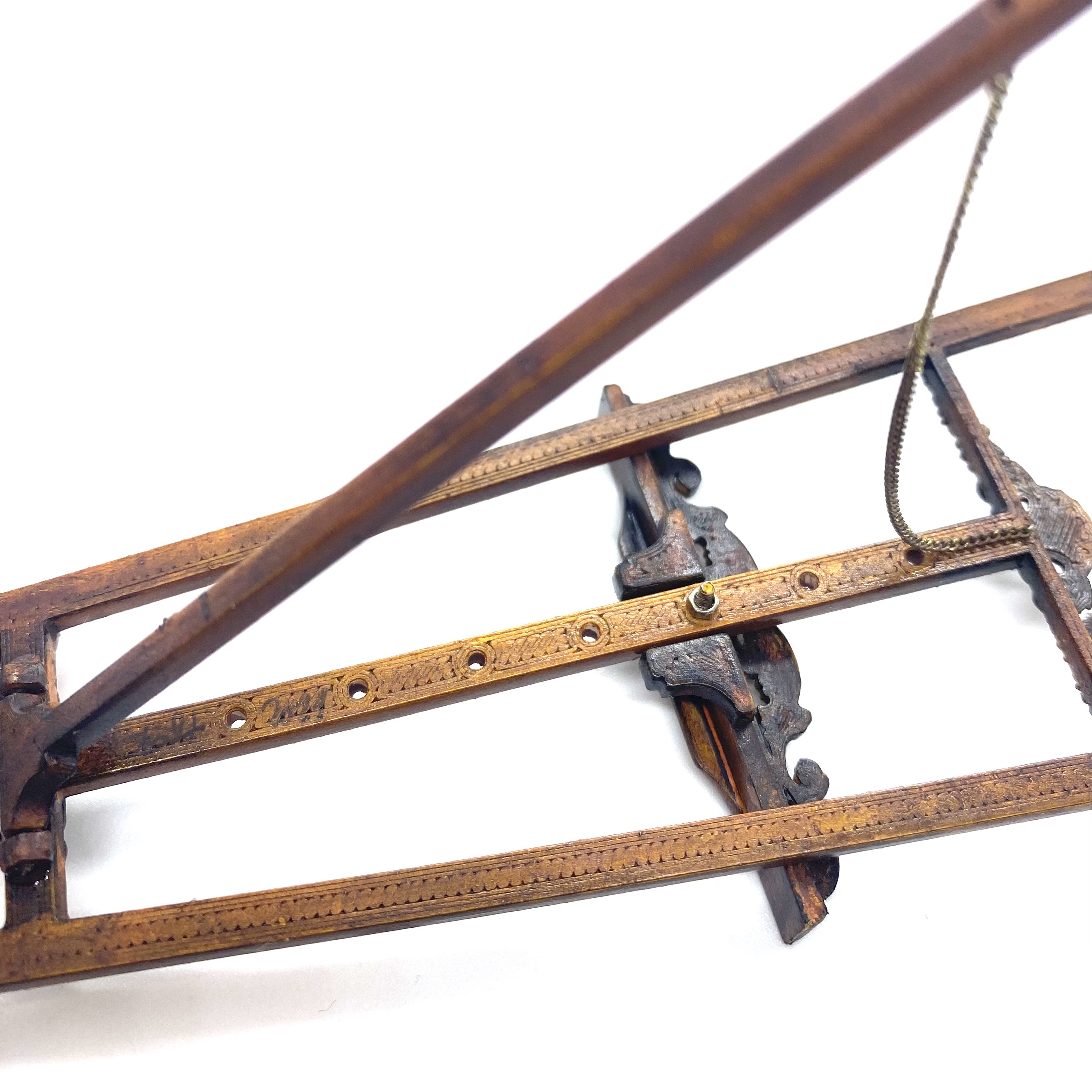 Another stupendous piece of furniture by Erzsébet Bodzas of Hungarian Miniatures. This easel is not only decorated with beautiful carvings, but also has a delicate chain attaching the back leg to the main body of the stand. Furthermore, the picture-rest can be moved up and down, should you wish, by unscrewing a tiny nut on the back to release the bolt, which can then be pegged into any one of a number of different holes, depending on the size of the frame to be displayed. Attention to detail always delights me and this is a stunner.