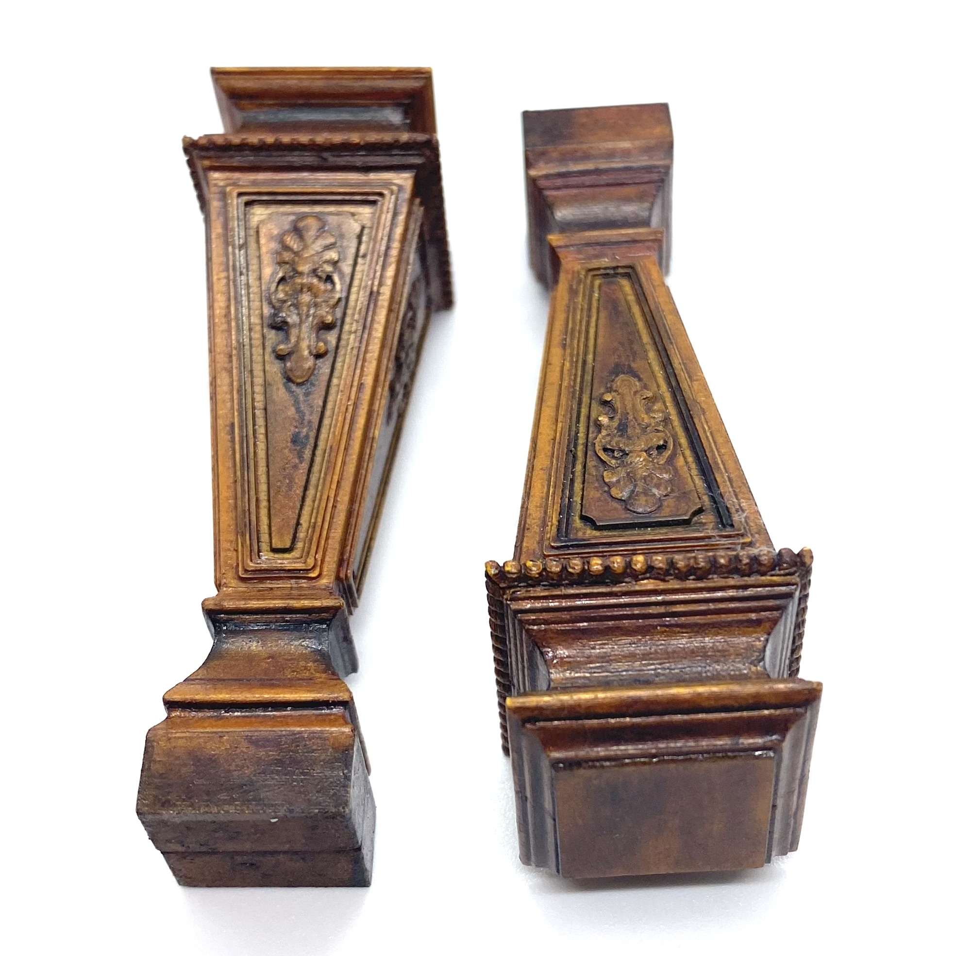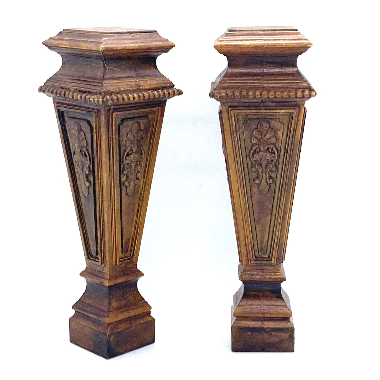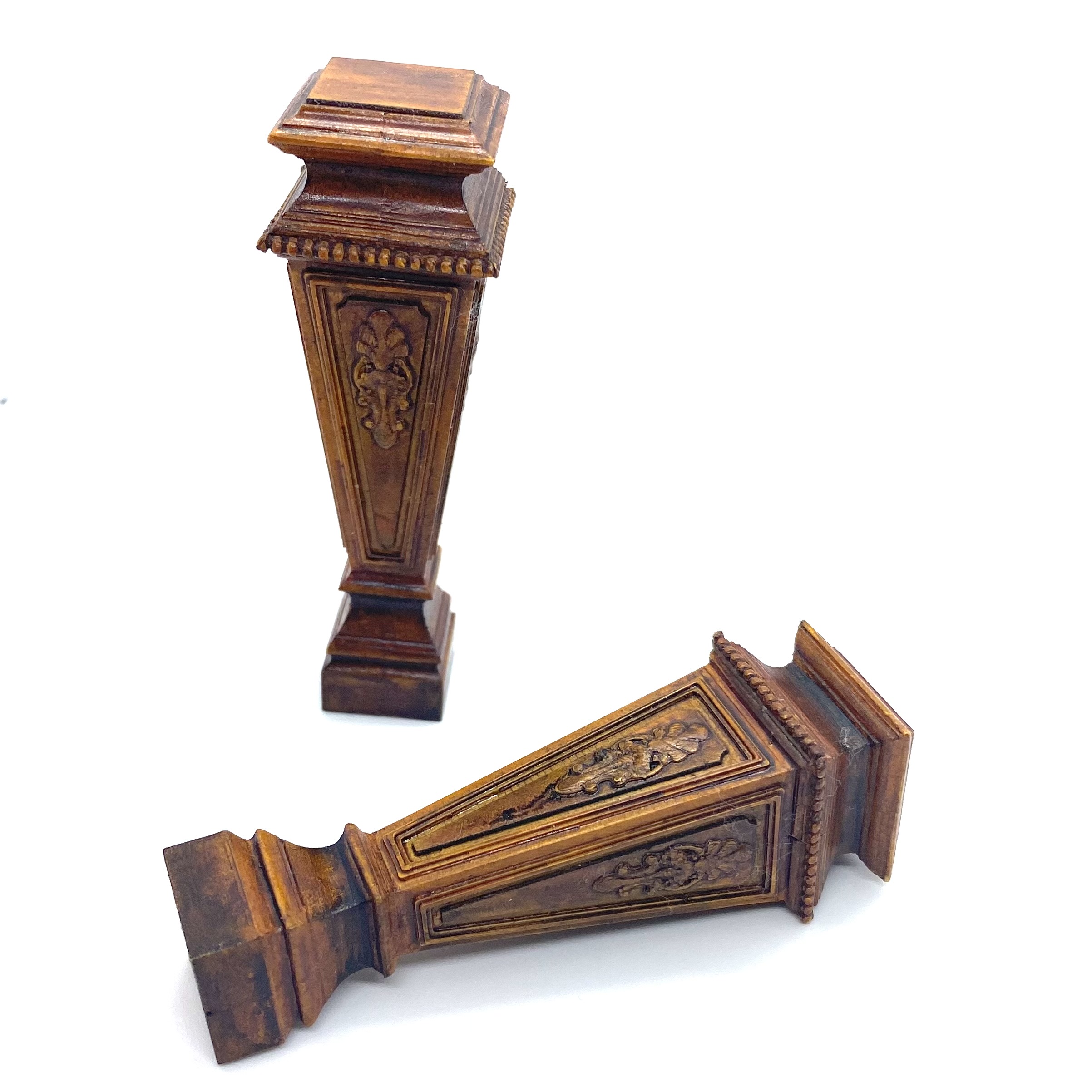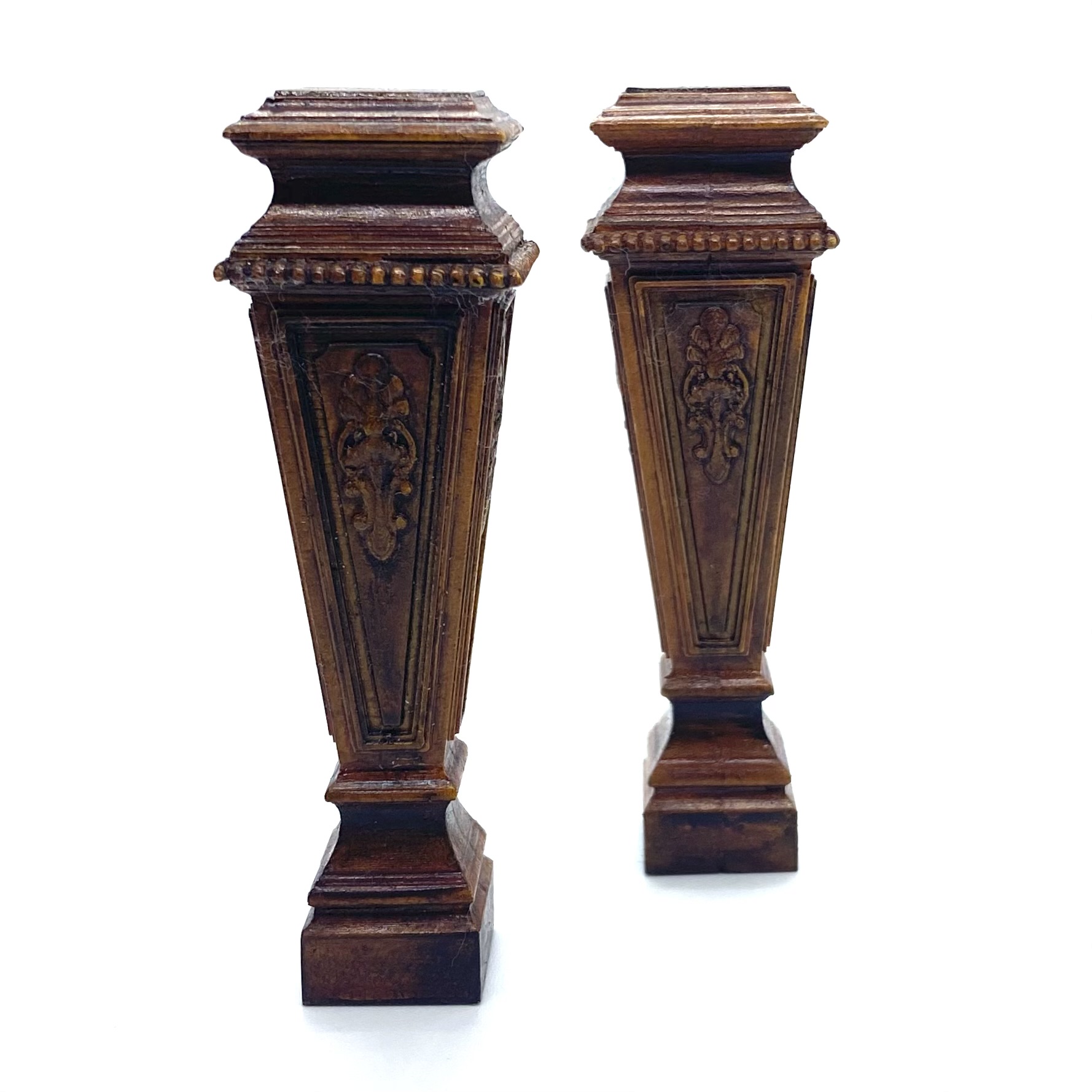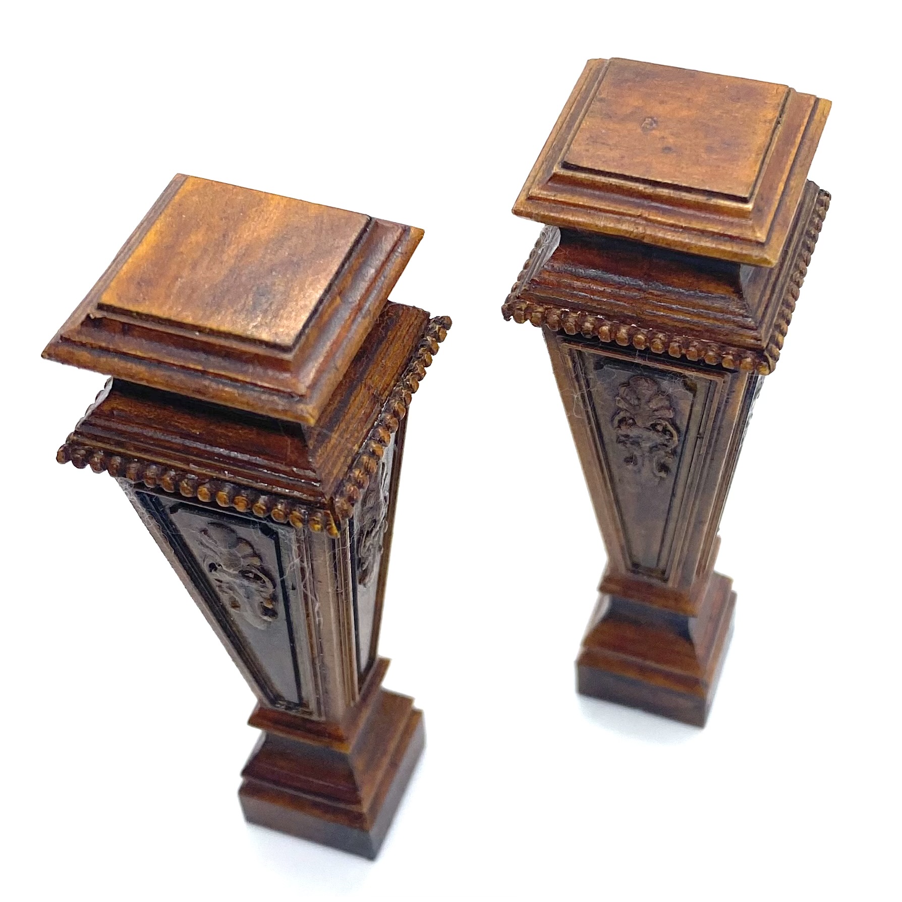 These imposing pedestals would look splendid flanking the bottom of the grand staircase in the Entrance Hall, set with elaborate floral arrangements. Alternatively, they could be displayed in the Library, bearing classical busts (see below). The work of the talented Erzsébet Bodzas of Hungarian Miniatures, they’re full of detail, from the acanthus relief on each of the four sides to the beaded decoration around the top.