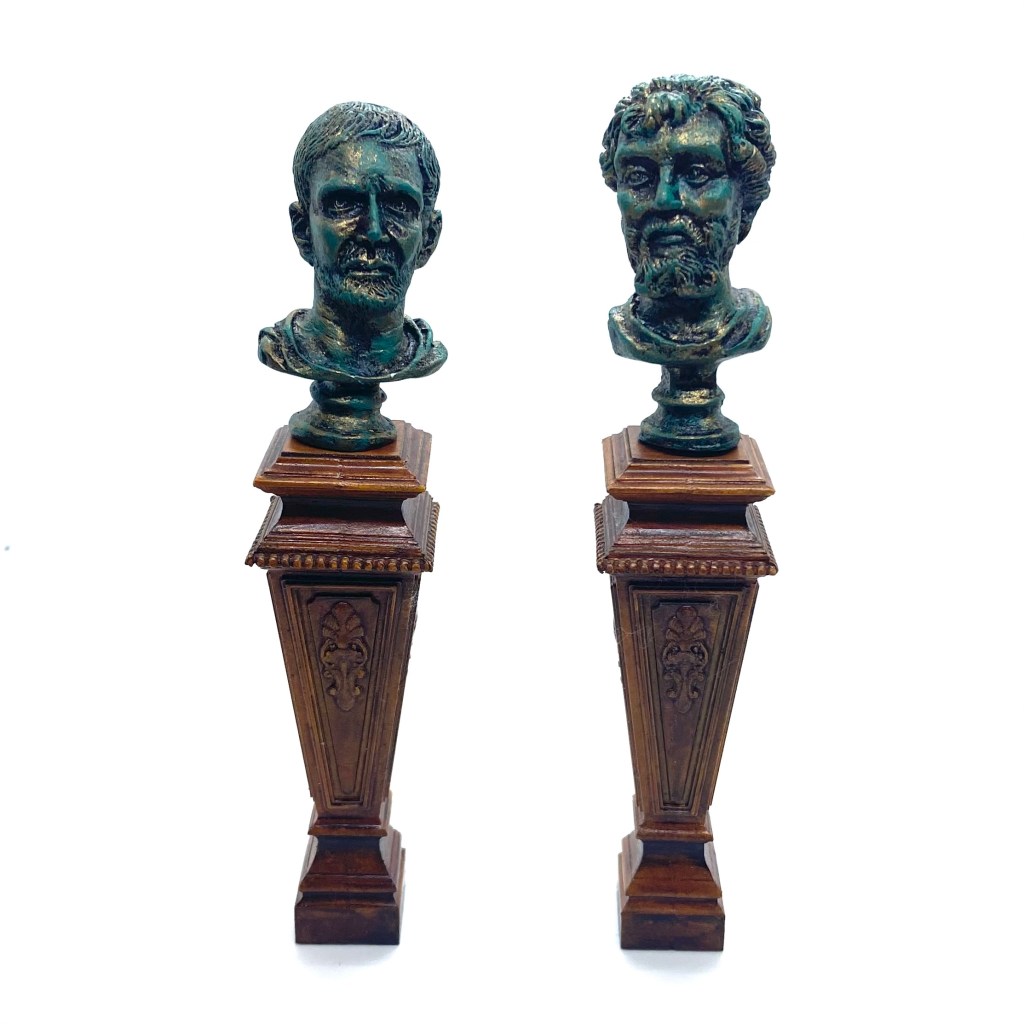 Below, the two pedestals shown with Roman-style bronze busts by Town Square Miniatures.