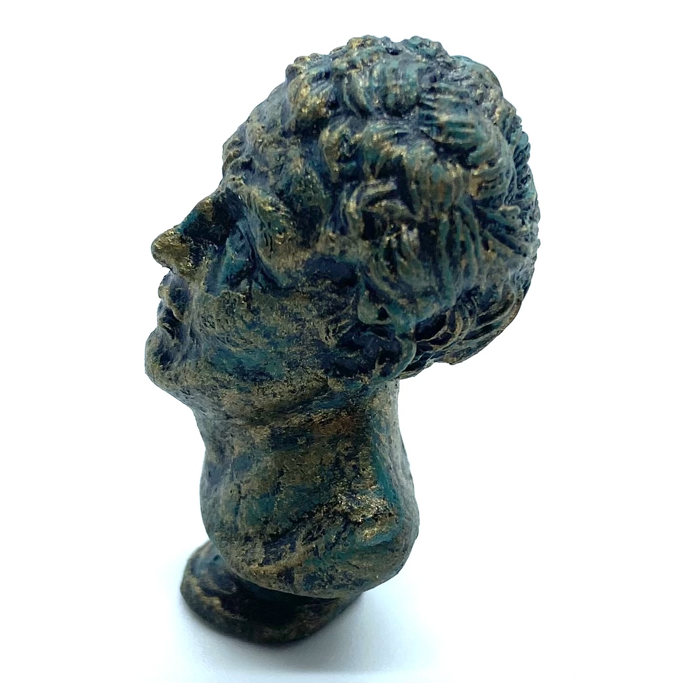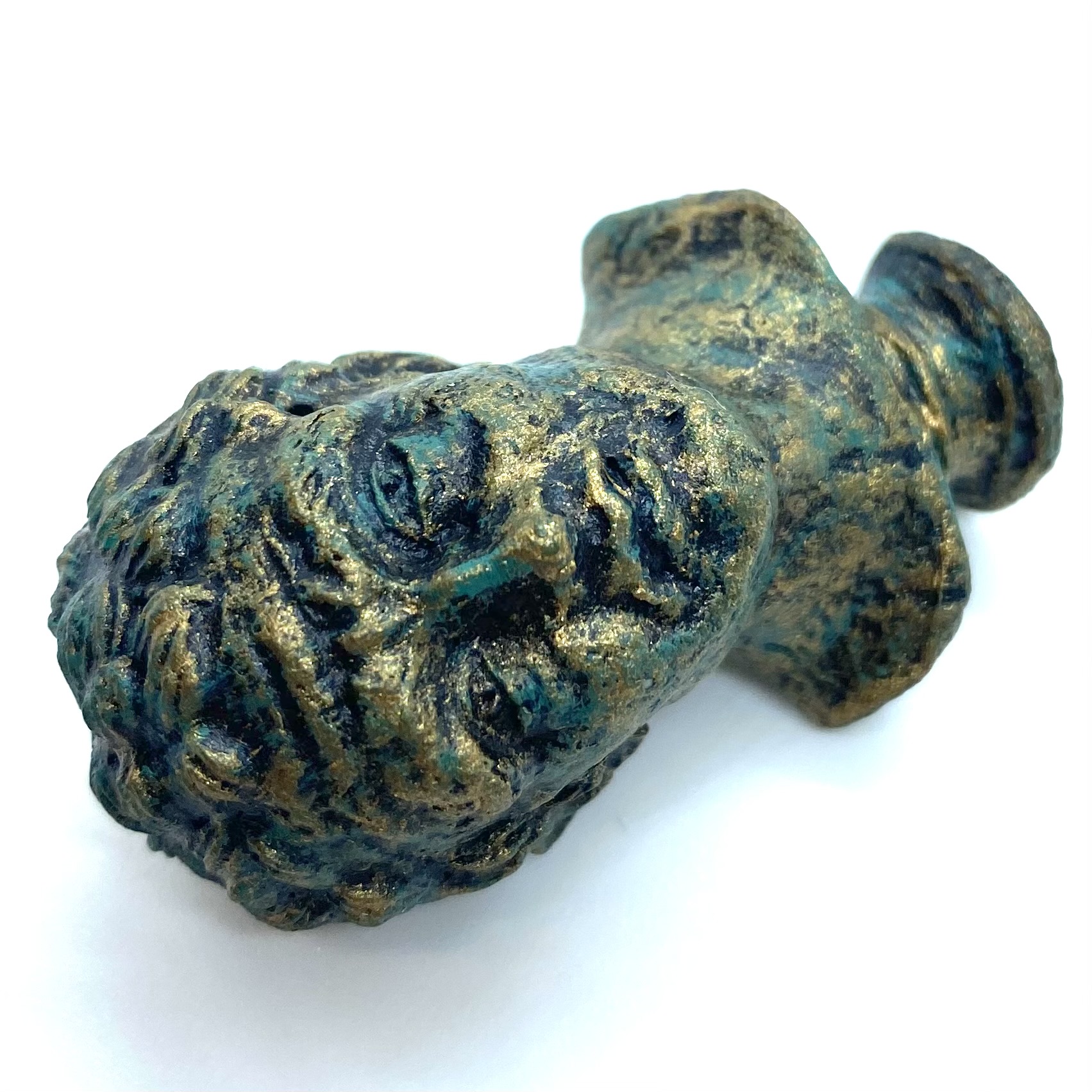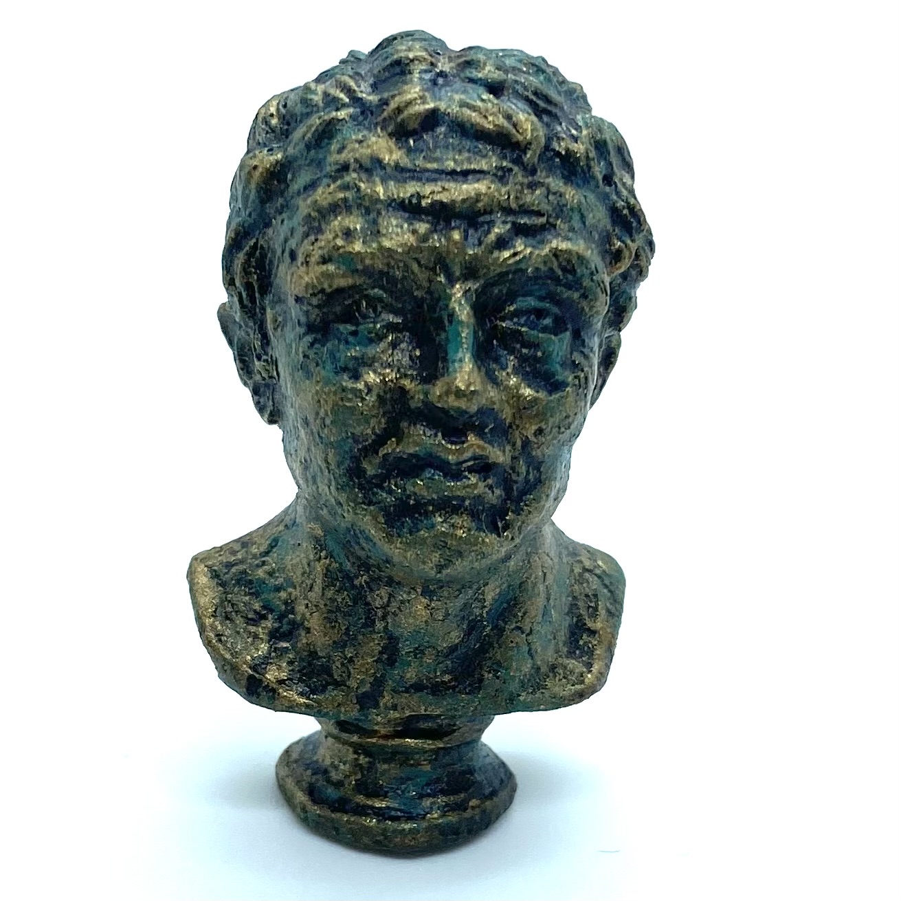 This bust is based – somewhat loosely, I must admit – on the head of a man dating from around 100BC, which was found on the island of Delos in 1912 and now in the collection of The National Archaeological Museum in Athens. The original sculpture, which is a rare piece of surviving Greek bronze, is spectacular on account of its inlaid stone and glass eyes. None of that in the replica, of course, but it captures the man’s solidity and almost pugnacious presence. Perhaps he was a boxer: the original head was found in the precinct of the palestra or sports ground on Delos. Despite that potentially sporty background, however, our man is destined to a more bookish future, as he takes his place alongside his companions in the Library.