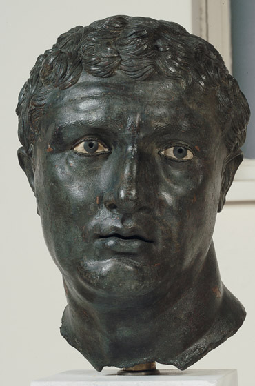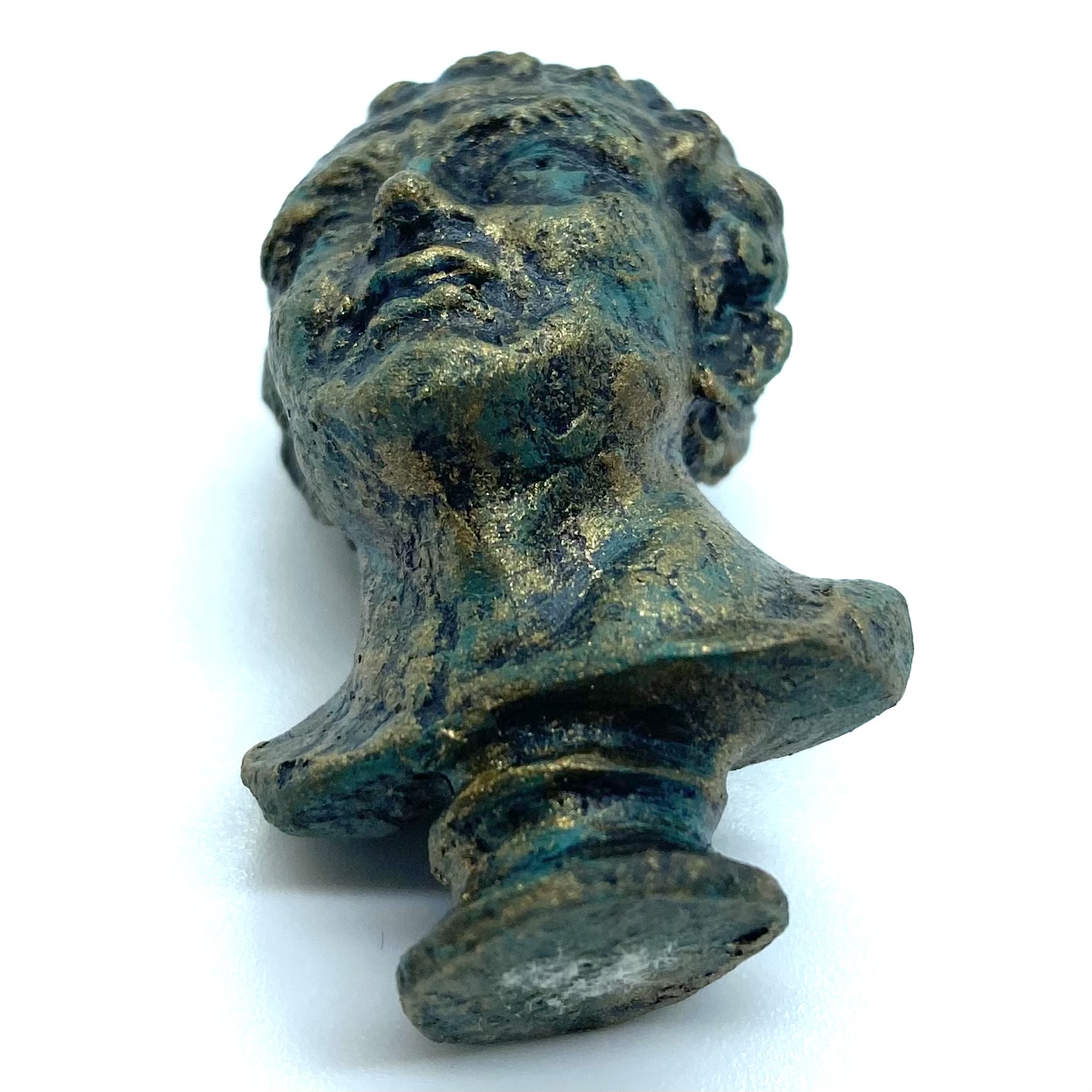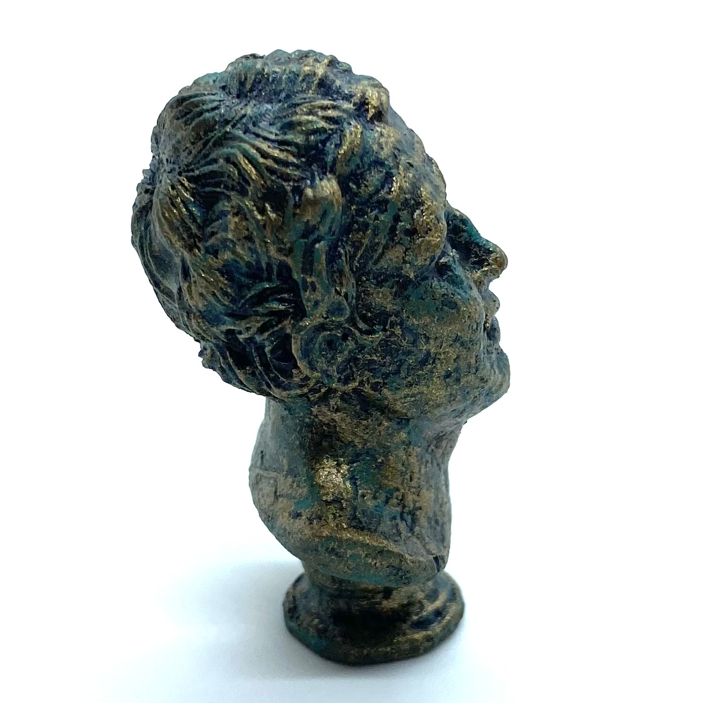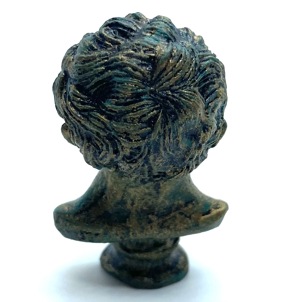 This bust is based – somewhat loosely, I must admit – on the head of a man dating from around 100BC, which was found on the island of Delos in 1912 and now in the collection of The National Archaeological Museum in Athens. The original sculpture, which is a rare piece of surviving Greek bronze, is spectacular on account of its inlaid stone and glass eyes. None of that in the replica, of course, but it captures the man’s solidity and almost pugnacious presence. Perhaps he was a boxer: the original head was found in the precinct of the palestra or sports ground on Delos. Despite that potentially sporty background, however, our man is destined to a more bookish future, as he takes his place alongside his companions in the Library.