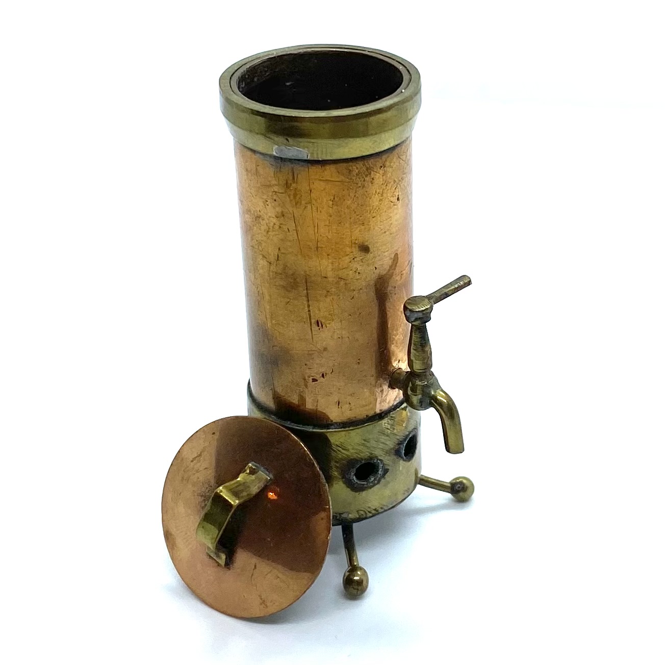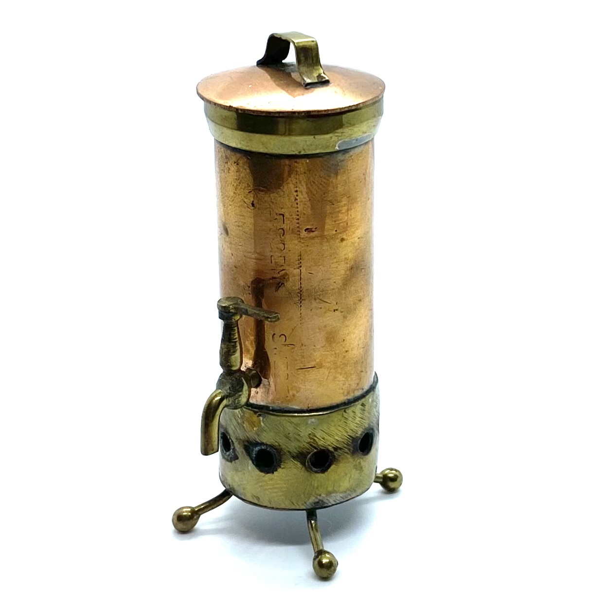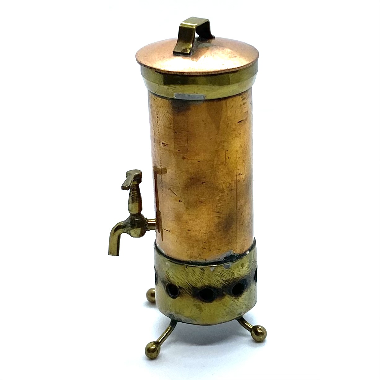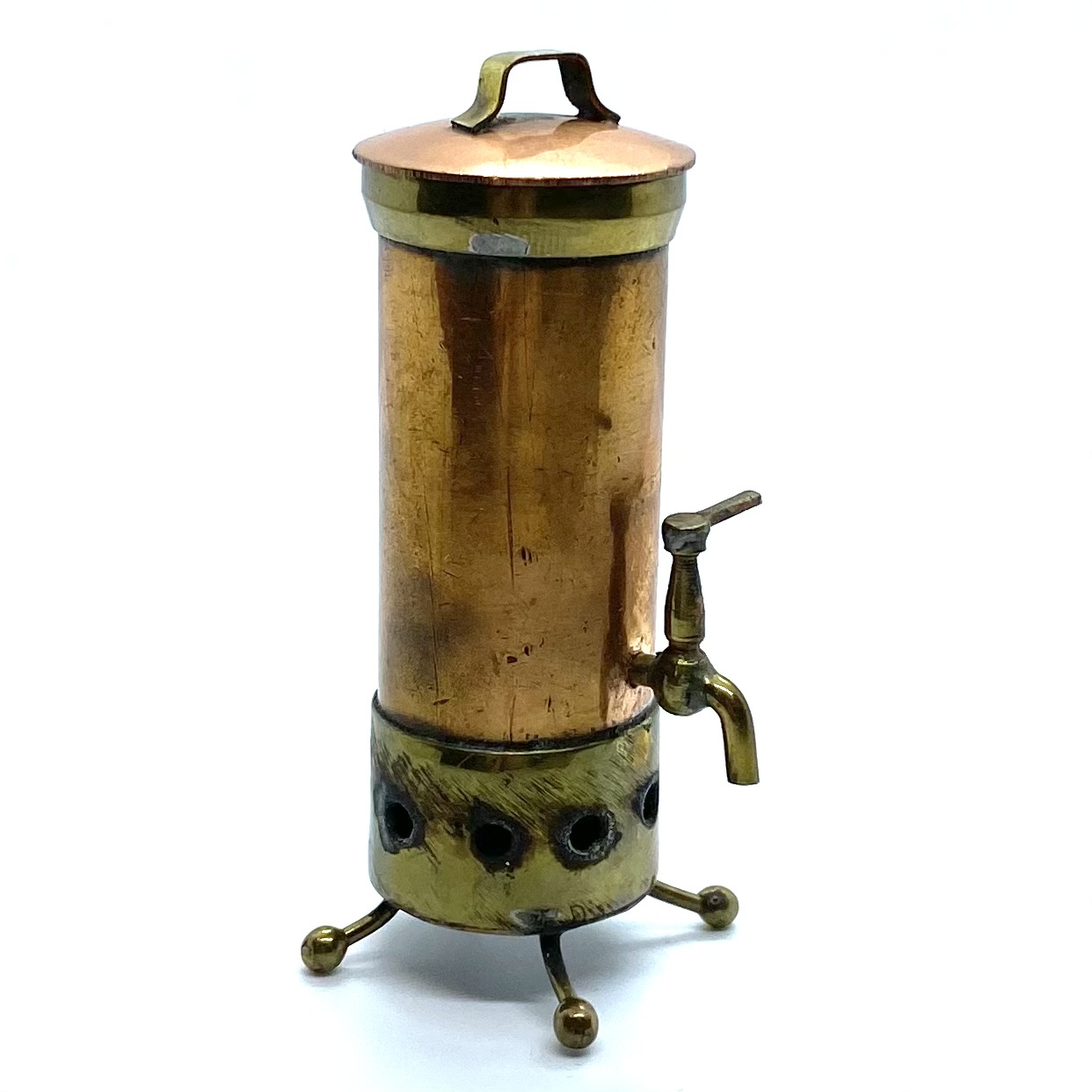 In a busy kitchen it helps to have plentiful hot water on hand and, in the Victorian period, it was wise to have a small boiler available so that tea and coffee could quickly be made, and washing-up water drawn off. This boiler would stand on a worktop in the corner of the kitchen. In the neighbouring laundry-room, where even more hot water was needed, we have a triple copper boiler, very similar to this, also made by Jeff Mewies.