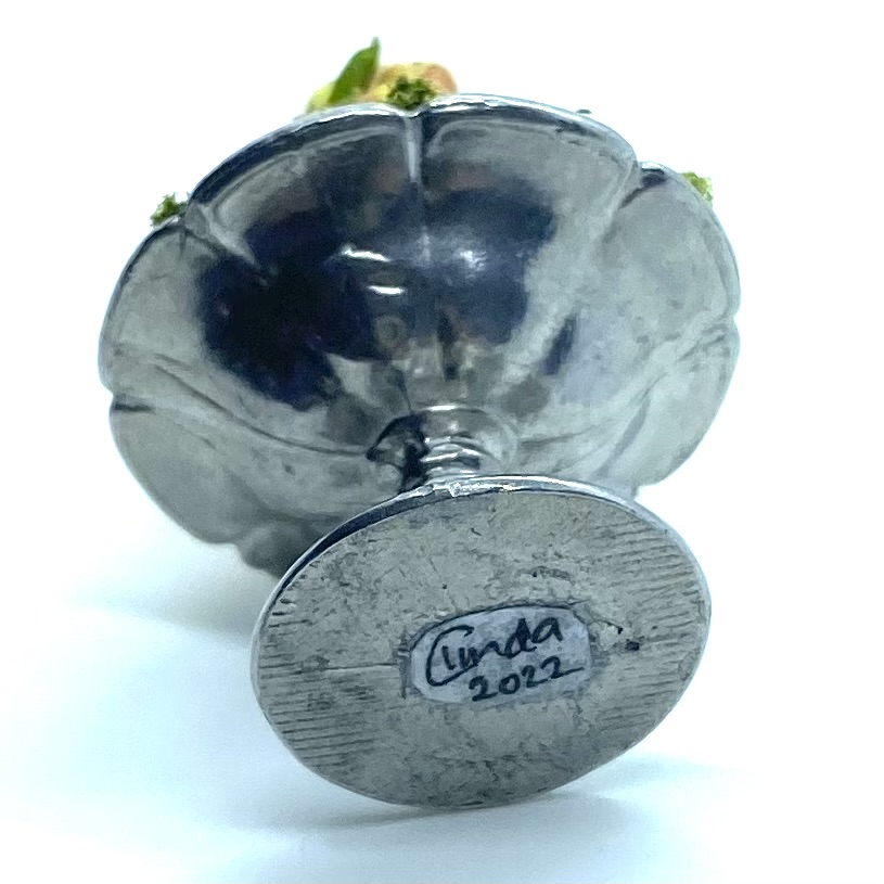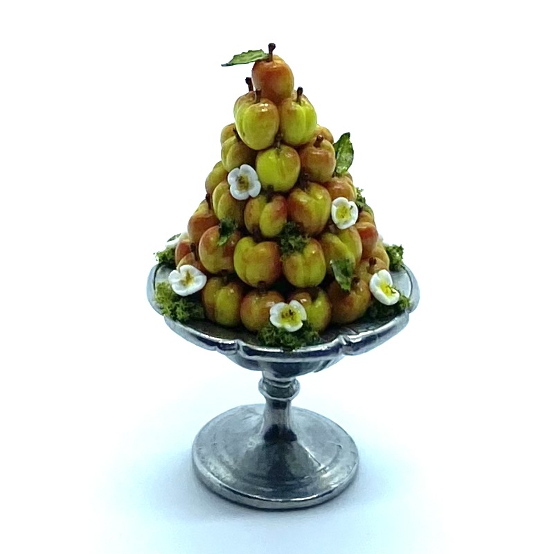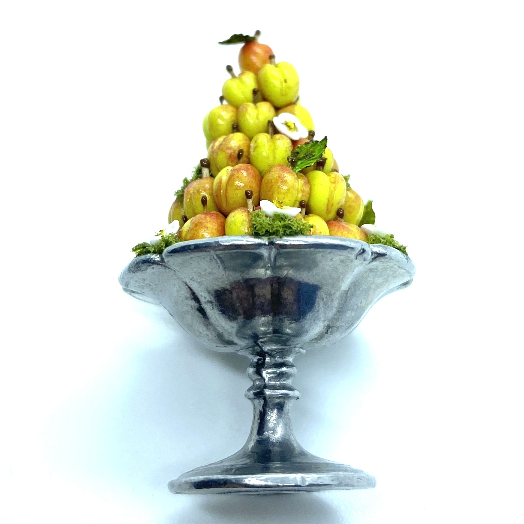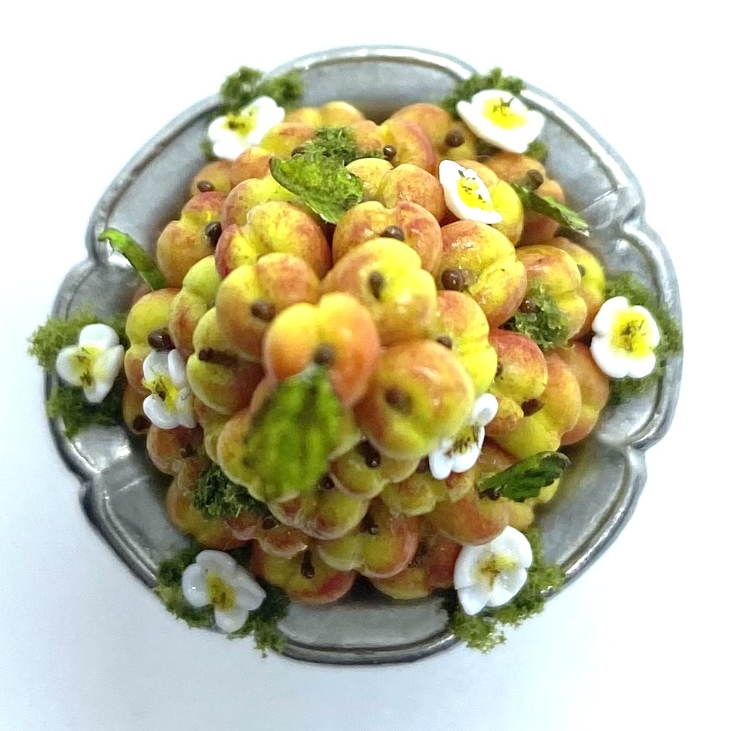 My study of dealers’ websites has taught me that IGMA Fellow Linda Cummings is one of the most gifted makers of miniature food. Unlike many of the artisans I’ve discovered, she is still going strong and has a shop on Etsy where she releases a limited number of items. I was absolutely thrilled to buy this pyramid of yellow plums, precariously displayed on a silver stand, which will offer a sumptuous piece of decoration for the dining room sideboard.