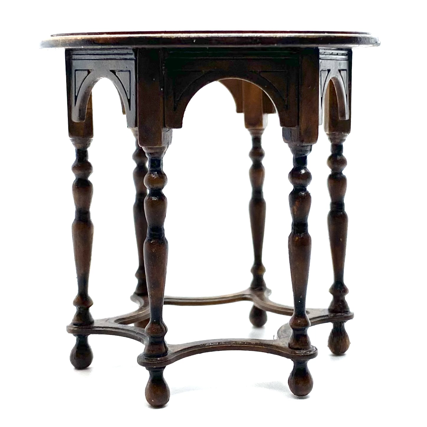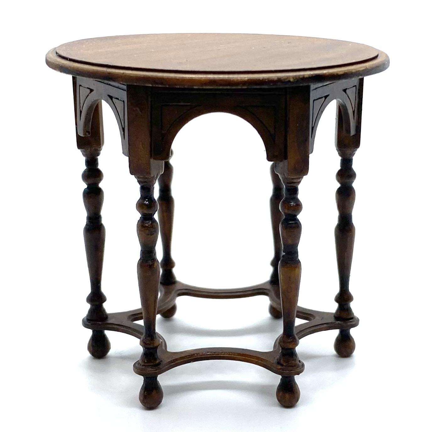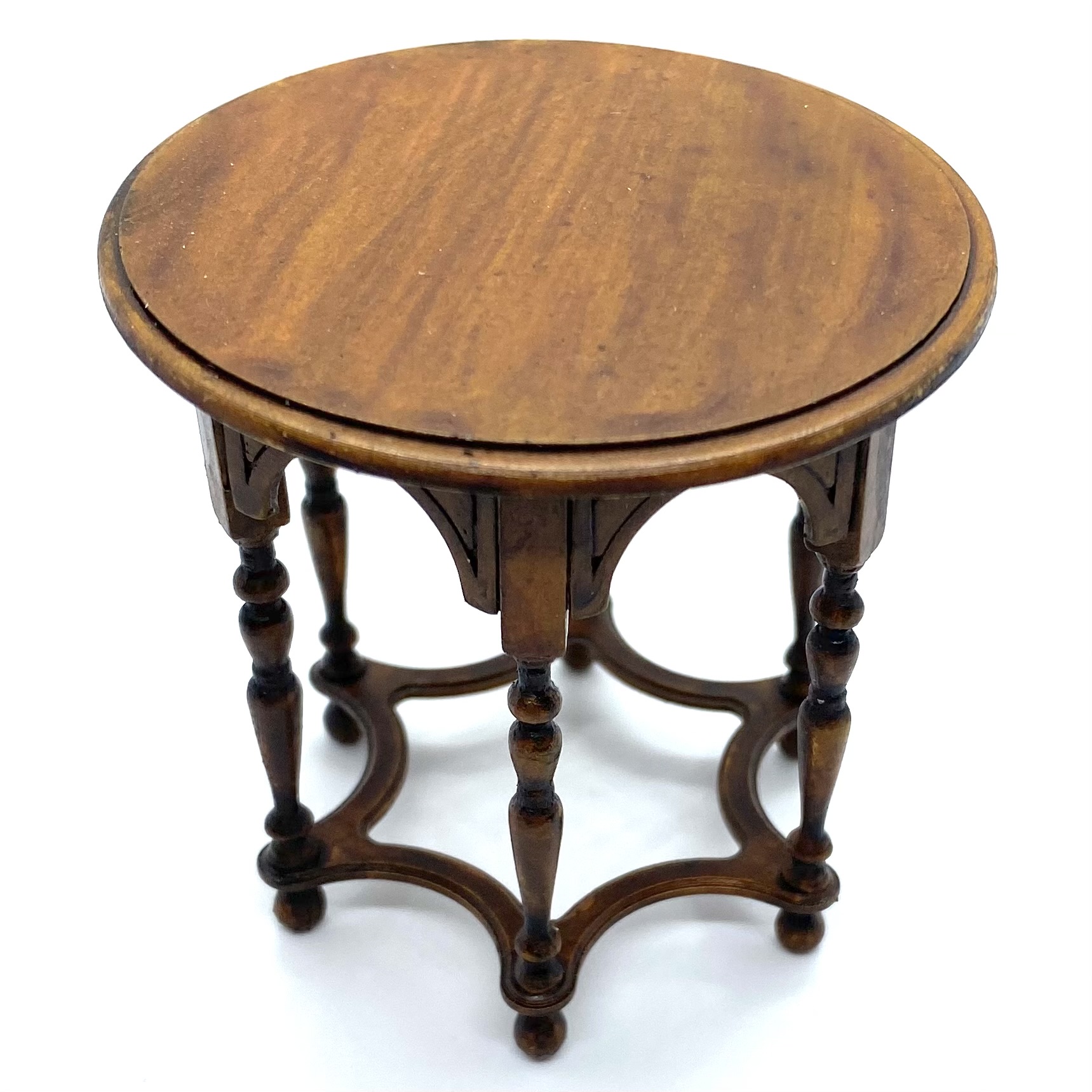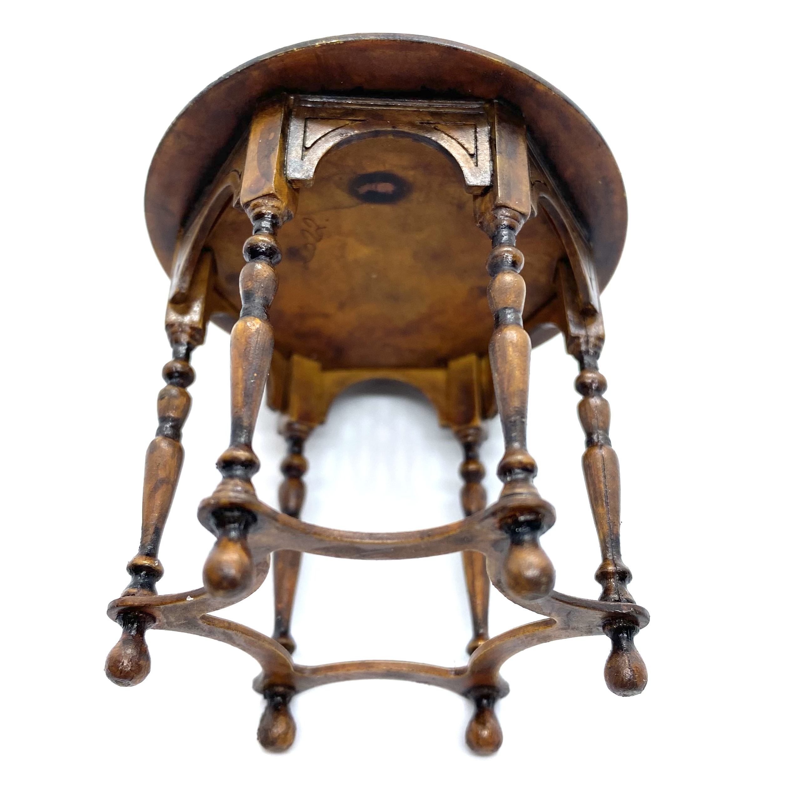 The wonderful Erzsébet Bodzas of Hungarian Miniatures has done it again. This exquisite table, with curved bands between the six finely turned legs, lives up to William Morris’s maxim of being both beautiful and useful. It will probably end up in the Parlour, perhaps covered with a lace tablecloth or Turkey carpet, almost certainly with a fern or flower arrangement on top. It’s signed and dated ‘Bodzas 2022’ on the underside of the top.