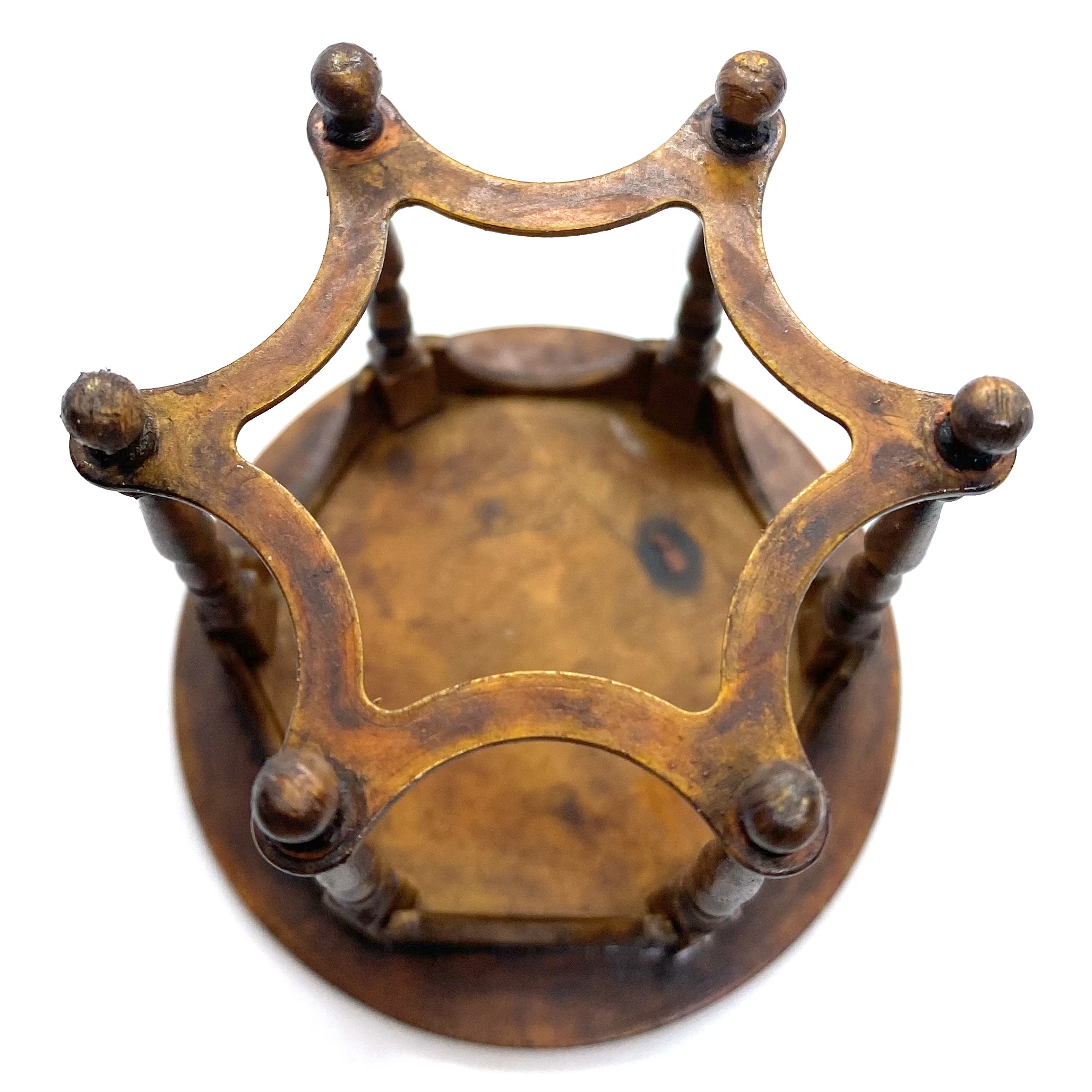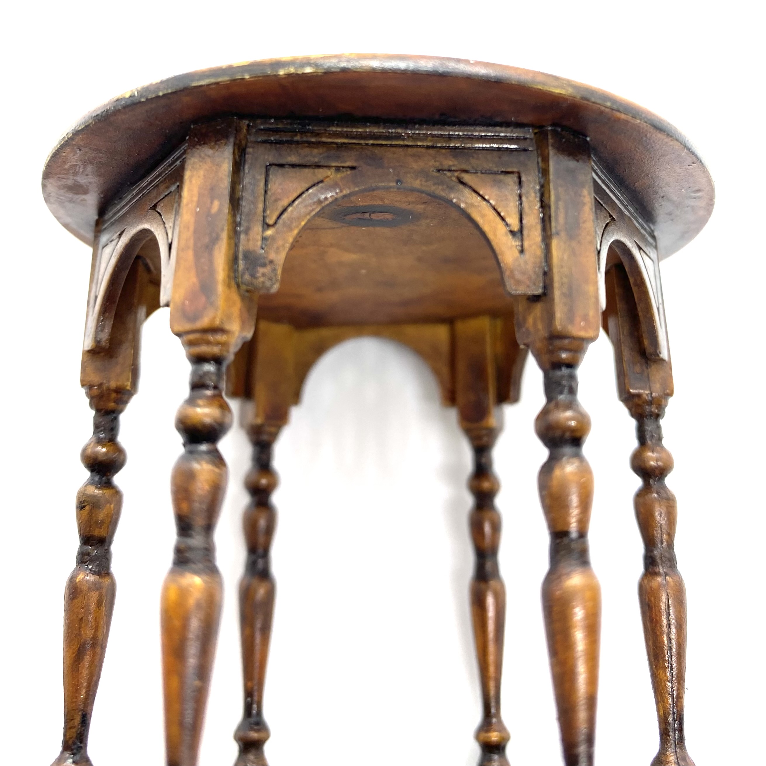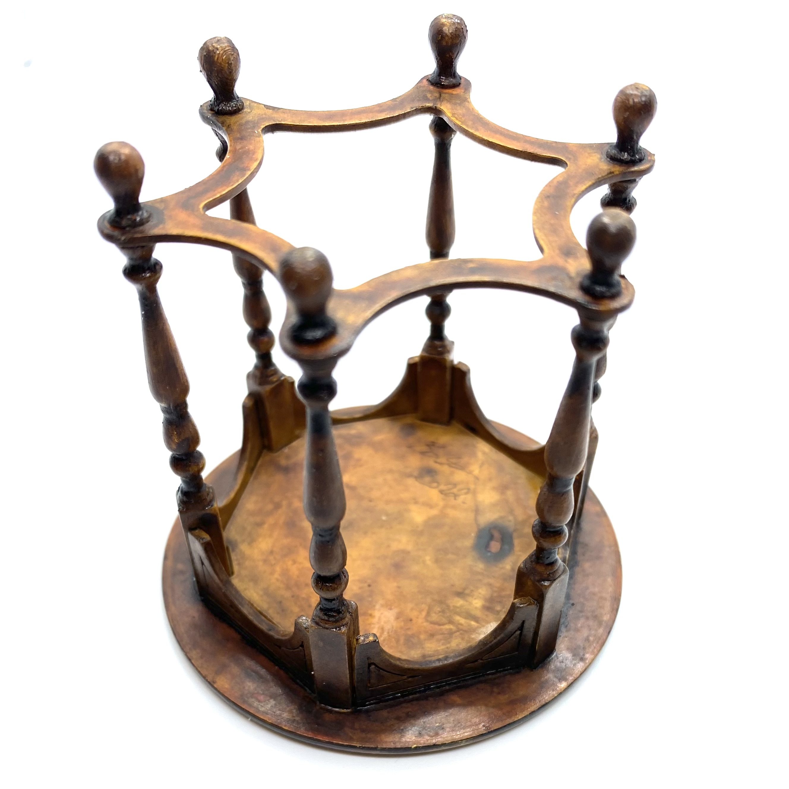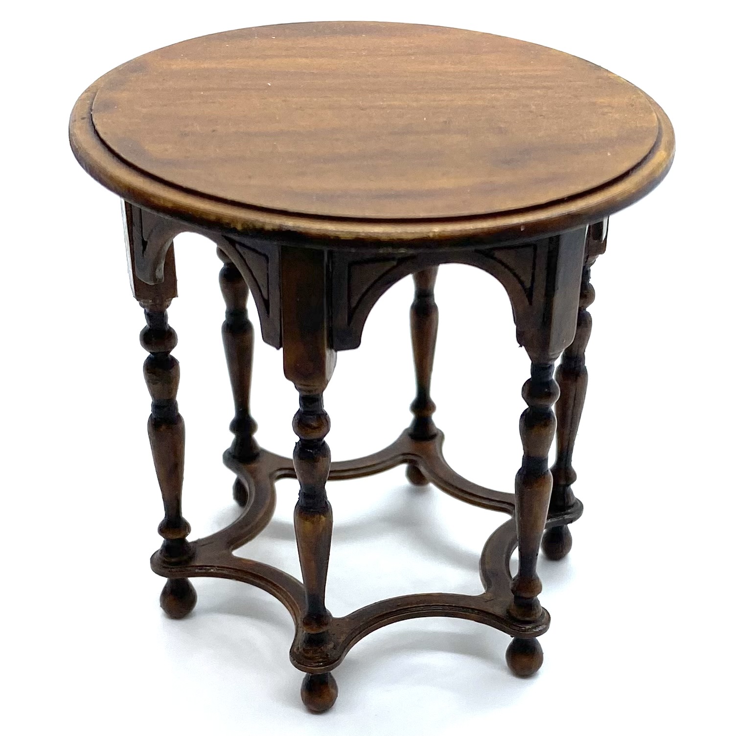 The wonderful Erzsébet Bodzas of Hungarian Miniatures has done it again. This exquisite table, with curved bands between the six finely turned legs, lives up to William Morris’s maxim of being both beautiful and useful. It will probably end up in the Parlour, perhaps covered with a lace tablecloth or Turkey carpet, almost certainly with a fern or flower arrangement on top. It’s signed and dated ‘Bodzas 2022’ on the underside of the top.