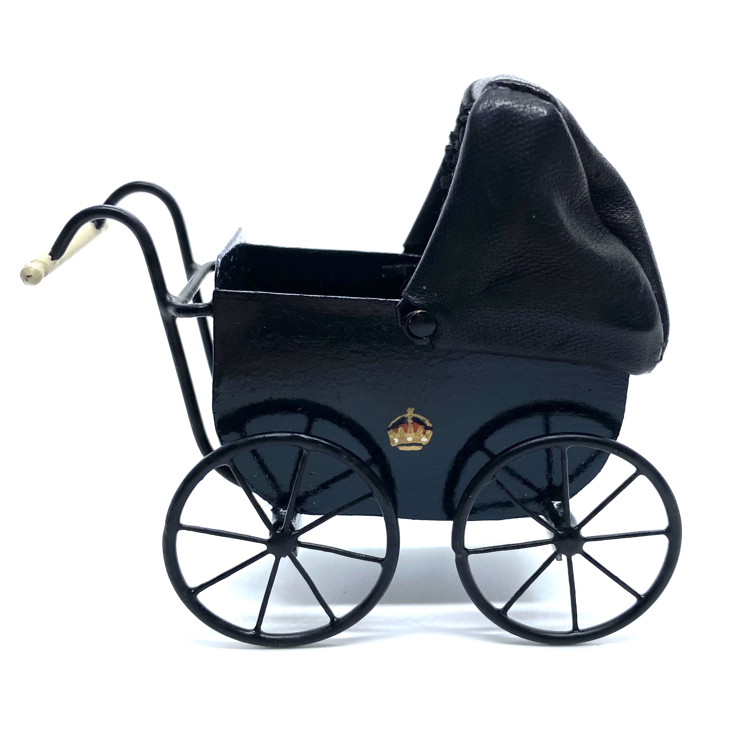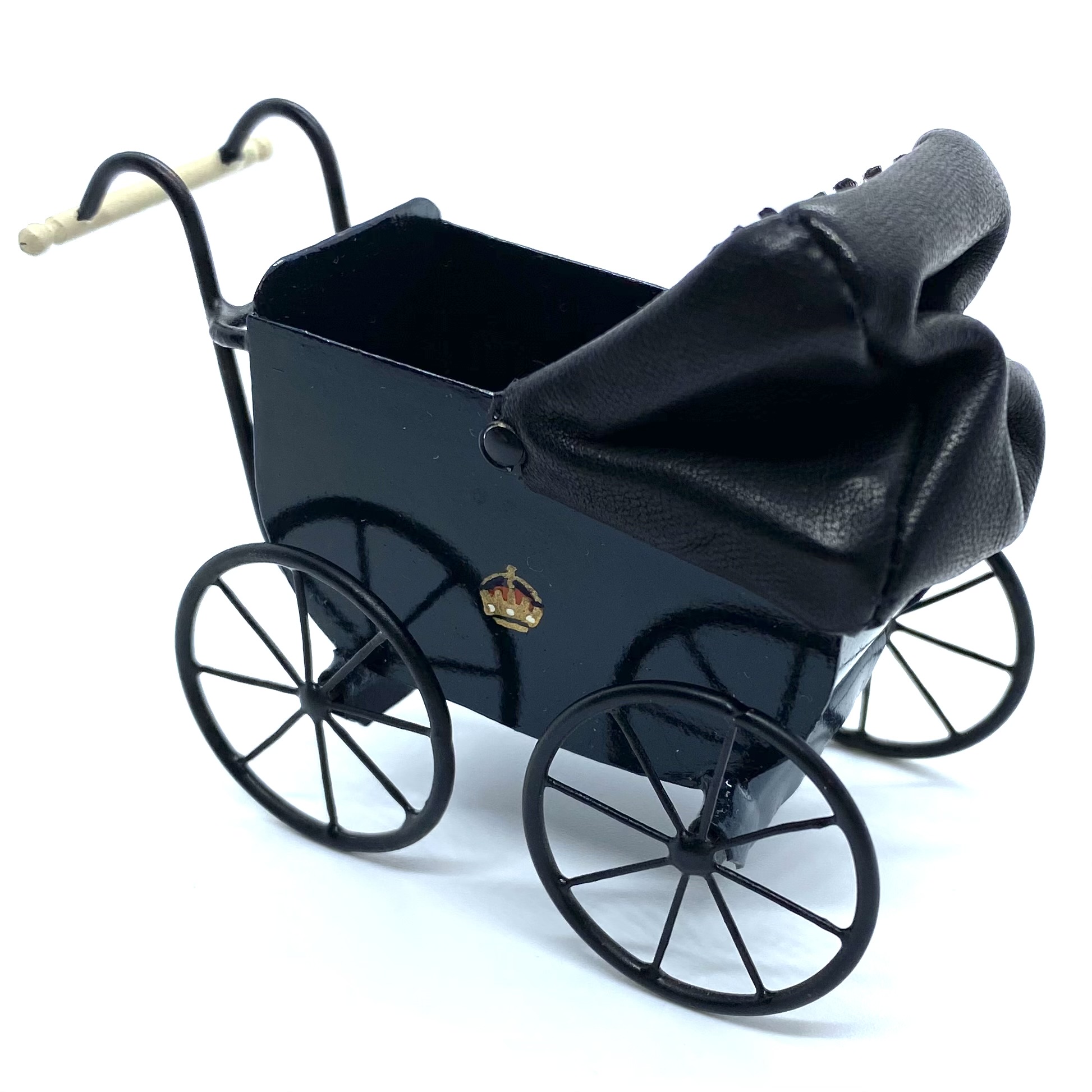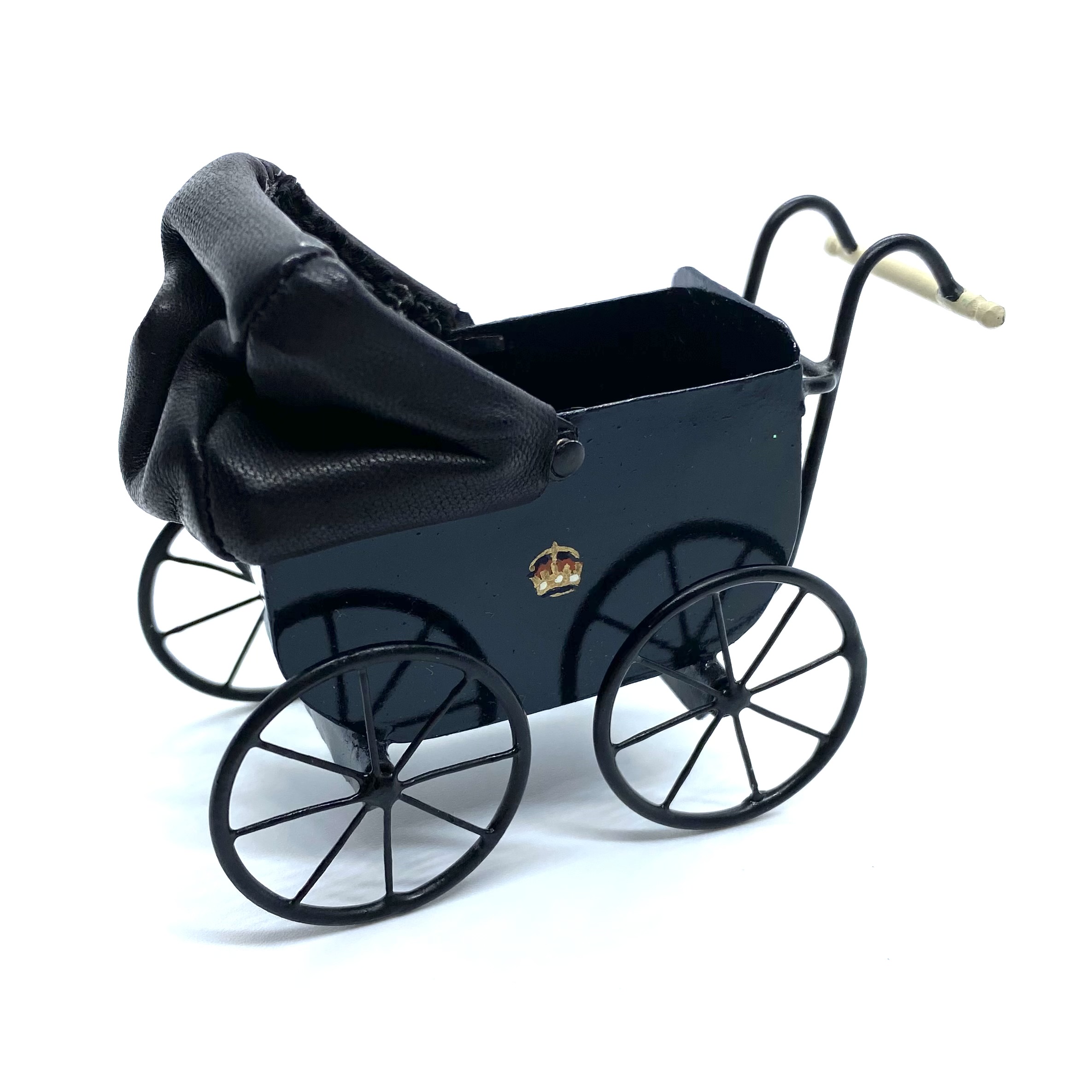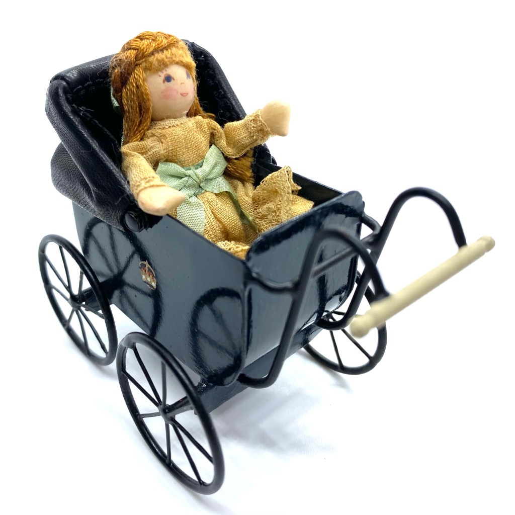 This grand baby carriage is one of the most cherished toys in the nursery, largely because it is so beautifully made, with the royal crest painted on the side. It has a leather hood which can be raised or lowered, a soft black leather cushion inside for comfort, and wheels which really turn. I couldn’t resist the chance to own a piece of work by Colin and Yvonne Roberson, and was thrilled to be able to buy this at auction on eBay.